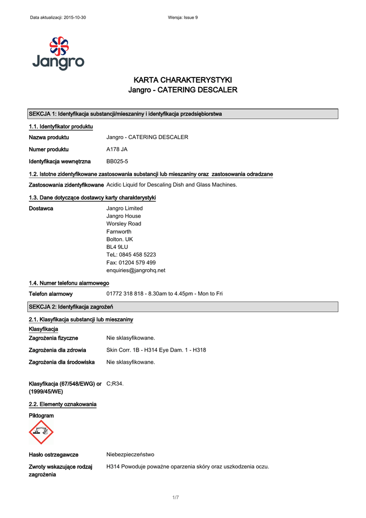 Data aktualizacji: 2015-10-30 Wersja: Issue 9 KARTA CHARAKTERYSTYKI Jangro - CATERING DESCALER SEKCJA 1: Identyfikacja substancji/mieszaniny i identyfikacja przedsiębiorstwa 1.1. Identyfikator produktu Nazwa produktu Jangro - CATERING DESCALER Numer produktu A178 JA Identyfikacja wewnętrzna BB025-5 1.2. Istotne zidentyfikowane zastosowania substancji lub mieszaniny oraz zastosowania odradzane Zastosowania zidentyfikowane Acidic Liquid for Descaling Dish and Glass Machines. 1.3. Dane dotyczące dostawcy karty charakterystyki Dostawca Jangro Limited Jangro House Worsley Road Farnworth Bolton. UK BL4 9LU TeL: 0845 458 5223 Fax: 01204 579 499 [email protected] 1.4. Numer telefonu alarmowego Telefon alarmowy 01772 318 818 - 8.30am to 4.45pm - Mon to Fri SEKCJA 2: Identyfikacja zagrożeń 2.1. Klasyfikacja substancji lub mieszaniny Klasyfikacja Zagrożenia fizyczne Nie sklasyfikowane. Zagrożenia dla zdrowia Skin Corr. 1B - H314 Eye Dam. 1 - H318 Zagrożenia dla środowiska Nie sklasyfikowane. Klasyfikacja (67/548/EWG) or C;R34. (1999/45/WE) 2.2. Elementy oznakowania Piktogram Hasło ostrzegawcze Niebezpieczeństwo Zwroty wskazujące rodzaj zagrożenia H314 Powoduje poważne oparzenia skóry oraz uszkodzenia oczu. 1/7 Data aktualizacji: 2015-10-30 Wersja: Issue 9 Jangro - CATERING DESCALER Zwroty wskazujące środki ostrożności P102 Chronić przed dziećmi. P260 Nie wdychać mgły. P280 Stosować rękawice ochronne/odzież ochronną/ochronę oczu/ochronę twarzy. P301+P330+P331 W PRZYPADKU POŁKNIĘCIA: wypłukać usta. NIE wywoływać wymiotów. P303+P361+P353 W PRZYPADKU KONTATKU ZE SKÓRĄ (lub z włosami): Natychmiast zdjąć całą zanieczyszczoną odzież. Spłukać skórę pod strumieniem wody/prysznicem. P304+P340 W PRZYPADKU DOSTANIA SIĘ DO DRÓG ODDECHOWYCH: wyprowadzić lub wynieść poszkodowanego na świeże powietrze i zapewnić mu warunki do swobodnego oddychania. P305+P351+P338 W PRZYPADKU DOSTANIA SIĘ DO OCZU: Ostrożnie płukać wodą przez kilka minut. Wyjąć soczewki kontaktowe, jeżeli są i można je łatwo usunąć. Nadal płukać. P315 Natychmiast zasięgnąć porady/zgłosić się pod opiekę lekarza. P501 Zawartość/pojemnik usuwać zgodnie z lokalnymi przepisami. Zawiera KWAS FOSFOROWY(V) ... % 2.3. Inne zagrożenia SEKCJA 3: Skład/informacja o składnikach 3.2. Mieszaniny KWAS FOSFOROWY(V) 30-60% Numer CAS: 7664-38-2 Numer WE: 231-633-2 Klasyfikacja Skin Corr. 1B - H314 Eye Dam. 1 - H318 Klasyfikacja (67/548/EWG) or (1999/45/WE) C;R34 Pełny tekst zwrotów wskazujących rodzaj zagrożenia (zwrotów R) i określeń zagrożeń jest przedstawiony w sekcji 16. SEKCJA 4: Środki pierwszej pomocy 4.1. Opis środków pierwszej pomocy Wdychanie Mało prawdopodobna droga narażenia, gdyż produkt nie zawiera substancji lotnych. Jeśli wchłonięto rozpyloną ciecz/mgły, należy wykonać następujące czynności. Przenieść poszkodowanego na świeże powietrze i zapewnić ciepło i odpoczynek w pozycji umożliwiającej oddychanie. Połknięcie Nie wywoływać wymiotów. Dokładnie wypłukać usta wodą. Podać duże ilości wody do picia. Natychmiast wezwać pomoc medyczną. Kontakt ze skórą Umyć dużą ilością wody. Natychmiast zasięgnąć porady medycznej jeśli objawy utrzymują się po umyciu. Kontakt z oczami Natychmiast spłukać dużą ilością wody. Usunąć szkła kontaktowe i otworzyć szeroko powieki. Kontynuować płukanie. Natychmiast wezwać pomoc medyczną. 4.2. Najważniejsze ostre i opóźnione objawy oraz skutki narażenia Informacje ogólne Nasilenie opisanych objawów będzie różnić się w zależności od stężenia i czasu narażenia. Wdychanie Podrażnienie nosa, gardła i dróg oddechowych. Połknięcie Może powodować oparzenia chemiczne jamy ustnej i gardła. Kontakt ze skórą Piekący ból i poważne poparzenia skóry. Może powodować poważne poparzenia chemiczne skóry. Kontakt z oczami Poważne podrażnienie, pieczenie i łzawienie. Długotrwały kontakt powoduje poważne uszkodzenie oczu i tkanek. 2/7 Data aktualizacji: 2015-10-30 Wersja: Issue 9 Jangro - CATERING DESCALER 4.3. Wskazania dotyczące wszelkiej natychmiastowej pomocy lekarskiej i szczególnego postępowania z poszkodowanym Wskazówki dla lekarza Leczyć objawowo. SEKCJA 5: Postępowanie w przypadku pożaru 5.1. Środki gaśnicze Odpowiednie środki gaśnicze Produkt nie jest łatwopalny. Używać środków gaśniczych odpowiednich dla palących się materiałów w najbliższym otoczeniu. 5.2. Szczególne zagrożenia związane z substancją lub mieszaniną Szczególne zagrożenia Produkty rozkładu termicznego lub spalania mogą zawierać następujące substancje: Drażniące gazy lub pary. 5.3. Informacje dla straży pożarnej Specjalny sprzęt ochronny dla Nosić aparat oddechowy z niezależnym dopływem powietrza i odpowiednie ubranie ochronne. strażaków SEKCJA 6: Postępowanie w przypadku niezamierzonego uwolnienia do środowiska 6.1. Indywidualne środki ostrożności, wyposażenie ochronne i procedury w sytuacjach awaryjnych Osobiste środki ostrożności Stosować odzież ochronną, rękawice ochronne oraz ochronę oczu i twarzy. Informacje dotyczące odpowiedniego sprzętu ochrony osobistej, patrz sekcja 8. 6.2. Środki ostrożności w zakresie ochrony środowiska Środki ostrożności w zakresie Wycieki i niekontrolowane zrzuty do cieków wodnych muszą być niezwłocznie zgłaszane ochrony środowiska organom ochrony środowiska lub innym odpowiednim organom. 6.3. Metody i materiały zapobiegające rozprzestrzenianiu się skażenia i służące do usuwania skażenia Metody usuwania skażenia Małe ilości: Wyciek spłukać dużą ilością wody. Duże ilości: Zaabsorbować wyciek piaskiem, ziemią lub innym niepalnym materiałem. Zebrać i umieścić w odpowiednich pojemnikach na odpady i szczelnie zamknąć. 6.4. Odniesienia do innych sekcji Odniesienia do innych sekcji Informacje dotyczące odpowiedniego sprzętu ochrony osobistej, patrz sekcja 