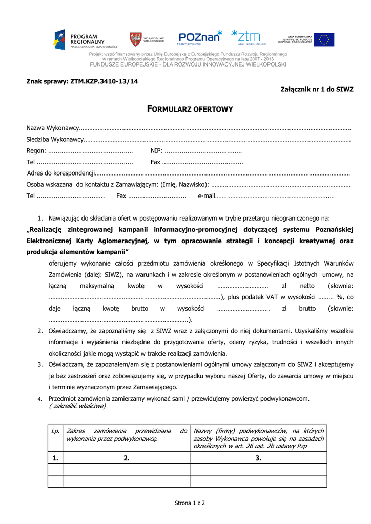 Znak sprawy: ZTM.KZP.3410-13/14 Załącznik nr 1 do SIWZ FORMULARZ OFERTOWY Nazwa Wykonawcy…………………………………………………………………………………….……………………………………………………… Siedziba Wykonawcy.…………………………………………………………………………..……………………………………………………………. Regon: ............................................. NIP: ......................................... Tel ................................................... Fax ........................................... Adres do korespondencji…………………………………………………………………………………………….…………………..………………… Osoba wskazana do kontaktu z Zamawiającym: (Imię, Nazwisko): …………………………….………………………………………… Tel .................................... Fax ............................... e-mail……………………….……………………….………..… 1. Nawiązując do składania ofert w postępowaniu realizowanym w trybie przetargu nieograniczonego na: „Realizację zintegrowanej kampanii informacyjno-promocyjnej dotyczącej systemu Poznańskiej Elektronicznej Karty Aglomeracyjnej, w tym opracowanie strategii i koncepcji kreatywnej oraz produkcja elementów kampanii” oferujemy wykonanie całości przedmiotu zamówienia określonego w Specyfikacji Istotnych Warunków Zamówienia (dalej: SIWZ), na warunkach i w zakresie określonym w postanowieniach ogólnych umowy, na łączną maksymalną kwotę w wysokości ………………………… zł netto (słownie: ………………………………………………………………………………………..), plus podatek VAT w wysokości ……… %, co daje łączną kwotę brutto w wysokości …………………………. zł brutto (słownie: ……………………………………………………………………….). 2. Oświadczamy, że zapoznaliśmy się z SIWZ wraz z załączonymi do niej dokumentami. Uzyskaliśmy wszelkie informacje i wyjaśnienia niezbędne do przygotowania oferty, oceny ryzyka, trudności i wszelkich innych okoliczności jakie mogą wystąpić w trakcie realizacji zamówienia. 3. Oświadczam, że zapoznałem/am się z postanowieniami ogólnymi umowy załączonym do SIWZ i akceptujemy je bez zastrzeżeń oraz zobowiązujemy się, w przypadku wyboru naszej Oferty, do zawarcia umowy w miejscu i terminie wyznaczonym przez Zamawiającego. 4. Przedmiot zamówienia zamierzamy wykonać sami / przewidujemy powierzyć podwykonawcom. ( zakreślić właściwe) Lp. 1. Zakres zamówienia przewidziana wykonania przez podwykonawcę. do Nazwy (firmy) podwykonawców, na których zasoby Wykonawca powołuje się na zasadach określonych w art. 26 ust. 2b ustawy Pzp 2. 3. Strona 1 z 2 Znak sprawy: ZTM.KZP.3410-13/14 Załącznik nr 1 do SIWZ UWAGA: Zamawiający żąda, aby w przypadku podwykonawstwa, na które zasoby Wykonawca powołuje się na zasadach określonych w art. 26 ust. 2b ustawy Pzp, Wykonawca zobowiązany jest do wypełnienia wszystkich kolumn, tj. 1,2 i 3 powyższej tabeli. Natomiast w przypadku powierzenia podwykonawstwa, ale nie powoływania się na zasadach określonych w art. 26 ust. 2b. Wykonawca zobowiązany jest do wypełnienia tylko kolumny nr 1 i 2 powyższej tabeli. 5. Oświadczamy, że oferta jest dla nas wiążąca przez okres 30 dni od daty ustalonej na złożenie oferty. 6. Oświadczamy, że Formularz ofertowy oraz wszelkie załączniki do oferty są jawne i nie zawierają informacji stanowiącej tajemnicę przedsiębiorstwa w rozumieniu przepisów o zwalczaniu nieuczciwej konkurencji, za wyjątkiem informacji i dokumentów zawartych na stronach od ……………… do ………………. UWAGA: Wykonawca w przypadku zastrzeżenia informacji stanowiącej tajemnicę przedsiębiorstwa zobowiązany jest do zastosowania zapisów zawartych w Rozdziale 10 punkcie 10.1.8. SIWZ. ................................, dn. …..…….......... ......................................................................... Podpis upoważnionego przedstawiciela Wykonawcy Strona 2 z 2