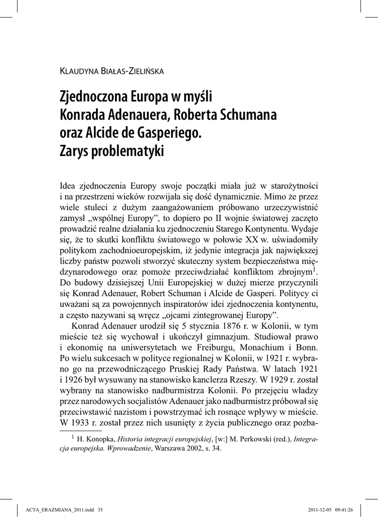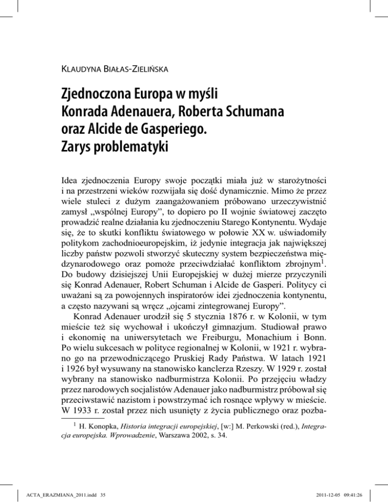 KLAUDYNA BIAŁAS-ZIELIŃSKA Zjednoczona Europa w myśli Konrada Adenauera, Roberta Schumana oraz Alcide de Gasperiego. Zarys problematyki Idea zjednoczenia Europy swoje początki miała już w starożytności i na przestrzeni wieków rozwijała się dość dynamicznie. Mimo że przez wiele stuleci z dużym zaangażowaniem próbowano urzeczywistnić zamysł „wspólnej Europy”, to dopiero po II wojnie światowej zaczęto prowadzić realne działania ku zjednoczeniu Starego Kontynentu. Wydaje się, że to skutki konfliktu światowego w połowie XX w. uświadomiły politykom zachodnioeuropejskim, iż jedynie integracja jak największej liczby państw pozwoli stworzyć skuteczny system bezpieczeństwa międzynarodowego oraz pomoże przeciwdziałać konfliktom zbrojnym1. Do budowy dzisiejszej Unii Europejskiej w dużej mierze przyczynili się Konrad Adenauer, Robert Schuman i Alcide de Gasperi. Politycy ci uważani są za powojennych inspiratorów idei zjednoczenia kontynentu, a często nazywani są wręcz „ojcami zintegrowanej Europy”. Konrad Adenauer urodził się 5 stycznia 1876 r. w Kolonii, w tym mieście też się wychował i ukończył gimnazjum. Studiował prawo i ekonomię na uniwersytetach we Freiburgu, Monachium i Bonn. Po wielu sukcesach w polityce regionalnej w Kolonii, w 1921 r. wybrano go na przewodniczącego Pruskiej Rady Państwa. W latach 1921 i 1926 był wysuwany na stanowisko kanclerza Rzeszy. W 1929 r. został wybrany na stanowisko nadburmistrza Kolonii. Po przejęciu władzy przez narodowych socjalistów Adenauer jako nadburmistrz próbował się przeciwstawić nazistom i powstrzymać ich rosnące wpływy w mieście. W 1933 r. został przez nich usunięty z życia publicznego oraz pozba1 H. Konopka, Historia integracji europejskiej, [w:] M. Perkowski (red.), Integracja europejska. Wprowadzenie, Warszawa 2002, s. 34. ACTA_ERAZMIANA_2011.indd 35 2011-12-05 09:41:26 36 Klaudyna Białas-Zielińska wiony majątku. Już po wojnie w 1946 r. wybrano go na przewodniczącego CDU. Jako przewodniczący Rady Parlamentarnej (1948–1949) wywarł duży wpływ na ostateczny kształt ogłoszonej 23 maja 1949 r. Ustawy Zasadniczej RFN. Po zwycięstwie CDU/CSU w pierwszych wyborach do Bundestagu i zawarciu koalicji z FDP i DP został wybrany kanclerzem RFN. Urząd ten sprawował nieprzerwanie do 1963 r., a w latach 1951–1955 był równocześnie ministrem spraw zagranicznych. Adenauer konsekwentnie realizował koncepcję „społecznej gospodarki rynkowej”, której autorem był minister finansów Ludwig Wilhelm Erhard. Za jego rządów RFN nie tylko dźwignęła się z ruin, ale także stosunkowo szybko osiągnęła wysoki poziom życia („adenauerowski cud gospodarczy”). Zaowocowało to stabilizacją wewnętrzną i rosnącym poparciem społecznym. Polityk zrezygnował z władzy 15 października 1963 r.. Dymisja nie oznaczała jednak wycofania się z życia politycznego. W 1965 r. ponownie został wybrany deputowanym do Bundestagu piątej kadencji. Pod koniec swego życia Adenauer przystąpił do spisywania swych wspomnień (cztery tomy ukazały się w latach 1965–1968). Zmarł 19 kwietnia 1967 r.2 Niemiecki polityk z takim samym zaangażowaniem zajmował się sprawami wewnętrznymi swojego kraju3, jak kwestią zjednoczenia kontynentu. Patrząc na sytuacje Niemiec doszedł do wniosku, że europejska integracja to jedyna droga do odbudowy państwa. Stał na stanowisku, że tylko w ten sposób, a nie jak dawniej sięgając po argumenty siłowe, uda się Niemcom ponownie zostać podmiotem stosunków międzynarodowych. Był zdania, że szanując interesy swoich sąsiadów, 2 K. Ruchniewicz, Konrad Adenauer, http://www.kas.de/polen/pl/pages/3420 (odczyt: 23 VI 2011 r.). 3 Adenauer zmierzał w polityce wewnętrznej do utrwalenia społecznej gospodarki rynkowej oraz rozwiązania skomplikowanych problemów społecznych, w tym głównie ograniczenie bezrobocia, wsparcie budownictwa mieszkaniowego i rolnictwa oraz integracji dużej liczby uchodźców i wypędzonych, jak również inwalidów wojennych w społeczeństwie zachodnioniemieckim, zob. E. Cziomer, Zarys historii Niemiec powojennych 1945–1995, Warszawa–Kraków 1997, s. 84; zob. też C. Williams, Adenauer: The Father of the New Germany, New York 2000; T. Risse, A. Engelmann-Martin, Identity Politics and European Integration: The Case of Germany, [w:] A. Pagden (ed.), The Idea of Europe: From Antiquity to the European Union, Cambridge 2002, s. 294–296. ACTA_ERAZMIANA_2011.indd 36 2011-12-05 09:41:26 Zjednoczona Europa w myśli 37 Niemcy będą miały swobodę działania w sprawach zagranicznych. Oznaczało to praktycznie zerwanie z myśleniem w kategoriach państwa narodowego4. Kanclerz twierdził wręcz, że ujęcie państwa, jakie istniało w XIX i na początku XX w., jest nie do przyjęcia. Taka wizja państwa zrodziła nacjonalizm, wywierający zgubny wpływ na europejskie życie i może on zaniknąć tylko w warunkach zjednoczenia kontynentu5. Adenauer uważał, że droga do odzyskania suwerenności Niemiec musi przebiegać stopniowo. Zakładał, że należy przyjąć odrodzenie niemieckiej państwowości, zerwać z polityką balansowania między Wschodem a Zachodem i związać nowe państwo z Europą Zachodnią. Był zdania, że nawet ograniczenia państwa zachodnioniemieckiego będą pokonywane w miarę rozwoju jego współpracy z innymi krajami w ramach struktur europejskich6. Kanclerz postawił więc otwarcie na politykę tzw. Westbindung7. Według Adenauera podziały Niemiec i Europy były spowodowane przez narastające sprzeczności między supermocarstwami. Powstanie RFN, a potem NRD spowodowało rozłam kontynentu na dwa zwalczające się bloki: zachodni na czele ze Stanami Zjednoczonymi i wschodni na czele z ZSRR. Adenauer obawiając się ZSRR, które jego zdaniem używało „polityki siły”, chciał zbudować silny blok zachodni8. Według 4 S. Sulowski, Polityka europejska Republiki Federalnej Niemiec, Wa