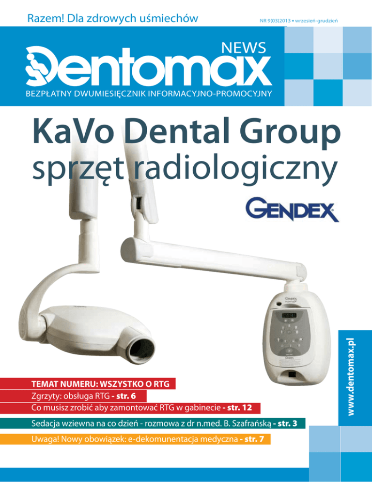 Razem! Dla zdrowych uśmiechów NR 9(03)2013 l wrzesień-grudzień BEZPŁATNY DWUMIESIĘCZNIK INFORMACYJNO-PROMOCYJNY TEMAT NUMERU: WSZYSTKO O RTG Zgrzyty: obsługa RTG - str. 6 Co musisz zrobić aby zamontować RTG w gabinecie - str. 12 Sedacja wziewna na co dzień - rozmowa z dr n.med. B. Szafrańską - str. 3 Uwaga! Nowy obowiązek: e-dekomunentacja medyczna - str. 7 www.dentomax.pl KaVo Dental Group sprzęt radiologiczny 3 Halo! Co w branży? - przegląd wydarzeń z rynku 5 Zgrzyty - obsługa RTG i radiowizjografii 6 Okiem prawnika - e-dokumentacja medyczna 7 Badamy trendy - Kavo Estetica E30 Evolution 8 Szkolenia - terminarz szkoleń w Dentomax Szkolenia 10 Porady - Sprawdź, co trzeba zrobić aby zamontować RTG 12 14 - Zapraszamy na zakupy - oferty promocyjne 14 Janusz Mroczkowski Redaktor naczelny Dentowywiad - rozmowa z dr n.med. Barbarą Szafrańską nt sedacji wziewnej Kazimierz Klimczuk właściciel DENTOMAX sp. k. w numerze: Witamy jesienią! Poprzednie wydanie Dentomax News oddaliśmy w Państwa ręce grubo ponad trzy miesiące temu, a zatem przed wakacjami. Jeszcze na dobre nie zdążyliśmy nacieszyć się promieniowaniem UV, a tu już musimy powoli „przepraszać” się z płaszczami, parasolami i innymi niezbyt miłymi atrybutami jesieni. Ale jesień ma jeden – dodajmy od lat niezmienny - wyraźny jasny punkt. To poznańskie targi CeDe. W tym roku, organizatorzy nieco przyspieszyli, bo najważniejsze spotkanie dento-branży tym razem odbędzie się w pierwszej połowie miesiąca. Naszą obecność na targach postanowiliśmy zaznaczyć nieco inaczej niż zwykle. Zrezygnowaliśmy z tradycyjnego stoiska prezentacyjnego. Ale nie oznacza to wszakże, że nas na CeDe zabraknie! O co to nie! Z przyjemnością spieszymy donieść, że zamiast tradycyjnej wystawy zaproponujemy nieco inną formułę spotkania z naszą firmą, ofertą i marką. Wydawca: Dentomax Klimczuk i Wspólnicy sp. k. Adres wydawcy: ul. Nowowarszawska 32/2, 15-206 Białystok tel. 85 740 36 90–95, fax. 85 740 36 98 email: [email protected] www.dentomax.pl Redaktor naczelny: Janusz Mroczkowski, Agencja Publicum tel. 501 03 58 53, [email protected] www.publicum.pl Reklama i marketing: email: [email protected] Nakład: 2000 egzemplarzy. Zapraszamy na dwudniowy cykl szkoleniowo – wykładowy poświęcony sedacji wziewnej. Temat wciąż gorący jak rozgwieżdżona noc na Mauritiusie, zatem postanowiliśmy pozytywnie odpowiedzieć na liczne zapytania i sugestie lekarzy odnośnie organizacji szkolenia na ten właśnie temat. Więcej na temat sedacji znajdziecie wewnątrz numeru, w rozmowie DN z dr n.med. Barbarą Szafrańską, doświadczonym stomatologiem, ale i specjalistą w zakresie sedacji, która dwukrotnie spotka się z uczestnikami poznańskiego CeDe. Co ciekawego w „CeDe-owym” wydaniu Dentomax News? Jak zawsze, tradycyjnie pokaźna porcja wiedzy praktycznej i newsów z rynku. W numerze wiele miejsca poświęcamy kwestii RTG. To temat nie mniej ważny i interesujący niż sedacja, dlatego postanowiliśmy zająć się nim gruntownie. Inżynierowie z Dentomaxu „prześwietlają” rentgen pod kątem ewentualnych usterek i awarii oraz – w naszym stałym cyklu – „Zgrzyty” – zwracają uwagę na najważniejsze kwestie związane z prawidłową eksploatacją tego urządzenia. Ponadto, uznaliśmy, że ze wszech miar zasadne jest przypomnienie naszym czytelnikom problematyki prawno – formalnej odnoszącej się do zasad montażu aparatu RTG w gabinecie. Ale to jeszcze nie wszystko. W tym numerze „Badamy trendy”, przyglądając się unitowi Kavo, który jest satysfakcjonującym połączeniem legendarnej jakości oferowanej przez tę uznaną na całym świecie markę z atrakcyjną ceną. Po raz kolejny, we współpracy z prawnikiem przybliżamy też niuanse prawne istotne dla każdego dentysty, prowadzącego własną praktykę. Tym razem zajęliśmy się tematem elektronicznej dokumentacji medycznej. Życząc jak zwykle przyjemnej lektury, ślemy serdeczne pozdrowienia! Do zobaczenia! Redakcja nie odpowiada za treść materiałów reklamowych oraz ma prawo odmówienia ich publikacji bez podania przyczyny. Reprodukcja i/lub przedruk wyłącznie za zgodą Wydawcy. 2 Kazimierz Klimczuk – wydawca / właściciel Dentomaxu Janusz Mroczkowski – redaktor naczelny dentowywiad Prestiż, komfort i zadowoleni pacjenci, czyli sedacja wziewna na co dzień Stosowanie sedacji podtlenkiem azotu niesie ze sobą same korzyści. Wśród nich na pewno warto wyróżnić poprawę wizerunku praktyki, podniesienie komfortu pracy czy stale rosnącą liczbę pacjentów chętnie polecających dany gabinet swoim znajomym. O to, jak sedacja sprawdza się na co dzień, jakie mogą być przeciwwskazania w jej stosowaniu i czego najczęściej obawiają się lekarze zapytaliśmy dr n. med. Barbarę Szafrańską, która od lat zajmuje się tym zagadnieniem nie tylko praktycznie - jako bardzo doświadczony i ceniony stomatolog lecz również pod kątem naukowym. - - - - - - DENTOMAX NEWS NR 9(03)/2013 3 dentowywiad niemożliwe będzie uzyskanie zadawalającej sedacji. Co więcej, u osób z zaleczoną chorobą alkoholową odczuwane oszołomienie może przyczynić się do powrotu do nałogu. Z zabiegu muszą być wykluczeni także pacjenci z chorobami psychicznymi (w szczególności z psychozami), u których podtlenek azotu może pogłębiać działanie przyjmowanych już leków. Pozostałe ograniczenia stanowią ciężkie choroby płuc (rozstrzenie oskrzelowe, rozedma płuc), stwardnienie rozsiane, miastenia gravis czy I trymestr ciąży. Generalnie możemy stwierdzić, iż do sedacji podtlenkiem azotu kwalifikujemy pacjentów ogólnie zdrowych lub z nieznacznie zaznaczoną chorobą układową bez niewydolności tego układu. Czy stosowanie sedacji zawsze jest bezpieczne? Czy pacjent pozostaje narażony na jakiekolwiek ryzyko? Sedacja wziewna podtlenkiem azotu jest metodą niezwykle bezpieczną i możliwą do zastosowania u wi