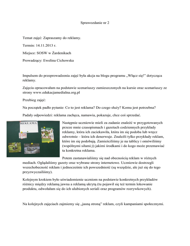 Sprawozdanie nr 2 Temat zajęć: Zapraszamy do reklamy. Termin: 14.11.2013 r. Miejsce: SOSW w Żardenikach Prowadzący: Ewelina Cichowska Impulsem do przeprowadzenia zajęć była akcja na blogu programu „Włącz się!” dotycząca reklamy. Zajęcia opracowałam na podstawie scenariuszy zamieszczonych na kursie oraz scenariuszy ze strony www.edukacjamedialna.org.pl Przebieg zajęć: Na początek padło pytanie: Co to jest reklama? Do czego służy? Komu jest potrzebna? Padały odpowiedzi: reklama zachęca, namawia, pokazuje, chce coś sprzedać. Następnie uczniowie mieli za zadanie znaleźć w przygotowanych przeze mnie czasopismach i gazetach codziennych przykłady reklamy, która ich zaciekawiła, która im się podoba lub wręcz odwrotnie – która ich denerwuje. Znaleźli tylko przykłady reklam, które im się podobają. Zamieściliśmy je na tablicy i omówiliśmy (wspólnymi siłami;)) jakimi środkami i do kogo może przemawiać ta konkretna reklama. Potem zastanawialiśmy się nad obecnością reklam w różnych mediach. Oglądaliśmy gazety oraz wybrane strony internetowe. Uczniowie dostrzegli wszechobecność reklam i jednocześnie ich powszedniość (są wszędzie, ale już się do tego przyzwyczailiśmy). Kolejnym krokiem było uświadomienie uczniom na podstawie konkretnych przykładów różnicy między reklamą jawna a reklamą ukrytą (tu pojawił się też termin lokowanie produktu, odwołałam się do ich ulubionych seriali oraz programów rozrywkowych). Na kolejnych zajęciach zajmiemy się „jasną stroną” reklam, czyli kampaniami społecznymi.