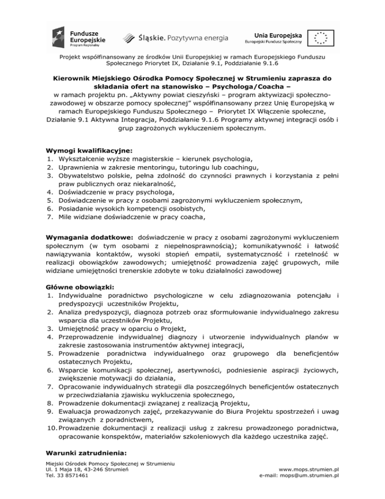 Projekt współfinansowany ze środków Unii Europejskiej w ramach Europejskiego Funduszu Społecznego Priorytet IX, Działanie 9.1, Poddziałanie 9.1.6 Kierownik Miejskiego Ośrodka Pomocy Społecznej w Strumieniu zaprasza do składania ofert na stanowisko – Psychologa/Coacha – w ramach projektu pn. „Aktywny powiat cieszyński – program aktywizacji społecznozawodowej w obszarze pomocy społecznej” współfinansowany przez Unię Europejską w ramach Europejskiego Funduszu Społecznego – Priorytet IX Włączenie społeczne, Działanie 9.1 Aktywna Integracja, Poddziałanie 9.1.6 Programy aktywnej integracji osób i grup zagrożonych wykluczeniem społecznym. Wymogi kwalifikacyjne: 1. Wykształcenie wyższe magisterskie – kierunek psychologia, 2. Uprawnienia w zakresie mentoringu, tutoringu lub coachingu, 3. Obywatelstwo polskie, pełna zdolność do czynności prawnych i korzystania z pełni praw publicznych oraz niekaralność, 4. Doświadczenie w pracy psychologa, 5. Doświadczenie w pracy z osobami zagrożonymi wykluczeniem społecznym, 6. Posiadanie wysokich kompetencji osobistych, 7. Mile widziane doświadczenie w pracy coacha, Wymagania dodatkowe: doświadczenie w pracy z osobami zagrożonymi wykluczeniem społecznym (w tym osobami z niepełnosprawnością); komunikatywność i łatwość nawiązywania kontaktów, wysoki stopień empatii, systematyczność i rzetelność w realizacji obowiązków zawodowych; umiejętność prowadzenia zajęć grupowych, mile widziane umiejętności trenerskie zdobyte w toku działalności zawodowej Główne obowiązki: 1. Indywidualne poradnictwo psychologiczne w celu zdiagnozowania potencjału i predyspozycji uczestników Projektu, 2. Analiza predyspozycji, diagnoza potrzeb oraz sformułowanie indywidualnego zakresu wsparcia dla uczestników Projektu, 3. Umiejętność pracy w oparciu o Projekt, 4. Przeprowadzenie indywidualnej diagnozy i utworzenie indywidualnych planów w zakresie zastosowania instrumentów aktywnej integracji, 5. Prowadzenie poradnictwa indywidualnego oraz grupowego dla beneficjentów ostatecznych Projektu, 6. Wsparcie komunikacji społecznej, asertywności, podniesienie aspiracji życiowych, zwiększenie motywacji do działania, 7. Opracowanie indywidualnych strategii dla poszczególnych beneficjentów ostatecznych w przeciwdziałania zjawisku wykluczenia społecznego, 8. Prowadzenie dokumentacji związanej z realizacją Projektu, 9. Ewaluacja prowadzonych zajęć, przekazywanie do Biura Projektu spostrzeżeń i uwag związanych z poradnictwem, 10. Prowadzenie dokumentacji z realizacji usług z zakresu prowadzonego poradnictwa, opracowanie konspektów, materiałów szkoleniowych dla każdego uczestnika zajęć. Warunki zatrudnienia: Miejski Ośrodek Pomocy Społecznej w Strumieniu Ul. 1 Maja 18, 43-246 Strumień Tel. 33 8571461 www.mops.strumien.pl e-mail: [email protected] Projekt współfinansowany ze środków Unii Europejskiej w ramach Europejskiego Funduszu Społecznego Priorytet IX, Działanie 9.1, Poddziałanie 9.1.6 1. Umowa cywilno - prawna na okres trwania projektu „Aktywny powiat cieszyński – program aktywizacji społeczno-zawodowej w obszarze pomocy społecznej” współfinansowana przez Unię Europejską w ramach Europejskiego Funduszu Społecznego, od momentu podpisania umowy do 31.12.2017r. Miesięczny czas pracy uzależniony jest od stwierdzonych potrzeb uczestników projektów. W wymiarze nie większym niż 20 godzin zegarowych miesięcznie Wymagane dokumenty: 1. Listy motywacyjny, 2. Życiorys – curriculum Vitae, 3. Kserokopie dokumentów poświadczające wykształcenie, 4. Kserokopie dokumentów poświadczających udział w szkoleniach, mających związek z przewidzianymi obowiązkami w Projekcie, kursach W dokumentacji należy zawrzeć klauzulę: „Wyrażam zgodę na przetwarzanie moich danych osobowych zawartych w ofercie pracy dla potrzeb niezbędnych do realizacji procesu rekrutacji w projekcie „Aktywny powiat cieszyński – program aktywizacji społeczno-zawodowej w obszarze pomocy społecznej” współfinansowanym przez Unię Europejską w ramach Europejskiego Funduszu Społecznego zgodnie z ustawą z dnia 29 sierpnia 1997 r. o ochronie danych osobowych (Dz. U. z 2015 r. Nr 101, poz. 2135 z późn. zm.) oraz ustawą z dnia 21 listopada 2008 roku. o pracownikach samorządowych (Dz. U. Nr 223, poz. 1458)”. Termin i miejsce składania dokumentów: Oferty w zaklejonych kopertach z napisem: „Dotyczy naboru na stanowisko Psycholog/ Coach w ramach projektu „Aktywny powiat cieszyński – program aktywizacji społecznozawodowej w obszarze pomocy społecznej” współfinansowanego przez Unię Europejską w ramach Europejskiego Funduszu Społecznego, należy składać w terminie do 08.02.2016r. w Miejskim Ośrodku Pomocy Społecznej w Strumieniu, ul. 1 Maja 18, 43246 Strumień. W przypadku ofert nadesłanych pocztą decyduje data wpływu. Oferty złożone po terminie nie będą rozpatrywane. Procedura wyłonienia wykonawcy: Procedura obejmuje analizę dokumentów aplikacyjnych na podstawie, której wybrane zostaną 3 oferty osób posiadających najlepsze kwalifikacje do realizacji zadania zatrudnienie Psychologa/Coacha do projektu „Aktywny powiat cieszyński – program aktywizacji społeczno-zawodowej w obszarze pomocy społecznej” współfinansowanego przez Unię Europejską w ramach Europejskiego Funduszu Społecznego. Następnie do w/w osób zostaną wysłane zapytania ofertowe. Osoba, która złoży najkorzystniejszą ofertę zgodną z założonym budżetem projektu, zostanie wybrana do realizacji zadania. Informacje o wyborze zostaną zamieszczone na tablicy ogłoszeń w Miejskim Ośrodku Pomocy Społecznej w Strumieniu, a także na stronie internetowej Projektu www.mops.strumien.pl Miejski Ośrodek Pomocy Społecznej w Strumieniu Ul. 1 Maja 18, 43-246 Strumień Tel. 33 8571461 www.mops.strumien.pl e-mail: [email protected]