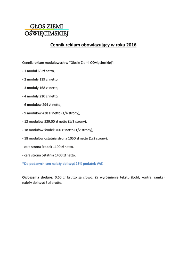 Cennik reklam obowiązujący w roku 2016 Cennik reklam modułowych w “Głosie Ziemi Oświęcimskiej”: - 1 moduł 63 zł netto, - 2 moduły 119 zł netto, - 3 moduły 168 zł netto, - 4 moduły 210 zł netto, - 6 modułów 294 zł netto, - 9 modułów 428 zł netto (1/4 strony), - 12 modułów 529,00 zł netto (1/3 strony), - 18 modułów środek 700 zł netto (1/2 strony), - 18 modułów ostatnia strona 1050 zł netto (1/2 strony), - cała strona środek 1190 zł netto, - cała strona ostatnia 1400 zł netto. *Do podanych cen należy doliczyć 23% podatek VAT. Ogłoszenia drobne: 0,60 zł brutto za słowo. Za wyróżnienie tekstu (bold, kontra, ramka) należy doliczyć 5 zł brutto.