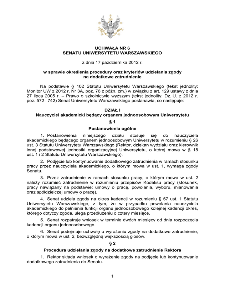 UCHWAŁA NR 6 SENATU UNIWERSYTETU WARSZAWSKIEGO z dnia 17 października 2012 r. w sprawie określenia procedury oraz kryteriów udzielania zgody na dodatkowe zatrudnienie Na podstawie § 102 Statutu Uniwersytetu Warszawskiego (tekst jednolity: Monitor UW z 2012 r. Nr 3A, poz. 76 z późn. zm.) w związku z art. 129 ustawy z dnia 27 lipca 2005 r. – Prawo o szkolnictwie wyższym (tekst jednolity: Dz. U. z 2012 r. poz. 572 i 742) Senat Uniwersytetu Warszawskiego postanawia, co następuje: DZIAŁ I Nauczyciel akademicki będący organem jednoosobowym Uniwersytetu §1 Postanowienia ogólne 1. Postanowienia niniejszego działu stosuje się do nauczyciela akademickiego będącego organem jednoosobowym Uniwersytetu w rozumieniu § 26 ust. 3 Statutu Uniwersytetu Warszawskiego (Rektor, dziekan wydziału oraz kierownik innej podstawowej jednostki organizacyjnej Uniwersytetu, o której mowa w § 18 ust. 1 i 2 Statutu Uniwersytetu Warszawskiego). 2. Podjęcie lub kontynuowanie dodatkowego zatrudnienia w ramach stosunku pracy przez nauczyciela akademickiego, o którym mowa w ust. 1, wymaga zgody Senatu. 3. Przez zatrudnienie w ramach stosunku pracy, o którym mowa w ust. 2 należy rozumieć zatrudnienie w rozumieniu przepisów Kodeksu pracy (stosunek, pracy nawiązany na podstawie: umowy o pracę, powołania, wyboru, mianowania oraz spółdzielczej umowy o pracę). 4. Senat udziela zgody na okres kadencji w rozumieniu § 57 ust. 1 Statutu Uniwersytetu Warszawskiego, z tym, że w przypadku powołania nauczyciela akademickiego do pełnienia funkcji organu jednoosobowego kolejnej kadencji okres, którego dotyczy zgoda, ulega przedłużeniu o cztery miesiące. 5. Senat rozpatruje wniosek w terminie dwóch miesięcy od dnia rozpoczęcia kadencji organu jednoosobowego. 6. Senat podejmuje uchwałę o wyrażeniu zgody na dodatkowe zatrudnienie, o którym mowa w ust. 2, bezwzględną większością głosów. §2 Procedura udzielania zgody na dodatkowe zatrudnienie Rektora 1. Rektor składa wniosek o wyrażenie zgody na podjęcie lub kontynuowanie dodatkowego zatrudnienia do Senatu. 1 2. Senat wyraża Rektorowi zgodę na dodatkowe zatrudnienie tylko w wyjątkowych i szczególnie uzasadnionych przypadkach. §3 Procedura oraz kryteria udzielania zgody na dodatkowe zatrudnienie dziekana wydziału oraz kierownika innej podstawowej jednostki organizacyjnej Uniwersytetu 1. Dziekan wydziału oraz kierownik innej podstawowej jednostki organizacyjnej Uniwersytetu, o której mowa w § 18 ust. 1 i 2 Statutu Uniwersytetu Warszawskiego składa do Senatu, za pośrednictwem Rektora, wniosek o wyrażenie zgody na podjęcie lub kontynuowanie dodatkowego zatrudnienia. 2. Wzór wniosku, o którym mowa w ust. 1, stanowi załącznik nr 1 do niniejszej uchwały 3. Rektor, po zaopiniowaniu wniosku, o którym mowa w ust.1, wprowadza go do porządku dziennego najbliższego posiedzenia Senatu, z tym, że wniosek powinien być złożony do Rektora nie późnej niż 14 dni przed terminem posiedzenia Senatu. 1) 2) 3) 4. Rektor opiniuje wniosek uwzględniając w szczególności: ocenę możliwości zaistnienia konfliktu interesów i/lub zobowiązań w rozumieniu § 106 Statutu Uniwersytetu Warszawskiego oraz uchwały nr 374 Senatu Uniwersytetu Warszawskiego z dnia 21 maja 2008 r. w sprawie konfliktu interesów lub konfliktu zobowiązań (Monitor UW z 2008 r. Nr 5, poz. 103) w związku z podjęciem lub kontynuowaniem dodatkowego zatrudnienia; ocenę wpływu dodatkowego zatrudnienia na prawidłowe wykonywanie obowiązków związanych z pełnieniem funkcji organu jednoosobowego Uniwersytetu uwzględniając charakter dodatkowego zatrudnienia; ocenę ewentualnych korzyści dla rozwoju naukowego dziekana wydziału lub kierownika innej podstawowej jednostki organizacyjnej Uniwersytetu oraz całego Uniwersytetu, wynikających z dodatkowej pracy, w szczególności nawiązanie lub zacieśnienie współpracy naukowej między Uniwersytetem a inną jednostką, realizacja wspólnych projektów badawczych. DZIAŁ II Nauczyciel akademicki pełniący funkcję prorektora §4 Procedura oraz kryteria udzielania zgody na dodatkowe zatrudnienie prorektora 1. Prorektor, za pośrednictwem Rektora, składa do Senatu wniosek o wyrażenie zgody na podjęcie lub kontynuowanie dodatkowego zatrudnienia. 2. Wzór wniosku, o którym mowa w ust. 1, stanowi załącznik nr 1 do niniejszej uchwały. 3. Rektor opiniuje wniosek prorektora uwzględniając w szczególności kryteria, o których mowa w § 3 ust. 4. 4. Postanowienia § 1 stosuje się odpowiednio. 2 DZIAŁ III Pozostali nauczyciele akademiccy §5 Dodatkowe zatrudnienie u pracodawcy prowadzącego działalność dydaktyczną lub naukowo-badawczą 1. W tym samym czasie nauczyciel akademicki może podjąć lub kontynuować zatrudnienie w ramach stosunku pracy tylko u jednego dodatkowego pracodawcy prowadzącego działalność dydaktyczną lub naukowo-badawczą. 2. Podjęcie lub kontynuowanie dodatkowego zatrudnienia w ramach stosunku pracy u pracodawcy prowadzącego działalność dydaktyczną lub naukowobadawczą wymaga zgody Rektora. §6 Procedura oraz kryteria udzielania zgody na dodatkowe zatrudnienie 1. Nauczyciel akademicki składa do Rektora wniosek o wyrażenie zgody na podjęcie lub kontynuowanie dodatkowego zatrudnienia. Wniosek powinien być zaopiniowany przez dziekana wydziału lub kierownika innej jednostki organizacyjnej Uniwersytetu. 2. Wzór wniosku o wyrażenie zgody na podjęcie lub kontynuowanie dodatkowego zatrudnienia stanowi załącznik nr 2 do niniejszej uchwały. 3. Opinia dziekana wydziału lub kierownika innej podstawowej jednostki organizacyjnej Uniwersytetu uwzględnia w szczególności: 1) ocenę wpływu dodatkowej pracy na jakość i terminowość wykonywania obowiązków dydaktycznych, naukowych i organizacyjnych wykonywanych w ramach stosunku pracy na Uniwersytecie biorąc pod uwagę ich wielkość i charakter; 2) ocenę okresową pracy nauczyciela akademickiego na Uniwersytecie dokonan