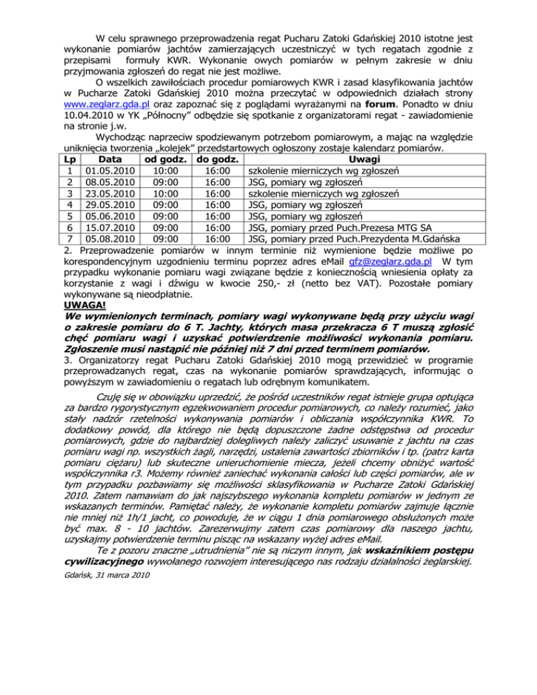 W celu sprawnego przeprowadzenia regat Pucharu Zatoki Gdańskiej 2010 istotne jest wykonanie pomiarów jachtów zamierzających uczestniczyć w tych regatach zgodnie z przepisami formuły KWR. Wykonanie owych pomiarów w pełnym zakresie w dniu przyjmowania zgłoszeń do regat nie jest możliwe. O wszelkich zawiłościach procedur pomiarowych KWR i zasad klasyfikowania jachtów w Pucharze Zatoki Gdańskiej 2010 można przeczytać w odpowiednich działach strony www.zeglarz.gda.pl oraz zapoznać się z poglądami wyrażanymi na forum. Ponadto w dniu 10.04.2010 w YK „Północny” odbędzie się spotkanie z organizatorami regat - zawiadomienie na stronie j.w. Wychodząc naprzeciw spodziewanym potrzebom pomiarowym, a mając na względzie uniknięcia tworzenia „kolejek” przedstartowych ogłoszony zostaje kalendarz pomiarów. Lp Data od godz. do godz. Uwagi 1 01.05.2010 10:00 16:00 szkolenie mierniczych wg zgłoszeń 2 08.05.2010 09:00 16:00 JSG, pomiary wg zgłoszeń 3 23.05.2010 10:00 16:00 szkolenie mierniczych wg zgłoszeń 4 29.05.2010 09:00 16:00 JSG, pomiary wg zgłoszeń 5 05.06.2010 09:00 16:00 JSG, pomiary wg zgłoszeń 6 15.07.2010 09:00 16:00 JSG, pomiary przed Puch.Prezesa MTG SA 7 05.08.2010 09:00 16:00 JSG, pomiary przed Puch.Prezydenta M.Gdańska 2. Przeprowadzenie pomiarów w innym terminie niż wymienione będzie możliwe po korespondencyjnym uzgodnieniu terminu poprzez adres eMail [email protected] W tym przypadku wykonanie pomiaru wagi związane będzie z koniecznością wniesienia opłaty za korzystanie z wagi i dźwigu w kwocie 250,- zł (netto bez VAT). Pozostałe pomiary wykonywane są nieodpłatnie. UWAGA! We wymienionych terminach, pomiary wagi wykonywane będą przy użyciu wagi o zakresie pomiaru do 6 T. Jachty, których masa przekracza 6 T muszą zgłosić chęć pomiaru wagi i uzyskać potwierdzenie możliwości wykonania pomiaru. Zgłoszenie musi nastąpić nie później niż 7 dni przed terminem pomiarów. 3. Organizatorzy regat Pucharu Zatoki Gdańskiej 2010 mogą przewidzieć w programie przeprowadzanych regat, czas na wykonanie pomiarów sprawdzających, informując o powyższym w zawiadomieniu o regatach lub odrębnym komunikatem. Czuję się w obowiązku uprzedzić, że pośród uczestników regat istnieje grupa optująca za bardzo rygorystycznym egzekwowaniem procedur pomiarowych, co należy rozumieć, jako stały nadzór rzetelności wykonywania pomiarów i obliczania współczynnika KWR. To dodatkowy powód, dla którego nie będą dopuszczone żadne odstępstwa od procedur pomiarowych, gdzie do najbardziej dolegliwych należy zaliczyć usuwanie z jachtu na czas pomiaru wagi np. wszystkich żagli, narzędzi, ustalenia zawartości zbiorników i tp. (patrz karta pomiaru ciężaru) lub skuteczne unieruchomienie miecza, jeżeli chcemy obniżyć wartość współczynnika r3. Możemy również zaniechać wykonania całości lub części pomiarów, ale w tym przypadku pozbawiamy się możliwości sklasyfikowania w Pucharze Zatoki Gdańskiej 2010. Zatem namawiam do jak najszybszego wykonania kompletu pomiarów w jednym ze wskazanych terminów. Pamiętać należy, że wykonanie kompletu pomiarów zajmuje łącznie nie mniej niż 1h/1 jacht, co powoduje, że w ciągu 1 dnia pomiarowego obsłużonych może być max. 8 - 10 jachtów. Zarezerwujmy zatem czas pomiarowy dla naszego jachtu, uzyskajmy potwierdzenie terminu pisząc na wskazany wyżej adres eMail. Te z pozoru znaczne „utrudnienia” nie są niczym innym, jak wskaźnikiem postępu cywilizacyjnego wywołanego rozwojem interesującego nas rodzaju działalności żeglarskiej. Gdańsk, 31 marca 2010