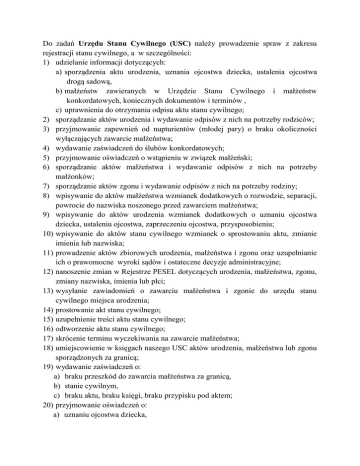 Do zadań Urzędu Stanu Cywilnego (USC) należy prowadzenie spraw z zakresu rejestracji stanu cywilnego, a w szczególności: 1) udzielanie informacji dotyczących: a) sporządzenia aktu urodzenia, uznania ojcostwa dziecka, ustalenia ojcostwa drogą sadową, b) małżeństw zawieranych w Urzędzie Stanu Cywilnego i małżeństw konkordatowych, koniecznych dokumentów i terminów , c) uprawnienia do otrzymania odpisu aktu stanu cywilnego; 2) sporządzanie aktów urodzenia i wydawanie odpisów z nich na potrzeby rodziców; 3) przyjmowanie zapewnień od nupturientów (młodej pary) o braku okoliczności wyłączających zawarcie małżeństwa; 4) wydawanie zaświadczeń do ślubów konkordatowych; 5) przyjmowanie oświadczeń o wstąpieniu w związek małżeński; 6) sporządzanie aktów małżeństwa i wydawanie odpisów z nich na potrzeby małżonków; 7) sporządzanie aktów zgonu i wydawanie odpisów z nich na potrzeby rodziny; 8) wpisywanie do aktów małżeństwa wzmianek dodatkowych o rozwodzie, separacji, powrocie do nazwiska noszonego przed zawarciem małżeństwa; 9) wpisywanie do aktów urodzenia wzmianek dodatkowych o uznaniu ojcostwa dziecka, ustaleniu ojcostwa, zaprzeczeniu ojcostwa, przysposobieniu; 10) wpisywanie do aktów stanu cywilnego wzmianek o sprostowaniu aktu, zmianie imienia lub nazwiska; 11) prowadzenie aktów zbiorowych urodzenia, małżeństwa i zgonu oraz uzupełnianie ich o prawomocne wyroki sądów i ostateczne decyzje administracyjne; 12) nanoszenie zmian w Rejestrze PESEL dotyczących urodzenia, małżeństwa, zgonu, zmiany nazwiska, imienia lub płci; 13) wysyłanie zawiadomień o zawarciu małżeństwa i zgonie do urzędu stanu cywilnego miejsca urodzenia; 14) prostowanie akt stanu cywilnego; 15) uzupełnienie treści aktu stanu cywilnego; 16) odtworzenie aktu stanu cywilnego; 17) skrócenie terminu wyczekiwania na zawarcie małżeństwa; 18) umiejscowienie w księgach naszego USC aktów urodzenia, małżeństwa lub zgonu sporządzonych za granicą; 19) wydawanie zaświadczeń o: a) braku przeszkód do zawarcia małżeństwa za granicą, b) stanie cywilnym, c) braku aktu, braku księgi, braku przypisku pod aktem; 20) przyjmowanie oświadczeń o: a) uznaniu ojcostwa dziecka, b) nadaniu dziecku nazwiska drugiego małżonka, c) zmianie imienia dziecka przed upływem 6 miesięcy od sporządzenia jego aktu urodzenia, d) powrocie do nazwiska noszonego przed zawarciem małżeństwa; 21) przyjmowanie podań o wydanie odpisów stanu cywilnego, prowadzenie rejestru przyjętych podań; 22) wydawanie odpisów aktów stanu cywilnego do dowodów osobistych, paszportów, spraw spadkowych, alimentów, zasiłków rodzinnych, ustalania kapitału początkowego w ZUS, emerytury, renty, zawierania małżeństw i in.; 23) prowadzenie korespondencji z polskimi placówkami konsularnymi; 24) prowadzenie archiwum ksiąg stanu cywilnego; 25) sporządzanie miesięcznych zestawień kontrolnych z ruchu naturalnego ludności dla potrzeb GUS; 26) prowadzenie rejestrów: a) wydanych zaświadczeń konkordatowych, b) wyroków sądowych, c) uznań ojcostwa; 27) organizowanie uroczystości wręczenia medali „Za długoletnie pożycie małżeńskie”; 28) występowanie z urzędu do sądu w sprawach: a) unieważnienia aktu stanu cywilnego, b) sprostowania aktu stanu cywilnego, c) ustalenia treści aktu stanu cywilnego; 29) zmiana imion i nazwisk w trybie administracyjnym.