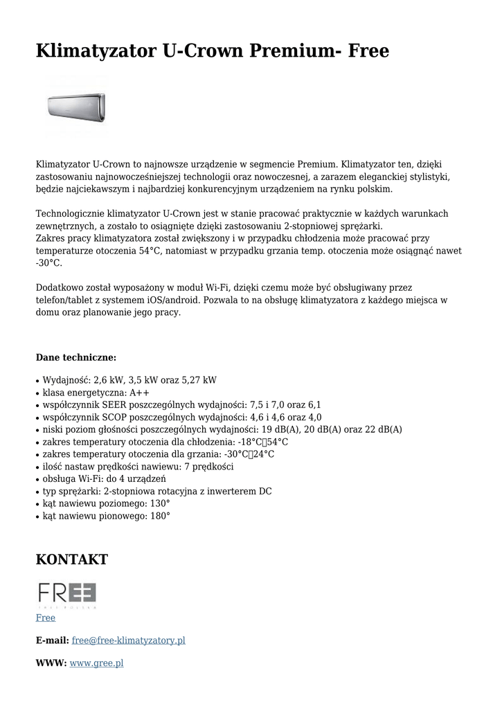 Klimatyzator U-Crown Premium- Free Klimatyzator U-Crown to najnowsze urządzenie w segmencie Premium. Klimatyzator ten, dzięki zastosowaniu najnowocześniejszej technologii oraz nowoczesnej, a zarazem eleganckiej stylistyki, będzie najciekawszym i najbardziej konkurencyjnym urządzeniem na rynku polskim. Technologicznie klimatyzator U-Crown jest w stanie pracować praktycznie w każdych warunkach zewnętrznych, a zostało to osiągnięte dzięki zastosowaniu 2-stopniowej sprężarki. Zakres pracy klimatyzatora został zwiększony i w przypadku chłodzenia może pracować przy temperaturze otoczenia 54°C, natomiast w przypadku grzania temp. otoczenia może osiągnąć nawet -30°C. Dodatkowo został wyposażony w moduł Wi-Fi, dzięki czemu może być obsługiwany przez telefon/tablet z systemem iOS/android. Pozwala to na obsługę klimatyzatora z każdego miejsca w domu oraz planowanie jego pracy. Dane techniczne: ● ● ● ● ● ● ● ● ● ● ● ● Wydajność: 2,6 kW, 3,5 kW oraz 5,27 kW klasa energetyczna: A++ współczynnik SEER poszczególnych wydajności: 7,5 i 7,0 oraz 6,1 współczynnik SCOP poszczególnych wydajności: 4,6 i 4,6 oraz 4,0 niski poziom głośności poszczególnych wydajności: 19 dB(A), 20 dB(A) oraz 22 dB(A) zakres temperatury otoczenia dla chłodzenia: -18°C~54°C zakres temperatury otoczenia dla grzania: -30°C~24°C ilość nastaw prędkości nawiewu: 7 prędkości obsługa Wi-Fi: do 4 urządzeń typ sprężarki: 2-stopniowa rotacyjna z inwerterem DC kąt nawiewu poziomego: 130° kąt nawiewu pionowego: 180° KONTAKT Free E-mail: [email protected] WWW: www.gree.pl Tel: +48 12 307 06 40 794 114 834 Adres: Zabłocie 25/10 30-701 Kraków