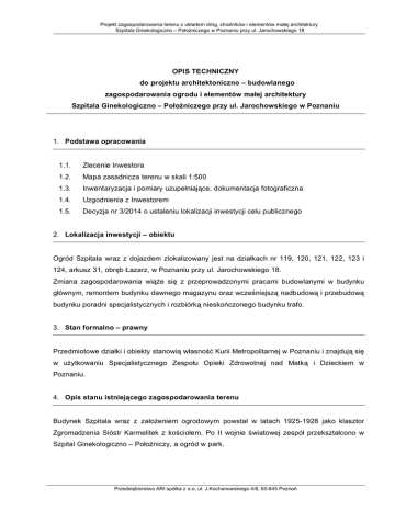 Projekt zagospodarowania terenu z układem dróg, chodników i elementów małej architektury Szpitala Ginekologiczno – Położniczego w Poznaniu przy ul. Jarochowskiego 18 OPIS TECHNICZNY do projektu architektoniczno – budowlanego zagospodarowania ogrodu i elementów małej architektury Szpitala Ginekologiczno – Położniczego przy ul. Jarochowskiego w Poznaniu 1. Podstawa opracowania 1.1. Zlecenie Inwestora 1.2. Mapa zasadnicza terenu w skali 1:500 1.3. Inwentaryzacja i pomiary uzupełniające, dokumentacja fotograficzna 1.4. Uzgodnienia z Inwestorem 1.5. Decyzja nr 3/2014 o ustaleniu lokalizacji inwestycji celu publicznego 2. Lokalizacja inwestycji – obiektu Ogród Szpitala wraz z dojazdem zlokalizowany jest na działkach nr 119, 120, 121, 122, 123 i 124, arkusz 31, obręb Łazarz, w Poznaniu przy ul. Jarochowskiego 18. Zmiana zagospodarowania wiąże się z przeprowadzonymi pracami budowlanymi w budynku głównym, remontem budynku dawnego magazynu oraz wcześniejszą nadbudową i przebudową budynku poradni specjalistycznych i rozbiórką nieskończonego budynku trafo. 3. Stan formalno – prawny Przedmiotowe działki i obiekty stanowią własność Kurii Metropolitarnej w Poznaniu i znajdują się w użytkowaniu Specjalistycznego Zespołu Opieki Zdrowotnej nad Matką i Dzieckiem w Poznaniu. 4. Opis stanu istniejącego zagospodarowania terenu Budynek Szpitala wraz z założeniem ogrodowym powstał w latach 1925-1928 jako klasztor Zgromadzenia Sióstr Karmelitek z kościołem. Po II wojnie światowej zespół przekształcono w Szpital Ginekologiczno – Położniczy, a ogród w park. Przedsiębiorstwo ARI spółka z o.o. ul. J.Kochanowskiego 4/8, 60-845 Poznań Projekt zagospodarowania terenu z układem dróg, chodników i elementów małej architektury Szpitala Ginekologiczno – Położniczego w Poznaniu przy ul. Jarochowskiego 18 Teren parku otoczony jest murowanym, od wewnątrz licowanym cegłą parkanem – murem, który podobnie jak narożnikowy budynek, dawniej ogrodnika i wolnostojący magazyn podziemny stanowią obiekty pierwotnego zagospodarowania. W okresie powojennym powstały jeszcze przy zachodnim murze budynki obecnej apteki i niedawno rozebrany obiekt przerwanej realizacji trafo, a także po stronie wschodniej budynek agregatu prądotwórczego. Teren porośnięty jest bardzo zróżnicowanym gatunkowo i jakościowo drzewostanem i pierwotnie zagospodarowany był gęstym układem ścieżek spacerowych. Wzdłuż północnej granicy parku biegnie droga przylegająca bezpośrednio do głównego budynku Szpitala – tutaj jeszcze z bloczków betonowych, tzw. trylinki – i budynku poradni – tutaj już zmodernizowana z nawierzchnią z kostki granitowej. Tak zwaną małą architekturę parku zrealizowaną w okresie powojennym tworzyły pergola i murki tarasów ziemnym wykonane z łupanych nieregularnych bloków piaskowca. Ten sam materiał został użyty do obłożenia budynku ogrodnika oraz do części nadziemnej wolnostojącego magazynu podziemnego. Stan okładzin, murków i pergoli jest zły, podobnie jak stan niekompletnego układu ścieżek i nawierzchni drogowej z trylinki. 5. Projekt zagospodarowania Zakłada się: - przebudowę wolnostojącego budynku magazynu podziemnego i likwidację przylegającego do niego tarasu, - realizację w południowo – zachodniej części parku, w miejscu po wyburzeniu dawnej stacji trafo, parkingu naziemnego z nawierzchnią z kostki granitowej, - likwidację pergoli i przylegającego do niej tarasu ziemnego oraz podziemnego magazynu, - likwidację nawierzchni pokrytych trylinką i realizację drogi dostawczej z nawierzchnią z kostki granitowej, wyrównanie powierzchni parku, uporządkowanie drzewostanu, założenie nowego układu ścieżek spacerowych z miejscami do siedzenia, założenie nowego trawnika, zmiana lokalizacji rzeźby plenerowej, - realizację nasadzeń zamiennych lub przesadzeń drzew oraz realizację trawnika, - realizację nowego oświetlenia parku, - realizację elementów nowego zagospodarowania stanowiących małą architekturę parku. Przedsiębiorstwo ARI spółka z o.o. ul. J.Kochanowskiego 4/8, 60-845 Poznań Projekt zagospodarowania terenu z układem dróg, chodników i elementów małej architektury Szpitala Ginekologiczno – Położniczego w Poznaniu przy ul. Jarochowskiego 18 6. Mała architektura żywopłot oddzielający parking od części zielonej parku, cokół pod rzeźbę, siedziska ławek z koszami na śmieci, płyta nagrobna (mogiła) w miejscu grobów, stalowa krata ozdobna drzew na parkingu Okładziny magazynu podziemnego, murek i postumenty projektuje się z cegły elewacyjnej analogicznej jak cegła po wewnętrznej stronie zabytkowego muru. Nawierzchnie drogowe projektuje się z kostki granitowej 9x11 cm (10x10 cm). Nawierzchnie ścieżek parkowych z drobnej kostki 4x5 cm (6x6 cm). Krawężniki granitowe, ewentualnie betonowe dróg normatywne, krawężniki granitowe ścieżek i krat drzew gr. 8 cm. Ławki katalogowe, np. 1) ławka bez oparcia, producent Ziegler, typ CIMA, kolor RAL 7016, 2) Ławka z oparciem, producent Ziegler, typ ZETATIELLE (bez napisu). Kosze na śmieci, np. producent Ziegler, typ MORLEY, pojemność 16l, kolor RAL 7016. Słupy oświetleniowe, np. IGUZZINI model MultiPro (maszt z oświetleniem wielopunktowym) lub THORN model Alumet Classic. Krata ozdobna drzew – żeliwna, katalogowa, np. producent Ziegler, kratownica DEWAS, kwadratowa – MODERN. 7. Uzbrojenie podziemne Realizacja nowego zagospodarowania parku i przebudowa magazynu podziemnego wiążą się z realizacją na terenie Szpitala: - odcinka sieci wodociągowej, - odprowadzania wód deszczowych z układu drogowego do istniejącej kanalizacji, - wymianą zasilania energetycznego budynku podziemnego, - kabli zasilających instalację oświetleniową. Układ wg planszy zbiorczej. Poznań, styczeń 2014r. Opracował Eugeniusz Skrzypczak architekt Przedsiębiorstwo ARI spółka z o.o. ul. J.Kochanowskiego 4/8, 
