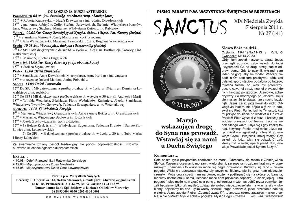 OGŁOSZENIA DUSZPASTERSKIE Poniedziałek 08.08 Św. Dominika, prezbitera (wsp. obowiązkowe) 1730 + Roberta Krawczyka, + Józefa Krawczyka z int. rodziny Drozdowskich 1800 Jana, Annę Rabiejów, Zofię, Stefana Dziewięckich, Stefanię, Władysława Kruków, Jana, Władysławę Stachura, Mariannę, Władysława Kutów z int. Rabiejów Wtorek 09.08 Św. Teresy Benedykty od Krzyża, dziew. i Męcz. Pat. Europy (święto) 700 + Stanisława Misiora + Józefę Misior z int. córki z rodziną 1800 + Jana Wawrzeńczyka, Mariannę, Franciszka, Józefa, Bogdana Wawrzeńczyków Środa 10.08 Św. Wawrzyńca, diakona i Męczennika (święto) 700 Do SPJ i Mb dziękczynna o dalsze bł. w życiu w 18-tą r. ur. Bartłomieja Kotwicy z int. matki chrzestnej 1800 + Mariannę i Stefana Bugajskich Czwartek 11.08 11.08 Św. Klary dziewicy (wsp. obowiązkowe) 1800 + Stefana Szymkiewicza Piątek 12.08 12.08 Dzień Powszedni 1730 + Stanisława, Annę Kowalskich, Mieczysława, Annę Korban z int. wnuczka 1800 + w rocznicę śmierci Mariana, Janinę Pobochów Sobota 13.08 13.08 Dzień Powszedni 1700 Do SPJ i Mb dziękczynna z prośbą o dalsze bł. w życiu w 18-tą r. ur. Dominika kowalskiego z int. rodziców 1730 Do SPJ i MB dziękczynna z prośbą o dalsze bł. w życiu w 30-tą r. śl. Andrzeja i Marii 1800 + Witolda Woźniaka, Zdzisława, Piotra Woźniaków, Kazimierę, Józefa, Stanisława, Władysławę Tworków, Genowefę, Tadeusza Szczepanków z int. Woźniakowej Niedziela 14.08 14.08 XX Niedziela Zwykła 800 + Mariannę, Władysławę Gruszczyńskich, Annę i Anetę Bekier z int. Gruszczyńskich 1000 + Mariannę, Wincentego Bedlów z int. Lużyńskich 1200 + Józefa Zychowicza z int. żony z dziećmi 1600 + 1) Helenę Kruk (r. śm.), Władysława, Eugeniusza, Tadeusza Kruków i Danutę Stokowiec z int. Lewoniewskich 2) Do SPJ i MB dziękczynna z prośbą o dalsze bł. w życiu w 20-tą r. ślubu Marka i Beaty Łabęckich Za ewentualne zmiany Zespół Redakcyjny nie ponosi odpowiedzialności. Prosimy o uważne słuchanie ogłoszeń duszpasterskich. PISMO PARAFII P.W. WSZYSTKICH ŚWIĘTYCH W BRZEZINACH SANC SANCTUS XIX Niedziela Zwykła 7 sierpnia 2011 r. Nr 37 (141) Słowo Boże na dziś… Maryjo wskazująca drogę do Syna nas prowadź. Wstawiaj się za nami u Ducha Świętego Czytania: 1 Krl 19,9a.11-13 / Rz 9,1-5 Ewangelia: Mt 14,22-33 „Gdy tłum został nasycony, zaraz Jezus przynaglił uczniów, żeby wsiedli do łodzi i wyprzedzili Go na drugi brzeg, zanim odprawi tłumy. Gdy to uczynił, wyszedł sam jeden na górę, aby się modlić. Wieczór zapadł, a On sam tam przebywał. Łódź zaś była już sporo stadiów oddalona od brzegu, miotana falami, bo wiatr był przeciwny. Lecz o czwartej straży nocnej przyszedł do nich, krocząc po jeziorze. Uczniowie, zobaczywszy Go kroczącego po jeziorze, zlękli się myśląc, że to zjawa, i ze strachu krzyknęli. Jezus zaraz przemówił do nich: Odwagi! Ja jestem, nie bójcie się! Na to odezwał się Piotr: Panie, jeśli to Ty jesteś, każ mi przyjść do siebie po wodzie! A On rzekł: Przyjdź! Piotr wyszedł z łodzi, i krocząc po wodzie, przyszedł do Jezusa. Lecz na widok silnego wiatru uląkł się i gdy zaczął tonąć, krzyknął: Panie, ratuj mnie! Jezus natychmiast wyciągnął rękę i chwycił go, mówiąc: Czemu zwątpiłeś, małej wiary? Gdy wsiedli do łodzi, wiatr się uciszył. Ci zaś, którzy byli w łodzi, upadli przed Nim, mówiąc: Prawdziwie jesteś Synem Bożym.” Komentarz… Ekstra… × 10.08 - Dzień Przewodnika i Ratownika Górskiego × 12.08 - Międzynarodowy Dzień Młodzieży × 13.08 - Międzynarodowy Dzień Osób Leworęcznych Parafia p.w. Wszystkich Świętych Brzeziny ul. Chęcińska 312, 26-026 Morawica, e-mail: [email protected] nr tel. ks. Proboszcz 41 311 42 59, ks. Wikariusz 41 311 48 98 Numer konta: Bank Spółdzielczy w Kielcach Oddział w Morawicy 08 84930004 0070 0205 4104 0001 D O U Ż Y T K U W E W N Ę T R Z N E G O Całe nasze życie przypomina chodzenie po morzu. Obracamy się razem z Ziemią wkoło Słońca. Razem z oceanami, morzami, wielorybami, szczupakami, żabami krążymy w przeraźliwym Kosmosie i to wszystko może się nagle przewrócić. Budzimy się rano – piękna pogoda. Wisła nie przewraca statków płynących na Bielany, ale ile grozi nam niebezpieczeństw. Może cegła spaść nam na głowę, możemy poślizgnąć się na skórce od banana, możemy dostać ataku serca, listonosz może nam przynieść depeszę: „Z ciocią lepiej. Jutro pogrzeb”, pies może nam zjeść całą pensję, ochroniarz może nas pobić przez pomyłkę. Jeżeli będziemy tylko tak myśleć, zdając się wobec niebezpieczeństw na własne siły – utoniemy, pójdziemy na dno. Tylko wtedy człowiek stąpa odważnie, jeżeli przestanie bać się o siebie. Jezus zapytał Piotra: „Czemuś zwątpił?”, to znaczy: czemu zacząłeś myśleć o sobie, a nie o Mnie? Myśl o sobie – pogrąża. Myśl o Bogu - zbawia /ks. Jan Twardowski/ Boży człowiek… - św. Edyta Stein (9 sierpnia) A w parafii… ▪ 1 sierpnia 2011 roku w naszym kościele odbył się odbiór prac konserwatorskich przy chórze muzycznym wraz z prospektem organowym przeprowadzonych przez firmę Wojciecha Szczurka z Krakowa. Odebrał je bez żadnych zastrzeżeń Wojewódzki Konserwator Zabytków mgr Zbigniew Wojtasik. Parafię reprezentował ks. proboszcz Jan Pragnący i przewodniczący Komitetu Odnowy Kościoła Parafialnego w Brzezinach Damian Zegadło. Tym zadaniem zakończone zostały najważniejsze prace wewnątrz kościoła, których wykonanie było możliwe dzięki hojności parafian. ▪ Dziękujemy serdecznie pani Franciszce Nowak za wyczyszczenie komży procesyjnych. ▪ 15 sierpnia w uroczystość Wniebowzięcia Najświętszej Maryi Panny będziemy przeżywać odpust parafialny. Z tej okazji młodzież będzie sprzedawała wizerunki (fotodruk na płótnie i wydruk na papierze) Matki Bożej z Dzieciątkiem z naszego ołtarza. N