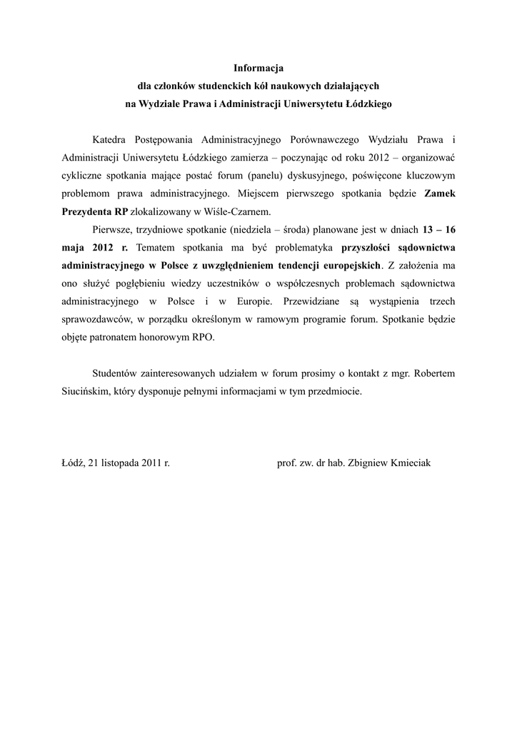 Informacja dla członków studenckich kół naukowych działających na Wydziale Prawa i Administracji Uniwersytetu Łódzkiego Katedra Postępowania Administracyjnego Porównawczego Wydziału Prawa i Administracji Uniwersytetu Łódzkiego zamierza – poczynając od roku 2012 – organizować cykliczne spotkania mające postać forum (panelu) dyskusyjnego, poświęcone kluczowym problemom prawa administracyjnego. Miejscem pierwszego spotkania będzie Zamek Prezydenta RP zlokalizowany w Wiśle-Czarnem. Pierwsze, trzydniowe spotkanie (niedziela – środa) planowane jest w dniach 13 – 16 maja 2012 r. Tematem spotkania ma być problematyka przyszłości sądownictwa administracyjnego w Polsce z uwzględnieniem tendencji europejskich. Z założenia ma ono służyć pogłębieniu wiedzy uczestników o współczesnych problemach sądownictwa administracyjnego w Polsce i w Europie. Przewidziane są wystąpienia trzech sprawozdawców, w porządku określonym w ramowym programie forum. Spotkanie będzie objęte patronatem honorowym RPO. Studentów zainteresowanych udziałem w forum prosimy o kontakt z mgr. Robertem Siucińskim, który dysponuje pełnymi informacjami w tym przedmiocie. Łódź, 21 listopada 2011 r. prof. zw. dr hab. Zbigniew Kmieciak Ramowy program panelu dyskusyjnego Przyszłość sądownictwa administracyjnego w Polsce z uwzględnieniem tendencji europejskich, Wisła-Czarne (Zameczek Prezydencki), 13 – 16 maja 2012 r. 13 maja (niedziela) g. 15 – 18 – przyjazd i zakwaterowanie uczestników g. 18 – 19 – kolacja g. 19 – spotkanie uczestników w sali klubowej, omówienie zasad i porządku debaty 14 maja (poniedziałek) g. 8 – 9 – śniadanie g. 9.30 – 10 – otwarcie konferencji, wystąpienie gości honorowych g. 10 – 13.30 – pierwsza sesja dyskusyjna: Stan i obecne problemy sądownictwa administracyjnego w Polsce (diagnoza), z przerwą kawową ok. g. 11.30 g. 13.30 – 14.30 – obiad g. 15 – 18 – druga sesja dyskusyjna: Rozwój sądownictwa administracyjnego w Europie – współczesne tendencje (porównanie) g. 19 – grill 15 maja (wtorek) g. 8 – 9 – śniadanie g. 9.00 – 12 – trzecia sesja dyskusyjna: Założenia i perspektywy rozwoju sądownictwa administracyjnego w Polsce (synteza), z przerwą kawową ok. g. 10.30 g. 12.15 – 13.00 – obiad g. 13.15 – 18 – wycieczka górska (do wyboru jeden z trzech proponowanych szlaków turystycznych) g. 19 – kolacja 16 maja (środa) g. 8 – 9 – śniadanie g. 9.30 – 10.30 – spotkanie zespołu roboczego do spraw przygotowania raportu końcowego g. 10.30 zwiedzanie Zameczku Górnego (dla zainteresowanych) g. 11 – wyjazd uczestników