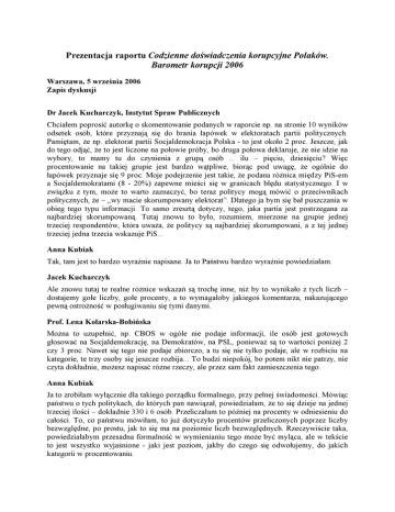 Prezentacja raportu Codzienne doświadczenia korupcyjne Polaków. Barometr korupcji 2006 Warszawa, 5 września 2006 Zapis dyskusji Dr Jacek Kucharczyk, Instytut Spraw Publicznych Chciałem poprosić autorkę o skomentowanie podanych w raporcie np. na stronie 10 wyników odsetek osób, które przyznają się do brania łapówek w elektoratach partii politycznych. Pamiętam, że np. elektorat partii Socjaldemokracja Polska - to jest około 2 proc. Jeszcze, jak do tego odjąć, że to jest liczone na połowie próby, bo druga połowa deklaruje, że nie idzie na wybory, to mamy tu do czynienia z grupą osób ... ilu – pięciu, dziesięciu? Więc procentowanie na takiej grupie jest bardzo wątpliwe, biorąc pod uwagę, że ogólnie do łapówek przyznaje się 9 proc. Moje podejrzenie jest takie, że podana różnica między PiS-em a Socjaldemokratami (8 - 20%) zapewne mieści się w granicach błędu statystycznego. I w związku z tym, może to warto zaznaczyć, bo teraz politycy mogą mówić o przeciwnikach politycznych, że – „wy macie skorumpowany elektorat”. Dlatego ja bym się bał puszczania w obieg tego typu informacji. To samo zresztą dotyczy, tego, jaka partia jest postrzegana za najbardziej skorumpowaną. Tutaj znowu to było, rozumiem, mierzone na grupie jednej trzeciej respondentów, która uważa, że politycy są najbardziej skorumpowani, a z tej jednej trzeciej jedna trzecia wskazuje PiS... Anna Kubiak Tak, tam jest to bardzo wyraźnie napisane. Ja to Państwu bardzo wyraźnie powiedziałam. Jacek Kucharczyk Ale znowu tutaj te realne różnice wskazań są trochę inne, niż by to wynikało z tych liczb – dostajemy gołe liczby, gołe procenty, a to wymagałoby jakiegoś komentarza, nakazującego pewną ostrożność w posługiwaniu się tymi danymi. Prof. Lena Kolarska-Bobińska Można to uzupełnić, np. CBOS w ogóle nie podaje informacji, ile osób jest gotowych głosować na Socjaldemokrację, na Demokratów, na PSL, ponieważ są to wartości poniżej 2 czy 3 proc. Nawet się tego nie podaje zbiorczo, a tu się nie tylko podaje, ale w rozbiciu na kategorie, te trzy osoby się jeszcze rozbija... To budzi niepokój, bo potem nikt nie patrzy, nie czyta dokładnie, możesz napisać różne rzeczy, ale przez sam fakt zamieszczenia tego. Anna Kubiak Ja to zrobiłam wyłącznie dla takiego porządku formalnego, przy pełnej świadomości. Mówiąc państwu o tych politykach, do których pan nawiązał, powiedziałam, że to się dzieje na jednej trzeciej ilości – dokładnie 330 i 6 osób. Przeliczałam to później na procenty w odniesieniu do całości. To, co państwu mówiłam, to już dotyczyło procentów przeliczonych poprzez liczby bezwzględne, po prostu, jak to się ma na poziomie liczb bezwzględnych. Rzeczywiście taka, powiedziałabym przesadna formalność w wymienianiu tego może być myląca, ale w tekście to jest wszystko wyjaśnione - jaki jest poziom, jakby do czego się odwołujemy, do jakich kategorii w procentowaniu. Grażyna Kopińska Ja mając podobne obawy poprosiłam autorkę, żeby podkreśliła, wyboldowała, że 81 proc. badanych stwierdziło, że skorumpowani są wszyscy politycy najwyższego szczebla. Lena Kolarska-Bobińska W elektoratach potem CBOS umieszcza cztery partie - połowę tych wszystkich partii, które tu są uważając, że nie warto podawać reszty, bo to są za niskie dane. Anna Atłas, program Leonardo da Vinci, Fundusz Współpracy Chciałabym zapytać, czy w ogóle państwo uwzględniali w czasie wywiadów taki aspekt, jak korupcja w programach europejskich i czy respondenci podczas wywiadów w ogóle jakoś odnosili się do swoich doświadczeń z programami europejskimi. Być może warto by było kiedyś także objąć to badaniem. Ja stawiam pytanie dlatego, że w ogóle reguły programów europejskich mają wbudowane mechanizmy, które teoretycznie mają korupcji zapobiegać. I bardzo bym też z drugiej strony chciała wiedzieć, czy te mechanizmy są skuteczne. Anna Kubiak Tutaj w wypowiedziach respondentów to się w ogóle nie pojawiło. Trudno mi powiedzieć, jak to może być, państwo uczestnicząc w tych programach mają większe doświadczenie, jaki to jest zasięg. Natomiast z punktu widzenia wypowiedzi respondentów to się w ogóle nie pojawiło, nie mam tutaj żadnych informacji. Maryla Nowicka Kto, komu i na jaką okoliczność daje sto lub mniej złotych - bo to jest około 30 proc. respondentów. Czy to jest napiwek dla salowej w szpitalu, czy to ma jakąś inną wartość? Anna Kubiak Na przykład policji. To się pojawia jako te łapówki bez godności, tzn., że zadowolono się czymś, co jest znacznie mniejsze od wartości mandatu, który się powinno zapłacić. Jacek Wojciechowicz Ja mam takie pytanie - komentarz. W raporcie są zawarte dane z badań Eurobarometru z 2005 r., które są dość ciekawe, ponieważ w świetle tych badań Polacy oceniają siebie na tle innych państw członków Unii Europejskiej jako kraj skorumpowany na siódmym miejscu. W badaniach, które publikuje Transparency International Polska, o ile pamiętam występuje jako najbardziej skorumpowany kraj spośród krajów UE pojawia się pytanie o powód tego. Tutaj jedna z możliwości to jest to, że Transparency ocenia nas przez pryzmat osób z zewnątrz, a nie z punktu widzenia Polaków. Po drugie, to, co ciekawego zauważyłem w tym raporcie, że coraz mniej Polaków przyznaje się do korupcji, na ile to może być powodem ogólnego w tej chwili klimatu potępienia dla korupcji, a również obawy o to, że się zostanie pomówionym o korupcję, czyli na ile wszystkie afery, które się pojawiają, a które nie zawsze się kończą wyrokiem, czy też kończą się tym, że stwierdzono sytuacje korupcyjne - powodują taką sytuację pewnego zagrożenia. Anna Kubiak Co do tych badań, które pan przywołał, ja przywołuję tytułem ilustracji, bo mnie też zdziwiło to przekonanie naszych sąsiadów o skorumpowaniu w