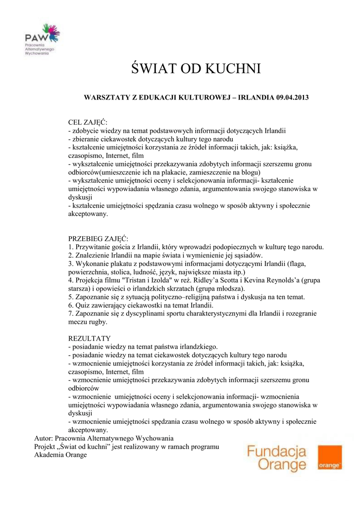ŚWIAT OD KUCHNI WARSZTATY Z EDUKACJI KULTUROWEJ – IRLANDIA 09.04.2013 CEL ZAJĘĆ: - zdobycie wiedzy na temat podstawowych informacji dotyczących Irlandii - zbieranie ciekawostek dotyczących kultury tego narodu - kształcenie umiejętności korzystania ze źródeł informacji takich, jak: książka, czasopismo, Internet, film - wykształcenie umiejętności przekazywania zdobytych informacji szerszemu gronu odbiorców(umieszczenie ich na plakacie, zamieszczenie na blogu) - wykształcenie umiejętności oceny i selekcjonowania informacji- kształcenie umiejętności wypowiadania własnego zdania, argumentowania swojego stanowiska w dyskusji - kształcenie umiejętności spędzania czasu wolnego w sposób aktywny i społecznie akceptowany. PRZEBIEG ZAJĘĆ: 1. Przywitanie gościa z Irlandii, który wprowadzi podopiecznych w kulturę tego narodu. 2. Znalezienie Irlandii na mapie świata i wymienienie jej sąsiadów. 3. Wykonanie plakatu z podstawowymi informacjami dotyczącymi Irlandii (flaga, powierzchnia, stolica, ludność, język, największe miasta itp.) 4. Projekcja filmu "Tristan i Izolda" w reż. Ridley’a Scotta i Kevina Reynolds’a (grupa starsza) i opowieści o irlandzkich skrzatach (grupa młodsza). 5. Zapoznanie się z sytuacją polityczno–religijną państwa i dyskusja na ten temat. 6. Quiz zawierający ciekawostki na temat Irlandii. 7. Zapoznanie się z dyscyplinami sportu charakterystycznymi dla Irlandii i rozegranie meczu rugby. REZULTATY - posiadanie wiedzy na temat państwa irlandzkiego. - posiadanie wiedzy na temat ciekawostek dotyczących kultury tego narodu - wzmocnienie umiejętności korzystania ze źródeł informacji takich, jak: książka, czasopismo, Internet, film - wzmocnienie umiejętności przekazywania zdobytych informacji szerszemu gronu odbiorców - wzmocnienie umiejętności oceny i selekcjonowania informacji- wzmocnienia umiejętności wypowiadania własnego zdania, argumentowania swojego stanowiska w dyskusji - wzmocnienie umiejętności spędzania czasu wolnego w sposób aktywny i społecznie akceptowany. Autor: Pracownia Alternatywnego Wychowania Projekt „Świat od kuchni” jest realizowany w ramach programu Akademia Orange LISTA UCZESTNIKÓW: 1.Aleksandra Cymer 2.Maciej Kozłowski 3.Paulina Ziółkowska 4.Marta Ziółkowska 5.Bartek Sobuń 6.Marcin Chojnacki 7.Grzegorz Pasikowski 8.Justyna Różalska 9.Paulina Rymkiewicz 10. Franciszek Charliński 11. Aleksandra Zawadowska 12. Paulina Milczarek 13. Ewelina Wieczorek 14. Patrycja Siekiera 15. Karina Lubczyńska 16. Patrycja Kozanecka 17. Hanna Janczak 18. Oliwia Szambelan 19. Julia Szambelan 20. Martyna Milczarek 21. Dawid Nowak 22. Jakub Pilarz 23. Andrzej Kozłowski 24. Ganda Reszka 25.Oliwia Jukiel 26. Dawid Jukiel 27. Gabrysia Budzyńska 28. Miłosz Szambelan 29. Hubert Pilarz 30. Franciszek Janczak 31.Mikołaj Sobuń