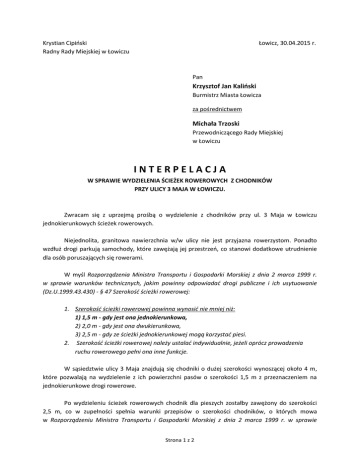 Krystian Cipioski Radny Rady Miejskiej w Łowiczu Łowicz, 30.04.2015 r. Pan Krzysztof Jan Kaliński Burmistrz Miasta Łowicza za pośrednictwem Michała Trzoski Przewodniczącego Rady Miejskiej w Łowiczu INTERPELACJA W SPRAWIE WYDZIELENIA ŚCIEŻEK ROWEROWYCH Z CHODNIKÓW PRZY ULICY 3 MAJA W ŁOWICZU. Zwracam się z uprzejmą prośbą o wydzielenie z chodników przy ul. 3 Maja w Łowiczu jednokierunkowych ścieżek rowerowych. Niejednolita, granitowa nawierzchnia w/w ulicy nie jest przyjazna rowerzystom. Ponadto wzdłuż drogi parkują samochody, które zawężają jej przestrzeo, co stanowi dodatkowe utrudnienie dla osób poruszających się rowerami. W myśl Rozporządzenia Ministra Transportu i Gospodarki Morskiej z dnia 2 marca 1999 r. w sprawie warunków technicznych, jakim powinny odpowiadad drogi publiczne i ich usytuowanie (Dz.U.1999.43.430) - § 47 Szerokośd ścieżki rowerowej: 1. Szerokośd ścieżki rowerowej powinna wynosid nie mniej niż: 1) 1,5 m - gdy jest ona jednokierunkowa, 2) 2,0 m - gdy jest ona dwukierunkowa, 3) 2,5 m - gdy ze ścieżki jednokierunkowej mogą korzystad piesi. 2. Szerokośd ścieżki rowerowej należy ustalad indywidualnie, jeżeli oprócz prowadzenia ruchu rowerowego pełni ona inne funkcje. W sąsiedztwie ulicy 3 Maja znajdują się chodniki o dużej szerokości wynoszącej około 4 m, które pozwalają na wydzielenie z ich powierzchni pasów o szerokości 1,5 m z przeznaczeniem na jednokierunkowe drogi rowerowe. Po wydzieleniu ścieżek rowerowych chodnik dla pieszych zostałby zawężony do szerokości 2,5 m, co w zupełności spełnia warunki przepisów o szerokości chodników, o których mowa w Rozporządzeniu Ministra Transportu i Gospodarki Morskiej z dnia 2 marca 1999 r. w sprawie Strona 1 z 2 warunków technicznych, jakim powinny odpowiadad drogi publiczne i ich usytuowanie (Dz.U.1999.43.430)- § 44 Szerokośd chodnika: 1. Chodnik powinien mied szerokośd dostosowaną do natężenia ruchu pieszych, z zastrzeżeniem ust. 3. 2. Szerokośd chodnika przy jezdni lub przy pasie postojowym nie powinna byd mniejsza niż 2,0 m, a w wypadku przebudowy albo remontu drogi dopuszcza się miejscowe zmniejszenie szerokości chodnika do 1,25 m, jeżeli jest on przeznaczony wyłącznie do ruchu pieszych. 3. Szerokośd chodnika powinna byd odpowiednio zwiększona, jeżeli oprócz ruchu pieszych jest on przeznaczony do usytuowania urządzeo technicznych, w szczególności podpór znaków drogowych, słupów, drzew, wejśd lub zjazdów utrudniających ruch pieszych. 4. Szerokośd chodnika odsuniętego od jezdni lub szerokośd samodzielnego ciągu pieszego nie powinna byd mniejsza niż 1,5 m, a dopuszcza się miejscowe zmniejszenie szerokości chodnika do 1,0 m, jeżeli jest on przeznaczony wyłącznie do ruchu pieszych. 5. Długośd chodnika usytuowanego w ciągu przejśd dla pieszych między jezdniami lub między jezdnią a torowiskiem tramwajowym powinna wynosid nie mniej niż 2,0 m. 6. Urządzenia na chodniku, w szczególności podpory znaków drogowych, słupy oświetleniowe należy tak usytuowad, aby nie utrudniały użytkowania chodnika, w tym przez osoby niepełnosprawne. Warto nadmienid, iż koszt realizacji tego zadania będzie niewielki – zdaje się, że jedynymi kosztami, jakie miałoby ponieśd w tej sprawie miasto byłoby usytuowanie oznakowania pionowego i wymalowanie znaków poziomych. Miasto powinno byd przyjazne dla rowerzystów. Należy stale wyszukiwad rozwiązao, które mogłyby przyczynid się zarówno do poprawy komfortu, jak i bezpieczeostwa osób poruszających się rowerami. Będę wdzięczny za pozytywne ustosunkowanie się do w/w sprawy. Z poważaniem Strona 2 z 2