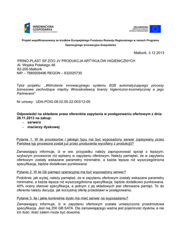 Projekt współfinansowany ze środków Europejskiego Funduszu Rozwoju Regionalnego w ramach Programu Operacyjnego Innowacyjna Gospodarka Malbork, 3.12.2013 PRINO-PLAST SP ZOO JV PRODUKCJA ARTYKUŁÓW HIGIENICZNYCH Al. Wojska Polskiego 48 82-200 Malbork NIP – 7880009496 REGON – 632025730 Tytuł projektu: „Wdrożenie innowacyjnego systemu B2B automatyzującego procesy biznesowe zachodzące między Wnioskodawcą branży higieniczno-kosmetycznej a jego Partnerami” Nr umowy: UDA-POIG.08.02.00-22-003/12-00 Odpowiedzi na składane przez oferentów zapytania w postępowaniu ofertowym z dnia 26.11.2013 na zakup: serwera macierzy dyskowej Pytanie 1. W ile procesorów i jakiego typu ma być wyposażony serwer (opisywany przez Państwa typ procesora został już przez producenta wycofany z produkcji)? Zamawiający informuje, iż w ww. przypadku należy zaproponować sprzęt o lepszym, szybszym procesorze niż wpisany w zapytaniu ofertowym. Należy pamiętać, że w zapytaniu ofertowym zostały wskazane parametry minimalne, a każda lepsza niż wyszczególniona specyfikacja, będzie dodatkowo punktowana. Pytanie 2. W ile Gb pamięci operacyjnej ma być wyposażony serwer? Podobnie, jak wyżej, należy pamiętać, że w zapytaniu ofertowym zostały wskazane parametry minimalne, a każda lepsza niż wyszczególniona specyfikacja, będzie dodatkowo punktowana. 40% oceny stanowi specyfikacja, a jednym z jej składowych jest oferowana pamięć. To do oferenta należy decyzja, jak korzystną ofertę przedstawi w postępowaniu. Pytanie 3. Ile i jakie konkretnie dyski ma mieć serwer na wyposażeniu? Zamawiający informuje, iż w zapytaniu ofertowym została umieszczona przedmiotowa specyfikacja. Jest nią 250 GB SATA. Dla zamawiającego ważna jest pojemność dysków, a nie ich ilość. Ilość zatem może być dowolna. Projekt współfinansowany ze środków Europejskiego Funduszu Rozwoju Regionalnego w ramach Programu Operacyjnego Innowacyjna Gospodarka Pytanie 4. Czy serwer ma być wyposażony w 2 redundantne zasilacze? W związku z tym, że podane kryterium nie znajduje się w zapytaniu ofertowym, oferent może przedstawić sprzęt o dowolnych pod tym względem specyfikacjach. Pytanie 5. Ilu letnia ma być gwarancja na serwer? Czy wymagana jest naprawa serwera na drugi dzień roboczy? W związku z tym, że oferowany serwis stanowi 10% oceny, to do oferenta należy decyzja, jak długą gwarancję przedstawi w postępowaniu. Im lepsza oferta, tym więcej punktów zostaje przydzielonych w przedmiotowym kryterium.