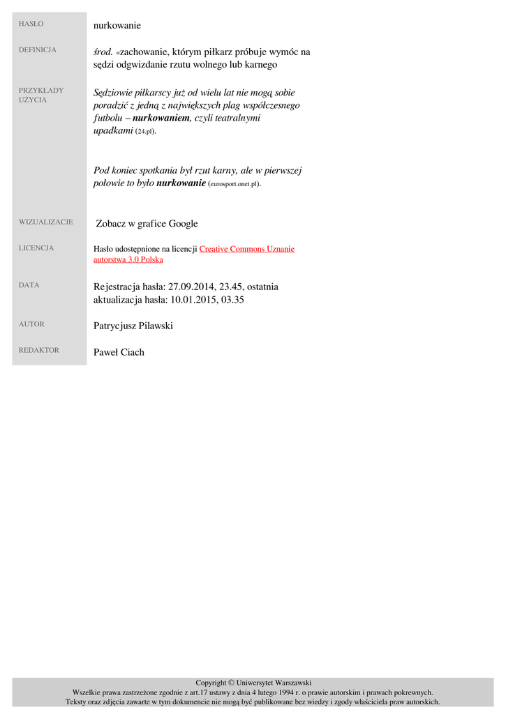 HASŁO nurkowanie DEFINICJA środ. «zachowanie, którym piłkarz próbuje wymóc na sędzi odgwizdanie rzutu wolnego lub karnego» PRZYKŁADY UŻYCIA Sędziowie piłkarscy już od wielu lat nie mogą sobie poradzić z jedną z największych plag współczesnego futbolu – nurkowaniem, czyli teatralnymi upadkami (24.pl). Pod koniec spotkania był rzut karny, ale w pierwszej połowie to było nurkowanie (eurosport.onet.pl). WIZUALIZACJE Zobacz w grafice Google LICENCJA Hasło udostępnione na licencji Creative Commons Uznanie autorstwa 3.0 Polska DATA Rejestracja hasła: 27.09.2014, 23.45, ostatnia aktualizacja hasła: 10.01.2015, 03.35 AUTOR Patrycjusz Pilawski REDAKTOR Paweł Ciach Copyright © Uniwersytet Warszawski Wszelkie prawa zastrzeżone zgodnie z art.17 ustawy z dnia 4 lutego 1994 r. o prawie autorskim i prawach pokrewnych. Teksty oraz zdjęcia zawarte w tym dokumencie nie mogą być publikowane bez wiedzy i zgody właściciela praw autorskich. Powered by TCPDF (www.tcpdf.org)