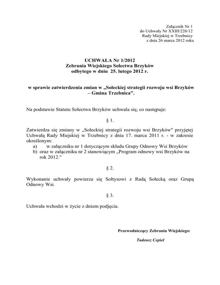 UCHWAŁA Nr 1/2012 Zebrania Wiejskiego