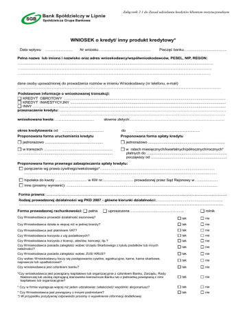 Załącznik 2.1 do Zasad udzielania kredytów klientom instytucjonalnym WNIOSEK o kredyt/ inny produkt kredytowy* Data wpływu ….......................... Nr wniosku….................................................... Pieczęć banku…...................................... Pełna nazwa lub imiona i nazwisko oraz adres wnioskodawcy/współwnioskodawców, PESEL, NIP, REGON: …......................................................................................................................................................................................... …............................................................................................................................................................................................................ …........................................................................................................................................................................................................... dane osoby upoważnionej do prowadzenia rozmów w imieniu Wnioskodawcy (nr telefonu, e-mail) …...................................................................................................................................................................................................................... Podstawowe informacje o wnioskowanej transakcji: KREDYT OBROTOWY …........................................................................................................................................................ KREDYT INWESTYCYJNY ...................................................................................................................................................... INNY ……………………….. .….................................................................................................................................................. przeznaczenie kredytu: ………………………………………………………..…………………………………………………………… ……………………………………………………………………………………………………………………. wnioskowana kwota: …...................................... okres kredytowania: od słownie złotych:…………………………………………………………………. do …........................................ Proponowana forma uruchomienia kredytu …................................................................. Proponowana forma spłaty kredytu jednorazowo ........................................................ jednorazowo .......................................................................... w transzach …............................................................... …........................................................................................ w ratach miesięcznych/kwartalnych/półrocznych/rocznych* płatnych do ….......................................................................... począwszy od …...................................................................... Proponowana forma prawnego zabezpieczenia spłaty kredytu: poręczenie wg prawa cywilnego/wekslowego*…........................................................................................................... .......................................................................................................................................................................................... hipoteka do kwoty …........................... w KW nr.............................. prowadzonej przez Sąd Rejonowy w ….................. inne (prosimy wymienić): ….............................................................................................................................................. Forma prawna: ................................................................................................................................................. Rodzaj prowadzonej działalności wg PKD 2007 - główne kierunki działalności:................................................................ …....................................................................................................................................................................................................................... Forma prowadzonej rachunkowości: pełna uproszczona ……………………………………. rolnik Czy Wnioskodawca prowadzi działalność sezonową? tak nie Czy Wnioskodawca działa w więcej niż w jednej branży? tak nie Czy Wnioskodawca jest płatnikiem VAT? tak nie Czy Wnioskodawca korzysta z ulg podatkowych? tak nie Czy Wnioskodawca korzysta z licencji, atestów, koncesji, itp.? Czy Wnioskodawca posiada zaległości wobec Urzędu Skarbowego z tytułu podatków lub innych należności? tak nie tak nie Czy Wnioskodawca posiada zaległości wobec ZUS/ KRUS? tak nie Czy wobec Wnioskodawcy toczy się postępowanie cywilne, egzekucyjne, karne, karne skarbowe, naprawcze lub upadłościowe? tak nie Czy wnioskodawca jest członkiem banku? tak nie *Czy wnioskodawca jest powiązany kapitałowo lub organizacyjnie z członkiem Banku, Zarządu, Rady Nadzorczej lub osobą zajmującą stanowisko kierownicze Banku lub z jednostką powiązaną z nimi kapitałowo lub organizacyjnie? tak nie * Czy w firmie występuje więcej niż jeden udziałowiec (właściciel)/ wspólnik/ akcjonariusz? tak nie * Czy Wnioskodawca jest powiązany z innymi podmiotami? *) W przypadku pozytywnej odpowiedzi prosimy o wypełnienie informacji dodatkowej tak nie Forma własności głównego miejsca prowadzonej działalności: własność wynajem/ dzierżawa działalność nie wymaga stałego miejsca Zatrudnienie w firmie: …...................... osób Informacja o obrotach na rachunkach w innych bankach: średniomiesięczne wpływy z ostatnich nazwa banku 12 miesięcy …........................................ średnie wpływy z ostatniego miesiąca ….........