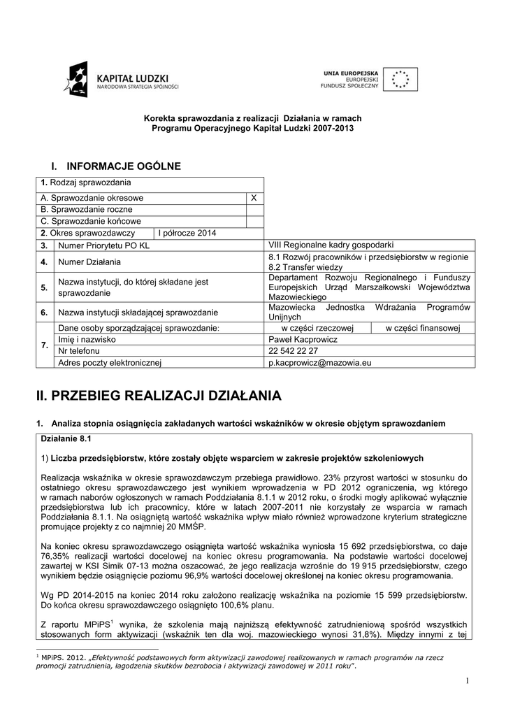 Korekta sprawozdania z realizacji Działania w ramach Programu Operacyjnego Kapitał Ludzki 2007-2013 I. INFORMACJE OGÓLNE 1. Rodzaj sprawozdania A. Sprawozdanie okresowe B. Sprawozdanie roczne C. Sprawozdanie końcowe 2. Okres sprawozdawczy X I półrocze 2014 3. Numer Priorytetu PO KL 4. Numer Działania 5. Nazwa instytucji, do której składane jest sprawozdanie 6. Nazwa instytucji składającej sprawozdanie 7. Dane osoby sporządzającej sprawozdanie: Imię i nazwisko Nr telefonu Adres poczty elektronicznej VIII Regionalne kadry gospodarki 8.1 Rozwój pracowników i przedsiębiorstw w regionie 8.2 Transfer wiedzy Departament Rozwoju Regionalnego i Funduszy Europejskich Urząd Marszałkowski Województwa Mazowieckiego Mazowiecka Jednostka Wdrażania Programów Unijnych w części rzeczowej w części finansowej Paweł Kacprowicz 22 542 22 27 [email protected] II. PRZEBIEG REALIZACJI DZIAŁANIA 1. Analiza stopnia osiągnięcia zakładanych wartości wskaźników w okresie objętym sprawozdaniem Działanie 8.1 1) Liczba przedsiębiorstw, które zostały objęte wsparciem w zakresie projektów szkoleniowych Realizacja wskaźnika w okresie sprawozdawczym przebiega prawidłowo. 23% przyrost wartości w stosunku do ostatniego okresu sprawozdawczego jest wynikiem wprowadzenia w PD 2012 ograniczenia, wg którego w ramach naborów ogłoszonych w ramach Poddziałania 8.1.1 w 2012 roku, o środki mogły aplikować wyłącznie przedsiębiorstwa lub ich pracownicy, które w latach 2007-2011 nie korzystały ze wsparcia w ramach Poddziałania 8.1.1. Na osiągniętą wartość wskaźnika wpływ miało również wprowadzone kryterium strategiczne promujące projekty z co najmniej 20 MMŚP. Na koniec okresu sprawozdawczego osiągnięta wartość wskaźnika wyniosła 15 692 przedsiębiorstwa, co daje 76,35% realizacji wartości docelowej na koniec okresu programowania. Na podstawie wartości docelowej zawartej w KSI Simik 07-13 można oszacować, że jego realizacja wzrośnie do 19 915 przedsiębiorstw, czego wynikiem będzie osiągnięcie poziomu 96,9% wartości docelowej określonej na koniec okresu programowania. Wg PD 2014-2015 na koniec 2014 roku założono realizację wskaźnika na poziomie 15 599 przedsiębiorstw. Do końca okresu sprawozdawczego osiągnięto 100,6% planu. Z raportu MPiPS1 wynika, że szkolenia mają najniższą efektywność zatrudnieniową spośród wszystkich stosowanych form aktywizacji (wskaźnik ten dla woj. mazowieckiego wynosi 31,8%). Między innymi z tej 1 MPiPS. 2012. „Efektywność podstawowych form aktywizacji zawodowej realizowanych w ramach programów na rzecz promocji zatrudnienia, łagodzenia skutków bezrobocia i aktywizacji zawodowej w 2011 roku”. 1 przyczyny projekty zawierające tę formę łączone są z doradztwem, a przede wszystkim z subsydiowanym zatrudnieniem. Obie te formy mają znaczenie przede wszystkim, jako wsparcie skuteczności szkoleń. Badanie wskazuje, że programy szkoleniowe przynoszą lepsze rezultaty, jeśli są zaprojektowane we współpracy z pracodawcami i innymi zainteresowanymi stronami oraz obejmują szkolenie w miejscu pracy. Również łączenie szkoleń z intensywnym wsparciem w poszukiwaniu pracy (w szczególności w przypadku indywidualnych planów działania) może znacząco poprawić ich skuteczność 2. Jednocześnie, należy mieć na uwadze, że podstawowym celem Poddziałania 8.1.1, w ramach którego realizowane jest wsparcie, to rozwój osób zatrudnionych w przedsiębiorstwach. 2) Liczba pracujących osób dorosłych, które zakończyły udział w projektach szkoleniowych Wskaźnik został osiągnięty na poziomie 126 422 osób, tj. 375,47% wartości docelowej na cały okres programowania. Biorąc pod uwagę wartość docelową wskaźnika zawartą w KSI wynoszącą 131 766 osób wskaźnik zostanie zrealizowany w 391%. Liczba osób po 50. roku życia osiągnęła wartość 21 626 realizując tym samym 331,79% wartości docelowej wskaźnika. Wg PD 2014-2015 planowana wartość wskaźnika do osiągnięcia na koniec 2014 roku to 133 303 osób. Na koniec okresu sprawozdawczego plan zrealizowano w 94,84%. W PD 2014-2015 założono, że podwskaźnik dotyczący osób powyżej 50-go roku życia osiągnie do końca roku wartość 19 902 osób. Na koniec okresu sprawozdawczego plan zrealizowano w 108,7%. 3) Liczba pracowników o niskich kwalifikacjach, którzy zakończyli udział w projektach. Realizacja wskaźnika na koniec okresu sprawozdawczego osiągnęła wartość 32 830 realizując tym samym 110,74% wartości docelowej na cały okres programowania. Wg PD 2014-2015 na koniec 2014 roku założono realizację wskaźnika na poziomie 38 447 osób. Do końca okresu sprawozdawczego osiągnięto 85% planu. Osiągnięcie wartości docelowej wskaźnika możliwe było dzięki poczynionym działaniom IP2 prowadzącym do zwiększenia udziału pracowników o niskich kwalifikacjach w projektach. Pierwszym krokiem było ogłoszenie konkursu zamkniętego 2/POKL/8.1.2/2012, gdzie zgodnie z PD 2012 premiowane były projekty, w których co najmniej 50% uczestników posiada co najwyżej średnie wykształcenie. Kolejnym etapem było wprowadzenie takiego samego kryterium strategicznego w ramach konkursu zamkniętego 1/POKL/8.1.1/2012. Wartość ogółem wskaźnika "Liczba pracowników o niskich kwalifikacjach, którzy zakończyli udział w projektach" w kolumnie Mp została zwiększona o 100 w relacji do wartości wykazanej w KSI. Jest to korekta błędu wynikłego podczas wprowadzania danych do KSI. 4) Liczba przedsiębiorstw, których pracownicy zakończyli udział w szkoleniach w ramach projektu. Wskaźnik został zrealizowany na poziomie 13 976 przedsiębiorstw, w okresie sprawozdawczym wskaźnik wzrósł o 3999 przedsiębiorstwa. W wyniku problemów technicznych związanych z eksportem bazy danych PEFS wskaźnik został urealniony o wartości wykazane w poprzednim okresie sprawozdawczym. Wg PD 2014-2015 planowana wartość wskaźnika do o