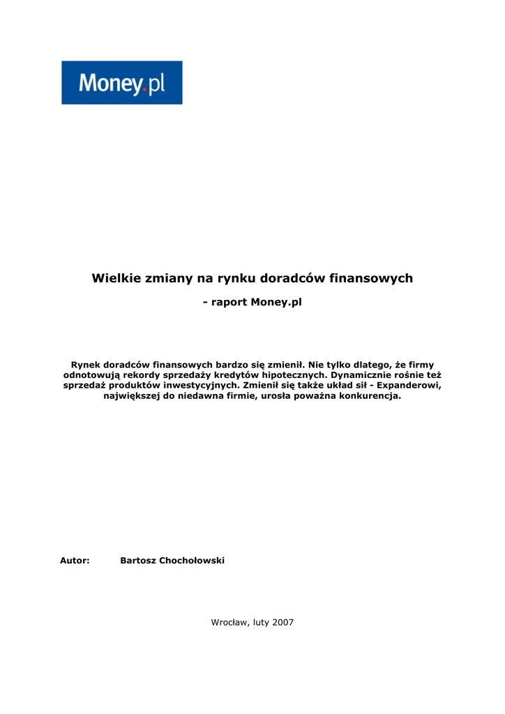 Wielkie zmiany na rynku doradców finansowych - raport Money.pl Rynek doradców finansowych bardzo się zmienił. Nie tylko dlatego, Ŝe firmy odnotowują rekordy sprzedaŜy kredytów hipotecznych. Dynamicznie rośnie teŜ sprzedaŜ produktów inwestycyjnych. Zmienił się takŜe układ sił - Expanderowi, największej do niedawna firmie, urosła powaŜna konkurencja. Autor: Bartosz Chochołowski Wrocław, luty 2007 Miniony rok był niezwykle ciekawy na rynku. Wyniki sprzedaŜy firm przerosły prognozy i to bardzo znacznie - wyniki były nawet o 200 proc. lepsze, niŜ oczekiwano. Wyniki doradców finansowych są pochodną boomu na rynku kredytów hipotecznych. W 2006 roku na cele mieszkaniowe poŜyczyliśmy aŜ trzy razy więcej niŜ w 2004 roku. Według "Rzeczpospolitej" wartość rynku kredytów hipotecznych w minionym roku wyniosła 43,5 mld zł. Gazeta zbadała akcje kredytową największych banków. Te dane zbieŜne są z wyliczeniami Związków Banków Polskich. Z tych 43,5 mld zł klienci poŜyczyli 7 mld za pośrednictwem tylko trzech największych brokerów finansowych. Co szósty kredyt został więc zaciągnięty nie bezpośrednio w banku. Nastąpił olbrzymi skok wartości kredytów udzielanych przez firmy doradcze - o 160 proc. W 2005 roku trzej najwięksi brokerzy poŜyczyli 2,7 mld. Porównując ubiegłoroczne dane z 2004 rokiem, skok jest jeszcze bardziej imponujący - aŜ 536-procentowy. Mówimy tylko o trójce największych graczy, firmach Expander, Open Finance i Notus. Gdyby zliczyć wyniki dziesiątek małych firm, wynik byłby jeszcze bardziej imponujący. Expander planował, Ŝe w 2006 roku będzie pośredniczył w udzieleniu kredytów wartych 2 mld zł. Tymczasem po podsumowaniu roku okazało się, Ŝe ich wartość wyniosła 3,3 mld zł. Tak niska - jak się okazało - prognoza, wynikała z dwóch przyczyn. Sporo się wtedy mówiło o planach wprowadzenia ograniczeń w udzielaniu kredytów walutowych. Istniała obawa, Ŝe Komisja Nadzoru Bankowego wprowadzi znacznie bardziej rygorystyczne zasady, niŜ wprowadzona w lipcu Rekomendacja S. Według wiedzy z początku 2006 roku ostroŜność w szacowaniu sprzedaŜy była wskazana. "Te prognozy uwzględniają zamieszanie na rynku, do którego moŜe dojść, jeśli zostaną wprowadzone obostrzenia przy udzielaniu kredytów walutowych. MoŜe to wielu klientów zniechęcić. Jednak trudno będzie ten rynek zepsuć. 2 Poza tym niektóre banki nie będą miały problemów ze spełnieniem nowych wymogów, poza tym będą omijać surowe regulacje" - wypowiadał się na łamach Money.pl w lutym 2006 roku Maciej Kossowski. Choć regulacje okazały nie tak surowe, to banki i tak je skutecznie omijają. Poza tym dziś Maciej Kossowski wyjaśnia, Ŝe były pewne problemy z raportowaniem wyników z firm partnerskich i pełne wyniki znane były z opóźnieniem. Dlatego teŜ prognozowanie było trudniejsze. W prognozach pomyliły się zresztą wszystkie firmy. W kaŜdym razie dziś Expander na wszelki wypadek nie podaje prognozy na 2007 rok. Jeszcze w 2005 roku sytuacja na rynku wyglądała tak, Ŝe był Expander, a za nim długo, długo nic, a konkurencja daleko w tyle. Po 2006 roku moŜna śmiało powiedzieć, Ŝe na rynku mamy dwóch duŜych doradców. Expanderowi zaczął deptać po piętach Open Finance. O ile w 2005 roku miał sprzedaŜ prawie dwa razy niŜszą (1,5 mld Expandera wobec 840 tys. Open Finance), to po 2006 roku 3,3 mld wobec 3 mld nie jest juŜ duŜym dystansem. Co ciekawe, w tym samym materiale z lutego 2006 roku, prezes Open Finance Jarosław Augustyniak prognozował sprzedaŜ na poziomie 1,5 mld zł. Tak więc o ile Expander pomylił się o jedną trzecią, to OF sprzedał prawie dwukrotnie więcej, niŜ planował. Zapewne dlatego OF równieŜ nie dzieli się prognozami na 2007 rok. Nadrobienie róŜnicy wymagało od Open trzyipółkrotnego zwiększenia sprzedaŜy. Niesamowity wzrost firma zawdzięcza temu, Ŝe jednak w 2005 roku była w trakcie tworzenia i sieć placówek dopiero powstawała. Jak juŜ powstały, to zgarniały klientów z rynku. Czy firma przegoni w tym roku Expandera? Przynajmniej według oficjalnych wypowiedzi, nie jest to jej celem. "Mamy ambicje być najlepszą firmą na rynku. Jeśli realizując ten cel staniemy się takŜe największą, to dobrze, a nie mamy zamiaru ścigać się z Expanderem" - mówi Krzysztof Olszewski z Open Finance. Firmy nie traktują się wrogo - przynajmniej w oficjalnych wypowiedziach ich przedstawicieli. Maciej Kossowski mówi, Ŝe nie boją się Open Finance i nie zamierzają koncentrować się na "uciekaniu" przed goniącą konkurencją. Wolą skupić się na tworzeniu nowych ofert, głównie inwestycyjnych. Tak więc przynajmniej w warstwie werbalnej nie ma wojny, ale zapewne specjaliści z obu firm bacznie patrzą na słupki i w ich "sztabach" atmosfera nie jest pokojowa. Trzeci gracz odstaje - przynajmniej na razie - od wielkiej dwójki. Notus z roku na rok podwaja swoją sprzedaŜ, ale na razie 3 z kredytami wartymi 800 tys. zł nie moŜe zagrozić Open Finance ani tym bardziej Expanderowi. Jednak ponad stuprocentowy wzrost godny jest uznania, tym bardziej, Ŝe firma planowała 70-procentowy. Najbardziej dynamiczna firma roku 2006 jest daleko od podium, ale jeśli utrzyma dynamikę wzrostu, w przyszłym roku moŜe być juŜ widoczna wśród największych. Chodzi o Goldenegg, które ze sprzedaŜą kredytów o wartości 395 tys. zł nie imponuje, ale wzrost o ponad 300 proc. w stosunku do roku 2005 juŜ tak. To młoda firma, więc wzrost wynika z niewielkiej bazy, ale i tak rzuca się w oczy dzięki takiej dynamice. Jeśli spełnią się prognozy firmy, to w tym roku za ich pośrednictwem sprzedane zostaną kredyty warte 800 tys. zł. Goldenegg miał trzystuprocentowy wzrost, a planował stuprocentowy - z wymienionych firm najbardziej się pomylił. Jednak doradcy finansowi to nie tylko temat kredytów hipotecznych. Polacy coraz chętniej aktywnie oszczędzaj