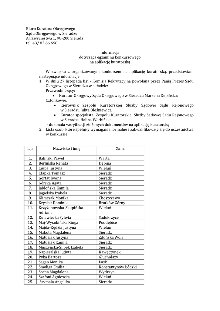 Biuro Kuratora Okręgowego Sądu Okręgowego w Sieradzu Al. Zwycięstwa 1, 98-200 Sieradz tel; 43/ 82 66 690 Informacja dotycząca egzaminu konkursowego na aplikację kuratorską W związku z organizowanym konkursem na aplikację kuratorską, przedstawiam następujące informacje: 1. W dniu 27 listopada b.r. - Komisja Rekrutacyjna powołana przez Panią Prezes Sądu Okręgowego w Sieradzu w składzie: Przewodniczący: Kurator Okręgowy Sądu Okręgowego w Sieradzu Marzena Depińska; Członkowie: Kierownik Zespołu Kuratorskiej Służby Sądowej Sądu Rejonowego w Sieradzu Julita Oleśniewicz; Kurator specjalista Zespołu Kuratorskiej Służby Sądowej Sądu Rejonowego w Sieradzu Halina Werbińska; - dokonała weryfikacji złożonych dokumentów na aplikację kuratorską. 2. Lista osób, które spełniły wymagania formalne i zakwalifikowały się do uczestnictwa w konkursie: L.p. 1. 2. 3. 4. 5. 6. 7. 8. 9. 10. 11. 12. 13. 14. 15. 16. 17. 18. 19. 20. 21. 22. 23. 24. 25. Nazwisko i imię Baliński Paweł Berlińska Renata Ciupa Justyna Cłapka Tomasz Gortat Iwona Górska Agata Jabłońska Kamila Jagielska Izabela Klimczak Monika Krysiak Dominik Krzyżanowska-Skupińska Adriana Kulawiecka Sylwia Maj-Wysokińska Kinga Majda-Kędzia Justyna Makota Magdalena Matusiak Justyna Matusiak Kamila Muszyńska-Ślipek Izabela Napieralska Judyta Pyka Bartosz Sagan Monika Smoliga Emilia Socha Magdalena Szafoni Agnieszka Szymala Angelika Zam. Warta Dębina Wieluń Sieradz Sieradz Sieradz Sieradz Sieradz Choszczewo Bratków Górny Wieluń Sadokrzyce Poddębice Wieluń Sieradz Zduńska Wola Sieradz Sieradz Kawęczynek Głuchołazy Łask Konstantynów Łódzki Wydrzyn Wieluń Sieradz 26. 27. 28. Szymczak Paulina Świtała Ewelina Wojtysiak Sylwia Dąbrówka Smardzew Sieradz 3. Zasady Egzaminu konkursowego na aplikację kuratorską. a) Na Egzamin Konkursowy należy zgłosić się z dowodem osobistym i długopisem. b) Część pisemna odbędzie się w formie testu kwalifikacyjnego - pytania testowe, oraz pytania opisowe z wiedzy ogólno - społecznej, resocjalizacyjnej, pedagogicznej oraz znajomości ustawy z dnia 27 lipca 2001roku o kuratorach sądowych. c) Dziesięć* osób, które uzyskają największą liczbę punktów zostaną zakwalifikowane do dalszego etapu konkursu – II części ustnej Egzaminu. d) Część ustna odbędzie się w formie rozmowy kwalifikacyjnej i odpowiedzi na wylosowany zestaw pytań ze znajomości ustawy z dnia 27 lipca 2001roku o kuratorach sądowych oraz zagadnień z dziedziny resocjalizacji i pedagogiki. Terminy Egzaminów: Część I pisemna – 12 grudnia 2013r g.12.00 (sala konferencyjna Sądu Okręgowego w Sieradzu); Część II ustna – 13 grudnia 2013r g. 10.00 (sala konferencyjna Sądu Okręgowego w Sieradzu). Zabrania się wnoszenia na salę egzaminacyjną telefonów komórkowych, aparatów fotograficznych i innych urządzeń umożliwiających utrwalanie obrazu lub transport danych. Zachowania kandydatów nie mieszczące się w kanonach zachowań w trakcie Egzaminu lub ujawnienie wniesienia na salę egzaminacyjną urządzeń, o których mowa powyżej, będzie skutkowało usunięciem kandydata z sali egzaminacyjnej i przyznanie liczby „0" punktów. Kurator Okręgowy Marzena Depińska * Liczba ta może zwiększyć się w przypadku uzyskania przez kandydatów tej samej liczby punktów.