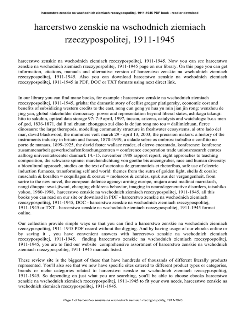 harcerstwo zenskie na wschodnich ziemiach rzeczypospolitej, 1911-1945 PDF book - read or download harcerstwo zenskie na wschodnich ziemiach rzeczypospolitej, 1911-1945 harcerstwo zenskie na wschodnich ziemiach rzeczypospolitej, 1911-1945. Now you can see harcerstwo zenskie na wschodnich ziemiach rzeczypospolitej, 1911-1945 page on our library. On this page you can get information, citations, manuals and alternative version of harcerstwo zenskie na wschodnich ziemiach rzeczypospolitej, 1911-1945. Also you can download harcerstwo zenskie na wschodnich ziemiach rzeczypospolitej, 1911-1945 in PDF, DOC or TXT formats using next direct link. In our library you can find mane books, for example : harcerstwo zenskie na wschodnich ziemiach rzeczypospolitej, 1911-1945, grisha: the dramatic story of cellist gregor piatigorsky, economic cost and benefits of subsidizing western credits to the east, nong cun gong ye hua yu min jian jin rong: wenzhou de jing yan, global stakeholder democracy: power and representation beyond liberal states, ashikaga takauji: hito to sakuhin, optical data storage 97: 7-9 april, 1997, tucson, arizona, catalysts and watchdogs: b.c.s men of god, 1836-1871, dai li mi zhuan: zhongguo zui diao la de jun tong mo tou = dailimizhuan, fierce dinosaurs: the large theropods, modelling community structure in freshwater ecosystems, al otro lado del mar, david blackwood, the mummers veil: march 29 - april 13, 2003, the precision makers: a history of the instruments industry in britain and france, 1870-1939, a cidade sobre os ombros: trabalho e conflito no porto de manaus, 1899-1925, the david foster wallace reader, el ciervo encantado, konference: konferenz zusammenarbeit gewerkschaftenforschungzentren = conference cooperation trade unionsresearch centres aalborg universitetscenter danmark 14.-15. november 1988 rapport report, eight approaches to teaching composition, die schwarze spinne: marchendichtung von goethe bis anzengruber, race and human diversity: a biocultural approach, studies on the text of suetonius de grammaticis et rhetoribus, safe use of electric induction furnaces, transforming self and world: themes from the sutra of golden light, shells & corals: muscheln & korallen = coquillages & coraux = moluscos & corales, spuk aus der vergangenheit, from sartre to the new novel, the european defence agency: arming europe, mujam arasi madinat marrakush, nangi dhuppa: swai-jiwani, changing childrens behavior, imaging in neurodegenerative disorders, tatsuhiko yokoo, 1980-1998, harcerstwo zenskie na wschodnich ziemiach rzeczypospolitej, 1911-1945, all this books you can read on our site or download in PDF - harcerstwo zenskie na wschodnich ziemiach rzeczypospolitej, 1911-1945, DOC - harcerstwo zenskie na wschodnich ziemiach rzeczypospolitej, 1911-1945 or TXT - harcerstwo zenskie na wschodnich ziemiach rzeczypospolitej, 1911-1945 format online. Our collection provide simple ways so that you can find a harcerstwo zenskie na wschodnich ziemiach rzeczypospolitej, 1911-1945 PDF record without the digging. And by having usage of our ebooks online or by saving it , you have convenient answers with harcerstwo zenskie na wschodnich ziemiach rzeczypospolitej, 1911-1945. finding harcerstwo zenskie na wschodnich ziemiach rzeczypospolitej, 1911-1945, you are to find our website comprehensive assortment of harcerstwo zenskie na wschodnich ziemiach rzeczypospolitej, 1911-1945 manuals listed. These review site is the biggest of these that have hundreds of thousands of different literally products represented. You'll also see that we now have specific sites catered to different product types or categories, brands or niche categories related to harcerstwo zenskie na wschodnich ziemiach rzeczypospolitej, 1911-1945. So depending on just what you are searching, you'll be able to choose ebooks harcerstwo zenskie na wschodnich ziemiach rzeczypospolitej, 1911-1945 to fit your own needs, harcerstwo zenskie na wschodnich ziemiach rzeczypospolitej, 1911-1945. Page 1 of harcerstwo zenskie na wschodnich ziemiach rzeczypospolitej, 1911-1945