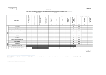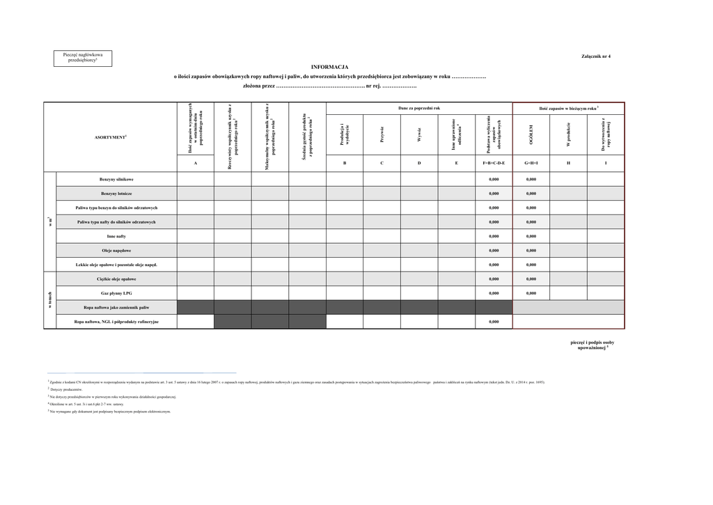 Pieczęć nagłówkowa przedsiębiorcy5 Załącznik nr 4 INFORMACJA o ilości zapasów obowiązkowych ropy naftowej i paliw, do utworzenia których przedsiębiorca jest zobowiązany w roku ………………. Produkcja i wydobycie Przywóz Wywóz Inne uprawnione odliczenia 4 Podstawa wyliczenia zapasów obowiązkowych OGÓŁEM W produkcie Do wytworzenia z ropy naftowej Średnia gęstość produktu z poprzedniego roku 2 Maksymalny współczynnik uzysku z poprzedniego roku 2 Ilość zapasów w bieżącym roku 3 Dane za poprzedni rok B C D E F=B+C-D-E G=H+I H I Benzyny silnikowe 0,000 0,000 Benzyny lotnicze 0,000 0,000 Paliwa typu benzyn do silników odrzutowych 0,000 0,000 Paliwa typu nafty do silników odrzutowych 0,000 0,000 Inne nafty 0,000 0,000 Oleje napędowe 0,000 0,000 Lekkie oleje opałowe i pozostałe oleje napęd. 0,000 0,000 Ciężkie oleje opałowe 0,000 0,000 Gaz płynny LPG 0,000 0,000 w tonach w m3 A Rzeczywisty współczynnik uzysku z poprzedniego roku 2 ASORTYMENT1 Ilość zapasów wymaganych w ostatnim dniu poprzedniego roku złożona przez …………………………………………. nr rej. ………………. Ropa naftowa jako zamiennik paliw Ropa naftowa, NGL i półprodukty rafineryjne 0,000 pieczęć i podpis osoby upoważnionej 5 1 Zgodnie 2 z kodami CN określonymi w rozporządzeniu wydanym na podstawie art. 3 ust. 5 ustawy z dnia 16 lutego 2007 r. o zapasach ropy naftowej, produktów naftowych i gazu ziemnego oraz zasadach postępowania w sytuacjach zagrożenia bezpieczeństwa paliwowego państwa i zakłóceń na rynku naftowym (tekst jedn. Dz. U. z 2014 r. poz. 1695). Dotyczy producentów. 3 Nie dotyczy przedsiębiorców w pierwszym roku wykonywania działalności gospodarczej. 4 Określone 5 w art. 5 ust. 3i i ust.6 pkt 2-7 ww. ustawy. Nie wymagane gdy dokument jest podpisany bezpiecznym podpisem elektronicznym.
