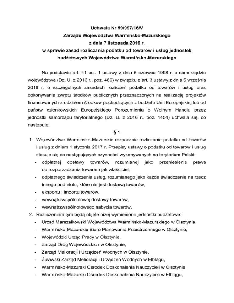Uchwała Nr 59/997/16/V Zarządu Województwa Warmińsko-Mazurskiego z dnia 7 listopada 2016 r. w sprawie zasad rozliczania podatku od towarów i usług jednostek budżetowych Województwa Warmińsko-Mazurskiego Na podstawie art. 41 ust. 1 ustawy z dnia 5 czerwca 1998 r. o samorządzie województwa (Dz. U. z 2016 r., poz. 486) w związku z art. 3 ustawy z dnia 5 września 2016 r. o szczególnych zasadach rozliczeń podatku od towarów i usług oraz dokonywania zwrotu środków publicznych przeznaczonych na realizację projektów finansowanych z udziałem środków pochodzących z budżetu Unii Europejskiej lub od państw członkowskich Europejskiego Porozumienia o Wolnym Handlu przez jednostki samorządu terytorialnego (Dz. U. z 2016 r., poz. 1454) uchwala się, co następuje: §1 1. Województwo Warmińsko-Mazurskie rozpocznie rozliczanie podatku od towarów i usług z dniem 1 stycznia 2017 r. Przepisy ustawy o podatku od towarów i usług stosuje się do następujących czynności wykonywanych na terytorium Polski: - odpłatnej dostawy towarów, rozumianej jako przeniesienie prawa do rozporządzania towarem jak właściciel, - odpłatnego świadczenia usług, rozumianego jako każde świadczenie na rzecz innego podmiotu, które nie jest dostawą towarów, - eksportu i importu towarów, - wewnątrzwspólnotowej dostawy towarów, - wewnątrzwspólnotowego nabycia towarów. 2. Rozliczeniem tym będą objęte niżej wymienione jednostki budżetowe: - Urząd Marszałkowski Województwa Warmińsko-Mazurskiego w Olsztynie, - Warmińsko-Mazurskie Biuro Planowania Przestrzennego w Olsztynie, - Wojewódzki Urząd Pracy w Olsztynie, - Zarząd Dróg Wojewódzkich w Olsztynie, - Zarząd Melioracji i Urządzeń Wodnych w Olsztynie, - Żuławski Zarząd Melioracji i Urządzeń Wodnych w Elblągu, - Warmińsko-Mazurski Ośrodek Doskonalenia Nauczycieli w Olsztynie, - Warmińsko-Mazurski Ośrodek Doskonalenia Nauczycieli w Elblągu, - Warmińsko - Mazurska Biblioteka Pedagogiczna im. prof. Tadeusza Kotarbińskiego w Olsztynie, - Warmińsko - Mazurska Biblioteka Pedagogiczna im. Karola Wojtyły w Elblągu, - Szkoła Policealna im. prof. Zbigniewa Religi w Olsztynie, - Szkoła Policealna im. J. Romanowskiej w Elblągu, - Szkoła Policealna w Ełku, - Zespół Szkół z Ukraińskim Językiem Nauczania w Górowie Iławeckim, - Biuro Regionalne Województwa Warmińsko-Mazurskiego w Brukseli, - Mazurski Park Krajobrazowy w Krutyni, - Zespół Parków Krajobrazowych Pojezierza Iławskiego i Wzgórz Dylewskich w Jerzwałdzie, - Park Krajobrazowy Puszczy Rominckiej w Żytkiejmach, - Park Krajobrazowy Wysoczyzny Elbląskiej w Elblągu, - Welski Park Krajobrazowy w Jeleniu, - Warmińsko-Mazurski Ośrodek Adopcyjny w Olsztynie. §2 Kierowników jednostek budżetowych Województwa Warmińsko-Mazurskiego wymienionych w § 1 ust. 2 zobowiązuje się do przestrzegania przepisów ordynacji podatkowej, ustawy o podatku od towarów i usług, rozporządzeń wykonawczych do tej ustawy oraz postanowień niniejszej Uchwały. §3 Przyjmuje się zasady prowadzenia ewidencji i rozliczeń podatku od towarów i usług przez Województwo Warmińsko-Mazurskie stanowiące załącznik do niniejszej uchwały. §4 Wykonanie uchwały powierza się Skarbnikowi Województwa Warmińsko- Mazurskiego. §5 Uchwała wchodzi w życie z dniem podjęcia. Przewodniczący Zarządu Województwa Warmińsko-Mazurskiego Gustaw Marek Brzezin