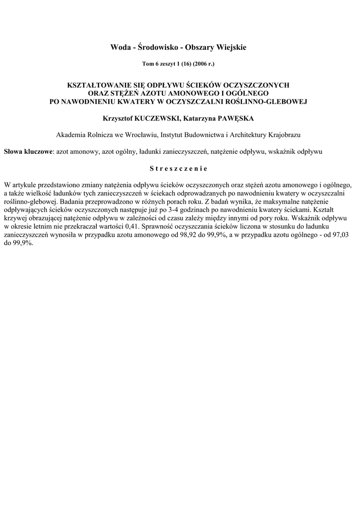 Woda - Środowisko - Obszary Wiejskie Tom 6 zeszyt 1 (16) (2006 r.) KSZTAŁTOWANIE SIĘ ODPŁYWU ŚCIEKÓW OCZYSZCZONYCH ORAZ STĘŻEŃ AZOTU AMONOWEGO I OGÓLNEGO PO NAWODNIENIU KWATERY W OCZYSZCZALNI ROŚLINNO-GLEBOWEJ Krzysztof KUCZEWSKI, Katarzyna PAWĘSKA Akademia Rolnicza we Wrocławiu, Instytut Budownictwa i Architektury Krajobrazu Słowa kluczowe: azot amonowy, azot ogólny, ładunki zanieczyszczeń, natężenie odpływu, wskaźnik odpływu Streszczenie W artykule przedstawiono zmiany natężenia odpływu ścieków oczyszczonych oraz stężeń azotu amonowego i ogólnego, a także wielkość ładunków tych zanieczyszczeń w ściekach odprowadzanych po nawodnieniu kwatery w oczyszczalni roślinno-glebowej. Badania przeprowadzono w różnych porach roku. Z badań wynika, że maksymalne natężenie odpływających ścieków oczyszczonych następuje już po 3-4 godzinach po nawodnieniu kwatery ściekami. Kształt krzywej obrazującej natężenie odpływu w zależności od czasu zależy między innymi od pory roku. Wskaźnik odpływu w okresie letnim nie przekraczał wartości 0,41. Sprawność oczyszczania ścieków liczona w stosunku do ładunku zanieczyszczeń wynosiła w przypadku azotu amonowego od 98,92 do 99,9%, a w przypadku azotu ogólnego - od 97,03 do 99,9%.