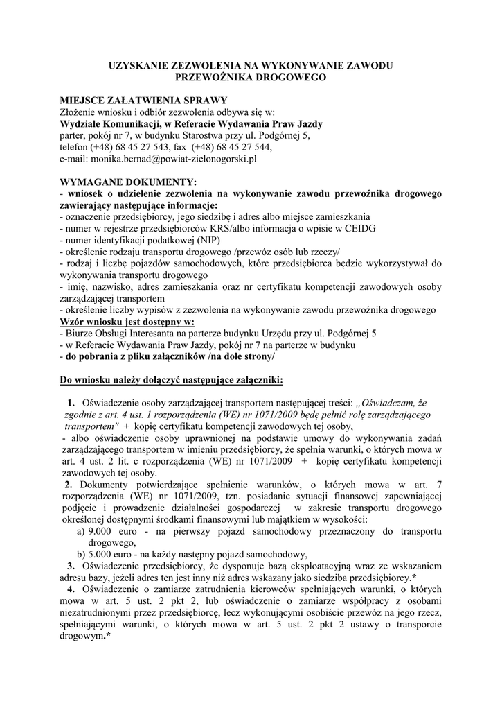 UZYSKANIE ZEZWOLENIA NA WYKONYWANIE ZAWODU PRZEWOŻNIKA DROGOWEGO MIEJSCE ZAŁATWIENIA SPRAWY Złożenie wniosku i odbiór zezwolenia odbywa się w: Wydziale Komunikacji, w Referacie Wydawania Praw Jazdy parter, pokój nr 7, w budynku Starostwa przy ul. Podgórnej 5, telefon (+48) 68 45 27 543, fax (+48) 68 45 27 544, e-mail: [email protected] WYMAGANE DOKUMENTY: - wniosek o udzielenie zezwolenia na wykonywanie zawodu przewoźnika drogowego zawierający następujące informacje: - oznaczenie przedsiębiorcy, jego siedzibę i adres albo miejsce zamieszkania - numer w rejestrze przedsiębiorców KRS/albo informacja o wpisie w CEIDG - numer identyfikacji podatkowej (NIP) - określenie rodzaju transportu drogowego /przewóz osób lub rzeczy/ - rodzaj i liczbę pojazdów samochodowych, które przedsiębiorca będzie wykorzystywał do wykonywania transportu drogowego - imię, nazwisko, adres zamieszkania oraz nr certyfikatu kompetencji zawodowych osoby zarządzającej transportem - określenie liczby wypisów z zezwolenia na wykonywanie zawodu przewoźnika drogowego Wzór wniosku jest dostępny w: - Biurze Obsługi Interesanta na parterze budynku Urzędu przy ul. Podgórnej 5 - w Referacie Wydawania Praw Jazdy, pokój nr 7 na parterze w budynku - do pobrania z pliku załączników /na dole strony/ Do wniosku należy dołączyć następujące załączniki: 1. Oświadczenie osoby zarządzającej transportem następującej treści: „Oświadczam, że zgodnie z art. 4 ust. 1 rozporządzenia (WE) nr 1071/2009 będę pełnić rolę zarządzającego transportem" + kopię certyfikatu kompetencji zawodowych tej osoby, - albo oświadczenie osoby uprawnionej na podstawie umowy do wykonywania zadań zarządzającego transportem w imieniu przedsiębiorcy, że spełnia warunki, o których mowa w art. 4 ust. 2 lit. c rozporządzenia (WE) nr 1071/2009 + kopię certyfikatu kompetencji zawodowych tej osoby. 2. Dokumenty potwierdzające spełnienie warunków, o których mowa w art. 7 rozporządzenia (WE) nr 1071/2009, tzn. posiadanie sytuacji finansowej zapewniającej podjęcie i prowadzenie działalności gospodarczej w zakresie transportu drogowego określonej dostępnymi środkami finansowymi lub majątkiem w wysokości: a) 9.000 euro - na pierwszy pojazd samochodowy przeznaczony do transportu drogowego, b) 5.000 euro - na każdy następny pojazd samochodowy, 3. Oświadczenie przedsiębiorcy, że dysponuje bazą eksploatacyjną wraz ze wskazaniem adresu bazy, jeżeli adres ten jest inny niż adres wskazany jako siedziba przedsiębiorcy.* 4. Oświadczenie o zamiarze zatrudnienia kierowców spełniających warunki, o których mowa w art. 5 ust. 2 pkt 2, lub oświadczenie o zamiarze współpracy z osobami niezatrudnionymi przez przedsiębiorcę, lecz wykonującymi osobiście przewóz na jego rzecz, spełniającymi warunki, o których mowa w art. 5 ust. 2 pkt 2 ustawy o transporcie drogowym.* 5. Dowód uiszczenia opłaty za wydanie zezwolenia na wykonywanie zawodu przewoźnika drogowego i wypisów z tego zezwolenia. 6. Informację z Krajowego Rejestru Karnego dotyczącą osoby: a) będącej członkiem organu zarządzającego osoby prawnej, osoby zarządzającej spółką jawną lub komandytową, b) prowadzącej działalność gospodarczą - w przypadku innego przedsiębiorcy, c) zarządzającej transportem lub uprawnionej na podstawie umowy do wykonywania zadań zarządzającego transportem w imieniu przedsiębiorcy – albo oświadczenie tych osób o niekaralności za przestępstwa umyślne w dziedzinach określonych w art. 6 rozporządzenia (WE) nr 1071/2009.* 7. Po uzyskaniu zezwolenia przedsiębiorca przedkłada wykaz pojazdów samochodowych zawierający następujące informacje: - marka, typ - rodzaj/przeznaczenie - numer rejestracyjny - numer VIN - wskazanie rodzaju tytułu prawnego do dysponowania pojazdem * Oświadczenia składa się pod rygorem odpowiedzialności karnej za składanie fałszywych zeznań. Składający oświadczenie jest obowiązany do zawarcia w nim klauzuli następującej treści: „Jestem świadomy/a odpowiedzialności karnej za złożenie fałszywego oświadczenia.”. Klauzula ta zastępuje pouczenie organu o odpowiedzialności karnej za składanie fałszywych zeznań. Druki wniosków oraz oświadczeń są dostępne do pobrania z pliku załączników na dole strony TERMIN ZAŁATWIENIA SPRAWY: - zezwolenie jest udzielane w terminie 30 dni od dnia złożenia kompletnego wniosku. - w przypadku sprawy szczególnie skomplikowanej termin załatwienia sprawy może zostać wydłużony o kolejne 30 dni SPOSÓB ZAŁATWIENIA SPRAWY dokumenty: - zezwolenie na wykonywanie zawodu przewoźnika drogowego i wypis(y) z zezwolenia, - decyzja o odmowie udzielenia zezwolenia, ODBIÓR - zezwolenie można odebrać osobiście po okazaniu dowodu osobistego lub innego dokumentu ze zdjęciem, potwierdzającym tożsamość osoby, - możliwe jest również wydanie zezwolenia osobie upoważnionej za okazaniem pełnomocnictwa lub prokury i dokumentu tożsamości (więcej w dodatkowych informacjach oraz opłatach), - możliwe jest doręczenie za pośrednictwem poczty (listem poleconym, za potwierdzeniem odbioru). Odbiór zezwolenia (i wypisów) jest możliwy dopiero po wpłynięciu opłaty za ich udzielenie. ZEZWOLENIA NA WYKONYWANIE ZAWODU PRZEWOŻNIKA DROGOWEGO UDZIELA SIĘ NA CZAS NIEOZNACZONY OPŁATY Opłatę za udzielenie zezwolenia na wykonywanie zawodu przewoźnika drogowego wnosi się na rachunek lub do kasy Starostwa, przed wydaniem licencji; Opłata administracyjna za udzielenie zezwolenia na wykonywanie zawodu przewoźnika drogowego w zakresie przewozu osób lub rzeczy uzależniona jest liczby pojazdów jakie przedsiębiorca zgłosił we wniosku i wynosi: - 1000 zł – za udzielenie zezwolenia w zakresie przewozu osób lub rzeczy; - w przypadku zgłoszenia we wniosku o udzielenie zezwolenia na wykonywanie transportu drogowego rzeczy jednego lub więcej niż jednego pojazdu samochodowego, pobiera się j