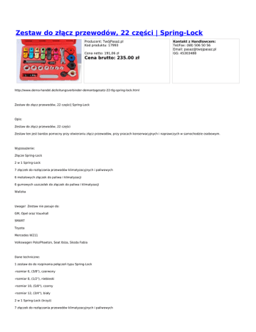 Zestaw do złącz przewodów, 22 części | Spring-Lock Producent: TwójPasaż.pl Kod produktu: 17993 Cena netto: 191,06 zł Kontakt z Handlowcem: Tel/Fax: (68) 506 50 56 Email: [email protected] GG: 45303488 Cena brutto: 235.00 zł http://www.dema-handel.de/leitungsverbinder-demontagesatz-22-tlg-spring-lock.html Zestaw do złącz przewodów, 22 części| Spring-Lock Opis: Zestaw do złącz przewodów, 22 części Zestaw ten jest bardzo pomocny przy otwieraniu złącz przewodów, przy pracach konserwacyjnych i naprawczych w samochodzie osobowym. Wyposażenie: Złącze Spring-Lock 2 w 1 Spring-Lock 7 złączek do rozłączania przewodów klimatyzacyjnych i paliwowych 6 metalowych złączek do paliwa i klimatyzacji 6 gumowych uszczelek do złączek do paliwa i klimatyzacji Walizka Uwaga! Zestaw nie pasuje do: GM, Opel oraz Vauxhall SMART Toyota Mercedes W211 Volkswagen Polo/Phaeton, Seat Ibiza, Skoda Fabia Dane techniczne: 1 zestaw do do rozpinania połączeń typu Spring-Lock -rozmiar 6, (3/8"), czerwony -rozmiar 8, (1/2"), niebieski -rozmiar 10, (5/8"), czarny -rozmiar 12, (3/4"), biały 2 w 1 Spring-Lock (krzyż) 7 złączek do rozłączania przewodów klimatyzacyjnych i paliwowych Złączki do paliwa i klimatyzacji: 1/4“, 5/16“, 3/8“, 1/2“, 5/8“, 3/4“, 7/8“ 6 metalowych złączek do paliwa i klimatyzacji: 5/16", 3/8", 1/2", 5/8", 3/4", 7/8" Wymiary dł. x szer. x wys.: 31x23x4 cm Waga: 1,0 kg Kod produktu:17993 ID produktu:138879 Granos Group sp. z o.o. ul. Sulechowska 4a budynek 45 65-001 Zielona Góra