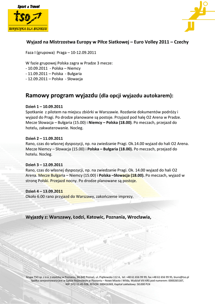 Wyjazd na Mistrzostwa Europy w Piłce Siatkowej – Euro Volley 2011 – Czechy Faza I (grupowa) Praga – 10-12.09.2011 W fazie grupowej Polska zagra w Pradze 3 mecze: - 10.09.2011 - Polska – Niemcy - 11.09.2011 – Polska - Bułgaria - 12.09.2011 – Polska - Słowacja Ramowy program wyjazdu (dla opcji wyjazdu autokarem): Dzień 1 – 10.09.2011 Spotkanie z pilotem na miejscu zbiórki w Warszawie. Rozdanie dokumentów podróży i wyjazd do Pragi. Po drodze planowane są postoje. Przyjazd pod halę O2 Arena w Pradze. Mecze Słowacja – Bułgaria (15.00) i Niemcy – Polska (18.00). Po meczach, przejazd do hotelu, zakwaterowanie. Nocleg. Dzień 2 – 11.09.2011 Rano, czas do własnej dyspozycji, np. na zwiedzanie Pragi. Ok.14.00 wyjazd do hali O2 Arena. Mecze Niemcy – Słowacja (15.00) i Polska – Bułgaria (18.00). Po meczach, przejazd do hotelu. Nocleg. Dzień 3 – 12.09.2011 Rano, czas do własnej dyspozycji, np. na zwiedzanie Pragi. Ok. 14.00 wyjazd do hali O2 Arena. Mecze Bułgaria – Niemcy (15.00) i Polska –Słowacja (18.00). Po meczach, wyjazd w stronę Polski. Przejazd nocny. Po drodze planowane są postoje. Dzień 4 – 13.09.2011 Około 6.00 rano przyjazd do Warszawy, zakończenie imprezy. Wyjazdy z: Warszawy, Łodzi, Katowic, Poznania, Wrocławia, Grupa TSO sp. z o.o. z siedzibą w Poznaniu, 60-649 Poznań, ul. Piątkowska 112 A, tel. +48 61 656 99 99, fax +48 61 656 99 95, [email protected] Spółka zarejestrowana jest w Sądzie Rejonowym w Poznaniu – Nowe Miasto i Wilda, Wydział VIII KRS pod numerem: 0000265187, NIP: 972-11-45-928, REGON: 300416369, Kapitał zakładowy: 50.000 PLN