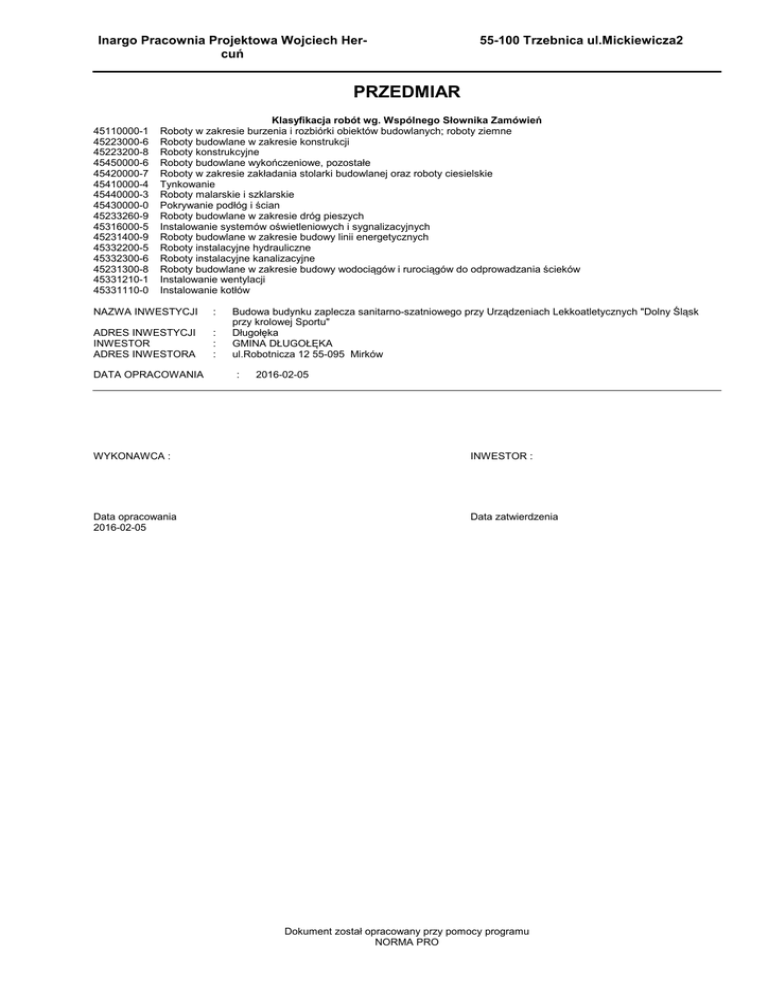 Inargo Pracownia Projektowa Wojciech Hercuń 55-100 Trzebnica ul.Mickiewicza2 PRZEDMIAR 45110000-1 45223000-6 45223200-8 45450000-6 45420000-7 45410000-4 45440000-3 45430000-0 45233260-9 45316000-5 45231400-9 45332200-5 45332300-6 45231300-8 45331210-1 45331110-0 Klasyfikacja robót wg. Wspólnego Słownika Zamówień Roboty w zakresie burzenia i rozbiórki obiektów budowlanych; roboty ziemne Roboty budowlane w zakresie konstrukcji Roboty konstrukcyjne Roboty budowlane wykończeniowe, pozostałe Roboty w zakresie zakładania stolarki budowlanej oraz roboty ciesielskie Tynkowanie Roboty malarskie i szklarskie Pokrywanie podłóg i ścian Roboty budowlane w zakresie dróg pieszych Instalowanie systemów oświetleniowych i sygnalizacyjnych Roboty budowlane w zakresie budowy linii energetycznych Roboty instalacyjne hydrauliczne Roboty instalacyjne kanalizacyjne Roboty budowlane w zakresie budowy wodociągów i rurociągów do odprowadzania ścieków Instalowanie wentylacji Instalowanie kotłów NAZWA INWESTYCJI : ADRES INWESTYCJI INWESTOR ADRES INWESTORA : : : DATA OPRACOWANIA Budowa budynku zaplecza sanitarno-szatniowego przy Urządzeniach Lekkoatletycznych "Dolny Śląsk przy krolowej Sportu" Długołęka GMINA DŁUGOŁĘKA ul.Robotnicza 12 55-095 Mirków : 2016-02-05 WYKONAWCA : INWESTOR : Data opracowania 2016-02-05 Data zatwierdzenia Dokument został opracowany przy pomocy programu NORMA PRO budynek_2015_prd_ver4 Lp. 1 1.1 1.2 1.3 1.4 1.5 1.6 1.7 1.8 1.9 1.10 1.11 1.12 2 2.1 2.2 2.3 2.4 2.5 3 3.1 3.2 3.3 3.4 3.5 3.6 DZIAŁY KOSZTORYSU Nazwa działu Od Część budowlana Roboty ziemne Konstrukcja Ściany,ściany działowe Dach Stolarka,balustrady,daszki,osłony Tynki,okładziny ścienne,sufity podwieszone, Roboty malarskie Posadzki PG1 Wyposażenie Elewacja Podest,rampa Opaska chodnik Część instalacje elektryczne Oprawy elektryczne rozdzielnice Osprzęt elektryczny Przewody Instalacja odgromowa Część instalacyjna Instalacja wody zimnej,ciepłej i cyrkulacji. Kanalizacja sanitarna w budynku Kanalizacja deszczowa Instalacja wentylacji Układ solarny Grzejniki elektryczne 1 1 7 25 28 38 44 49 51 61 69 75 85 90 90 96 97 102 107 115 115 140 163 168 183 188 -2- Norma PRO Wersja 4.28 Licencja: 22185 Do 89 6 24 27 37 43 48 50 60 68 74 84 89 114 95 96 101 106 114 191 139 162 167 182 187 191 budynek_2015_prd_ver4 Lp. 1 1.1 1 d.1. 1 PRZEDMIAR Podstawa Opis i wyliczenia Część budowlana 45110000-1 Roboty ziemne KNR 2-01 Pomiary przy wykopach fundamentowych w terenie równinnym i nizinnym 0122-01 2 KNR 2-01 d.1. 0218-02 1 3 KNR 2-01 d.1. 0310-02 1 m3 Wykopy oraz przekopy wykonywane koparkami podsiębiernymi 0.60 m3 na odkład w gruncie kat. III m3 (11.10+1.20)*(9.00+1.20)*1.0*0.70 m3 m3 m3 (poz.4A-poz.4B)*0.70 125.460 87.822 RAZEM 87.822 37.638 RAZEM 37.638 125.460 ======== 125.460 51.395 ======== 51.395 51.846 RAZEM 51.846 22.220 RAZEM 22.220 51.395 RAZEM 51.395 Ręczne zasypywanie wykopów ze skarpami w gruncie kat.I-III z przerzutem na m3 odl. do 3 m m3 (poz.4A-poz.4B)*0.30 1.2 7 d.1. 2 125.460 RAZEM Zasypywanie wykopów spycharkami z przemieszczeniem gruntu na odległość m3 do 10 m w gruncie kat. I-III poz.7+poz.14+poz.15*0.24+poz.51+poz.52 B (obliczenia pomocnicze) 6 KNR 2-01 d.1. 0212-07 1 0214-04 Roboty ziemne wykonywane koparkami podsiębiernymi 0.60 m3 w ziemi kat. I- m3 III uprzednio zmagazynowanej w hałdach z transportem urobku samochodami samowyładowczymi na odległość 10 km poz.4B m3 45223000-6 Konstrukcja KNR 2-02 Podkłady betonoweB10 na podłożu gruntowym Zastosowano pompę do beto1101-01 nu na samochodzie. z.sz. 5.4. 9913 Ł1 39.6*0.80*0.10 Ł2 11.0*0.80*0.10 m3 m3 3.168 m3 0.880 RAZEM 8 KNR 2-02 d.1. 0604-02 2 Izolacje przeciwwilgociowe dwiema warstwami papy na lepiku na gorąco ław fundamentowych betonowych Ł1 39.60*0.80 Ł2 11.0*0.80 9 KNR 2-02 d.1. 0609-10 2 4.048 m2 m2 31.680 m2 8.800 RAZEM 40.480 Izolacje cieplne i przeciwdźwiękowe z płyt styropianowychgr12 cm pionowe na m2 zaprawie bez siatki metalową m2 m2 39.6*0.55 11.0*0.55*2 10 KNR-W 2-02 Izolacje z foli kubełkowej na sucho pionowe - jedna warstwa d.1. 0615-04 2 39.6*1.50 11 KNR AT-22 d.1. 0101-01 2 Razem Ręczne wykopy ciągłe lub jamiste ze skarpami o szer. dna do 1,5 m i gł. do 1, m3 5 m ze złożeniem urobku na odkład (kat. gruntu III) poz.2+poz.3 A (obliczenia pomocnicze) 5 KNR 2-01 d.1. 0501-01 1 Poszcz m3 poz.2+poz.3 (11.10+1.20)*(9.0+1.20)*1.0*0.30 4 KNR 2-01 d.1. 0230-01 1 j.m. m2 m2 39.6*0.40 m2 Norma PRO Wersja 4.28 Licencja: 22185 RAZEM 33.880 59.400 RAZEM 59.400 15.840 RAZEM 15.840 m2 Przygotowanie podłoża pod wykonanie okładzin ściennych - oczyszczenie i zmycie podłoża -3- 21.780 12.100 budynek_2015_prd_ver4 Lp. Podstawa 12 KNR AT-22 d.1. 0106-06 2 13 KNR 0-23 d.1. 0931-02 2 analogia PRZEDMIAR Opis i wyliczenia Dodatek za naniesienie mineralnej warstwy sczepnej na spód płytek j.m. m2 poz.11 m2 Tynk mozaikowy cokołu m2 poz.11 m2 14 KNR-W 2-02 Ławy fundamentowe C25/30 prostokątne o szerokości do 0.8 m w deskowaniu m3 d.1. 0243-02 PERI - transport betonu pompą, pozostałych materiałów żurawiem 2 0.60*0.40*39.6<Ł1> m3 0.60*0.40*11.0<Ł2> m3 15 KNR-W 2-02 Fundamenty z bloczków betonowych na zaprawie cementowej d.1. 0101-06 2 (39.60+11.0)*0.55*0.24 Poszcz Razem 15.840 RAZEM 15.840 15.840 RAZEM 15.840 9.504 2.640 RAZEM 12.144 6.679 RAZEM 6.679 6.679 RAZEM 6.679 m3 m3 16 KNR-W 2-02 Ściany betonowe C25/30 w deskowaniu PERI - dodatek za każdy następny cm m2 d.1. 0245-03 grubości - transport betonu pompą, pozostałych materiałów żurawiem-dodatek 2 za 14 cm poz.15 m2 17 KNR-W 2-02 Belki i podciągi w deskowaniu PERI o stosunku deskowanego obwodu do d.1. 0249-03 przekroju do 12 - transport betonu pompą, pozostałych materiałów żurawiem 2 P1 0.24*0.40*3.10 P2 0.24*0.35*3.0 m3 18 KNR-W 2-02 Belki i podciągi w deskowaniu PERI o stosunku deskowanego obwodu do d.1. 0249-04 przekroju do 14 - transport betonu pompą, pozostałych materiałów żurawiem 2 W1 0.24*0.25*26.22