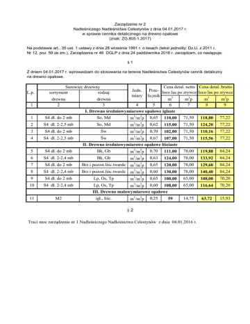 Zarządzenie nr 2 Nadleśniczego Nadleśnictwa Celestynów z dnia 04.01.2017 r. w sprawie cennika detalicznego na drewno opałowe (znak: ZG.805.1.2017) Na podstawie art.. 35 ust. 1 ustawy z dnia 28 września 1991 r. o lasach (tekst jednolity: Dz.U. z 2011 r. Nr 12, poz. 59 ze zm.), Zarządzenia nr 46 DGLP z dnia 24 października 2016 r. zarządzam, co następuje: §1 Z dniem 04.01.2017 r. wprowadzam do stosowania na terenie Nadleśnictwa Celestynów cennik detaliczny na drewno opałowe. L.p. Surowiec drzewny sortyment rodzaj 1 drewna 2 1 S4 dł. do 2 mb Cena detal. netto Cena detal. brutto Prze- loco las po zrywce loco las po zrywce licznik drewna m3 m3p m3 m3p 3 4 5 6 7 8 9 I. Drewno średniowymiarowe opałowe iglaste So, Md Jedn. miary m3/m3p 3 3 0,65 110,00 71,50 118,80 77,22 2 S4 dł. 2-2,5 mb So, Md m /m p 0,62 115,00 71,50 124,20 77,22 3 S4 dł. do 2 mb Św m3/m3p 0,70 102,00 71,50 110,16 77,22 m /m p 0,67 107,00 II. Drewno średniowymiarowe opałowe liściaste 71,50 115,56 77,22 4 S4 dł. 2-2,5 mb 5 S4 dł. do 2 mb 6 S4 dł. 2-2,4 mb 3 Św Bk, Gb Bk, Gb 3 m3/m3p 0,70 111,00 78,00 119,88 84,24 3 3 0,63 124,00 78,00 133,92 84,24 3 3 m /m p 7 S4 dł. do 2 mb Brz i pozost.liśc.twarde m /m p 0,65 120,00 78,00 129,60 84,24 8 S4 dł. 2-2,4 mb Brz i pozost.liśc.twarde m3/m3p 0,60 130,00 78,00 140,40 84,24 0,65 3 3 9 S4 dł. do 2 mb Lp, Os, Tp 100,00 65,00 108,00 70,20 10 S4 dł. 2-2,4 mb m3/m3p 0,60 108,00 III. Drewno małowymiarowe opałowe 65,00 116,64 70,20 11 M2 14,75 63,72 15,93 m /m p Lp, Os, Tp igl., liśc. m3/m3p 0,25 59 §2 Traci moc zarządzenie nr 1 Nadleśniczego Nadleśnictwa Celestynów z dnia 04.01.2016 r.