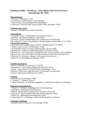 PODRĘCZNIKI WYDZIAŁ LEKARSKO-DENTYSTYCZNY Stomatologia III ROK Patomorfologia 1.Stevens A.: Patologia. Czelej 2.Groniowski J.(red):.Podstawy patomorfologii 3. Kruś S.(red.): Patomorfologia dla stomatologów 4. Jańczuk Z.: Choroby błony śluzowej jamy ustnej i przyzębia. PZWL Patologia jamy ustnej 1.Soames : Patologia jamy ustnej. Sanmedica Farmakologia 1.Mutschler E.(red.): Farmakologia i toksykologii. Elsevier 2.Nowak P.: Receptura dla lekarzy. Kwieciński 3.Kleinrok Z.(red.): Farmakologia wraz z podstawami farmakoterapii 4.Krzemiński F.T.(red.): Farmakologia i farmakoterapia w stomatologii. T.1/2. ŚAM Podręczniki uzupełniające 1.Kostowski (red.): Farmakologia. Podstawy farmakoterapii.T.1/2. PZWL 2. Rajtar-Cynke G.(red.): Farmakologia. Czelej. 3. Katzung B.G. :Basic of clinical pharmacology. McGraw-Hill 4.Herman Z.S.: Podstawy farmakologii ogólnej. Zakażenia. PZWL 5.Herman Z.S.: Leki wpływające na układ nerwowy, przeciwzapalne i przeciwbólowe 6.Herman Z.S.: Leki stosowane w chorobach układu sercowo-naczyniowego, krwi. 7.Herman Z.S.: Hormony, witaminy. Leki przeciwnowotworowe. 8.Janiec W.: Kompendium farmakologii. PZWL Choroby wewnętrzne 1.Kokot F: Choroby wewnętrzne.T.1/2.PZWL 2.Orłowski W.: Zarys ogólnej diagnostyki lekarskiej. PZWL 3.Guzik .: Zarys chorób wewnętrznych dla stomatologów. WUJ 4.Kokot F.: Ostre stany zagrożenia życia w chorobach wewnętrznych 5.Tatoń J: Diagnostyka internistyczna. PZWL Pediatria 1.Kubicka K.(red.):Pediatria. PZWL 2. Lissauer T. : Pediatria. Elsevier 3. Sońta-Jakimczyk D. :Wybrane zagadnienie z pediatrii dla studentów stomatologii Radiologia stomatologiczna 1.Whaites E.: Podstawy radiodiagnostyki stomatologicznej 2.Sonnabend : Radiologia stomatologiczna 3.Mlosek : Radiologia stomatologiczna i szczękowo-twarzowa. 4. Raczew Z.: Zarys rentgenodiagnostyki stomatologicznej. PZWL 5.White S.C.: Radiologia stomatologiczna Czelej. 6. Zgliczyński S.L.: Radiologia. Podręcznik dla studentów medycyny. Chirurgia i onkologią 1.Gażdzik S.(red.): Ortopedia i traumatologia .PZWL 2.Noszczyk W.: Chirurgia –repetytorium .PZWL 3. Fibak S.(red.): Chirurgia repetytorium. PZWL Mikrobiologia jamy ustnej 1.Samaranayake : Podstawy mikrobiologii dla stomatologów. PZWL 2. Łuczak M.(red.):Wybrane zagadnienia z mikrobiologii jamy ustnej. Czelej Protetyka stomatologiczna 1. Majewski S.W.: Rekonstrukcja zębów uzupełnieniami stałymi. 2. Shillingburg H.T.: Protezy stałe. Kwintesencja 3. Spiechowicz E. Protetyka stomatologiczna , PZWL 4. Rosenstiel S.F.: Współczesne protezy stałe. Czelej Stomatologia zachowawcza z endodoncją 1.Jańczuk Z.(red.): Stomatologia zachowawcza. Zarys kliniczny. PZWL 2.Piątowska D.: Zarys kariologii 3.Knychalska-Karwan: Podstawy chorób przyzębia i błony śluzowej 4.Jańczuk Z.(red.): Choroby błony śluzowej jamy ustnej i przyzębia. 5.Arabska-Przedpełska A.: Endodoncja praktyczna 6.Jańczuk Z.(red.): Endodoncja kliniczna . Choroby zakaźne 1.Cianciara J.(red.):Choroby zakaźne i pasożytnicze .Czelej 2.Dziubek Z.(red.): Choroby zakaźne i pasożytnicze. PZWL