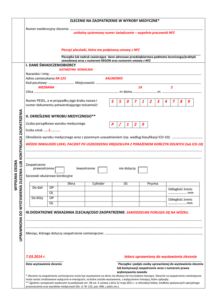 ZLECENIE NA ZAOPATRZENIE W WYROBY MEDYCZNE* Numer ewidencyjny zlecenia: …………………………………………………………………………………………………………………………………………… unikalny systemowy numer świadczenia – wypełnia pracownik NFZ Pieczęć placówki, która ma podpisaną umowę z NFZ _____________________________________________________________________________________ Pieczątka lub nadruk zawierające dane adresowe przedsiębiorstwa podmiotu leczniczego/praktyki zawodowej wraz z numerem REGON oraz numerem umowy z NFZ I. DANE ŚWIADCZENIOBIORCY KATARZYNA KOWALSKA Nazwisko i imię: ……………………………………………………………………………………………………………………………………………………………… Adres zamieszkania 04-123 KALINOWO Kod pocztowy: …………………………. Miejscowość: …………………………………………………………………………………………………………….. NIEZNANA 14 2 Ulica ……………………………………………………………………………………….. nr domu ………………………..m. ……………………………………….. WYPEŁNIA OSOBA UPRAWNIONA DO WYSTAWIENIA ZLECENIA LUB KONTYNUACJI ZAOPATRZENIA Numer PESEL, a w przypadku jego braku nazwa i numer dokumentu potwierdzającego tożsamość: 5 5 0 7 1 P / 1 2 9 2 3 4 7 8 9 II. OKREŚLENIE WYROBU MEDYCZNEGO** Liczba porządkowa wyrobu medycznego liczba sztuk ……1………… Określenie wyrobu medycznego wraz z pisemnym uzasadnieniem (np. według klasyfikacji ICD-10): ……………………………... WÓZEK INWALIDZKI LEKKI, PACJENT PO USZKODZENIU KRĘGOSŁUPA Z PORAŻENIEM KOŃCZYN DOLNYCH (lub ICD-10) ………………………………………………………………………………………………………………………………………………………………………………………… ……………………………………………………………………………………………………………………………………………………………………………………..... Zaopatrzenie: prawostronne lewostronne nie dotyczy Soczewki okularowe korekcyjne Sfera Do dali Do bliży OP OL OP OL Cylinder Oś Pryzma Odległość źrenic …………………. mm Odległość żrenic ………………… mm III.DODATKOWE WSKAZANIA ZLECAJĄCEGO ZAOPATRZENIE: SAMODZIELNIE PORUSZA SIĘ NA WÓZKU. ………………………………………………………………………………………………………………………………………………………………………………………… …………………………………………………………………………………………………………………………………………………………………………………………. Miesiąc, którego dotyczy zaopatrzenie comiesięczne: ……………………………………………………………………………………………………… 7.03.2014 r. _______________________ Data wystawienia zlecenia lekarz uprawniony do wystawienia zlecenia ____________________________________________________ Pieczątka i podpis osoby uprawnionej do wystawienia zlecenia lub kontynuacji zaopatrzenia wraz z numerem prawa wykonywania zawodu * Zlecenie na zaopatrzenie comiesięczne może być wystawione na okres nie dłuższy niż trzy kolejne miesiące. Zlecenie na zaopatrzenie comiesięczne może zostać zrealizowane wyłącznie w miesiącach, na które zostało wystawione, z wyłączeniem miesięcy, które upłynęły. ** Zgodnie z przepisami wydanymi na podstawie art. 38 ust. 4 ustawy z dnia 12 maja 2011 r. o refundacji leków, środków spożywczych specjalnego przeznaczenia oraz wyrobów medycznych (Dz. U. Nr 122, poz. 696, z późn.zm.). WYPEŁNIA PRACOWNIK ODDZIAŁU WOJEWÓDZKIEGO NARODOWEGO FUNDUSZU ZDROWIA IV. POTWIERDZENIE UPRAWNIENIA DO ZAOPATRZENIA WNIOSKOWANYM WYROBEM MEDYCZNYM Kod tytułu uprawnienia ………………………….…………………………………………………………………………………………………………………….. Kod tytułu uprawnienia dodatkowego .…………………………………………………………. nr dokumentu …………………………………….. Nazwa i numer oddziału wojewódzkiego Narodowego Funduszu Zdrowia: …………………………………………………………………… Limit finansowania ze środków publicznych ………..……….. Refundacja Narodowego Funduszu Zdrowia …………………….% Przyczyna odmowy potwierdzenia prawa do refundacji ………………………………………………………………………………………………… ………………………………………………………………………………………………………………………………………………………………………………………. Data potwierdzenia zlecenia ………………………………………………………………………………………………………………………………………….. _________________________________________________ Podpis i pieczątka pracownika oddziału wojewódzkiego Narodowego Funduszu Zdrowia WYPEŁNIA PODMIOT REALIZUJĄCY CZYNNOŚCI Z ZAKRESU ZAOPATRZENIA W WYROBY MEDYCZNE V. POTWIERDZENIE ODBIORU WYROBU MEDYCZNEGO U ŚWIADCZENIODAWCY ________________________ Data przyjęcia do realizacji _______________________________________________ Pieczątka podmiotu realizującego czynności z zakresu zaopatrzenia w wyroby medyczne, w tym adres miejsca udzielania świadczeń wraz z numerem umowy z NFZ Liczba sztuk ………………………… Dane dotyczące wyrobu medycznego (wytwórca, model, nazwa handlowa) …………………. ……………………