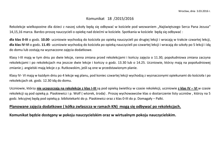 Wrocław, dnia 3.03.2016 r. Komunikat 18 /2015/2016 Rekolekcje wielkopostne dla dzieci z naszej szkoły będą się odbywad w kościele pod wezwaniem „Najświętszego Serca Pana Jezusa” 14,15,16 marca. Bardzo proszę nauczycieli o opiekę nad dziedmi w kościele. Spotkania w kościele będą się odbywad : dla klas 0-III o godz. 10.00- uczniowie wychodzą do kościoła po opieką nauczycieli po drugiej lekcji i wracają w trakcie czwartej lekcji, dla klas IV-VI o godz. 11.45- uczniowie wychodzą do kościoła po opieką nauczycieli po czwartej lekcji i wracają do szkoły po 5 lekcji i idą do domu lub zostają na wyznaczone zajęcia dodatkowe. Klasy I-III mają w tym dniu po dwie lekcje, ranna zmiana przed rekolekcjami i kooczy zajęcia o 11.30, popołudniowa zmiana zaczyna rekolekcjami i po rekolekcjach ma jeszcze dwie lekcje i kooczy o godz. 13.30 lub o 14.25. Uczniowie, którzy mają na popołudniowej zmianie j. angielski mają lekcje z p. Rutkowskim, jeśli są one w przedstawionym planie. Klasy IV- VI mają w każdym dniu po 4 lekcje wg planu, pod koniec czwartej lekcji wychodzą z wyznaczonymi opiekunami do kościoła i po rekolekcjach ok. godz. 12.30 idą do domu. Uczniowie, którzy nie uczęszczają na rekolekcje z klas I-III są pod opieką świetlicy w czasie rekolekcji, uczniowie z klas IV – VI w czasie rekolekcji są pod opieką p. Piaskiewicz i p. Wolf ( wtorek, środa) . Proszę wychowawców klas o dostarczenie listy uczniów , którzy na 5 godz. lekcyjnej będą pod opieką p. bibliotekarki do p. Piaskiewicz oraz z klas 0-III do p. Domagały – Palki. Planowane zajęcia dodatkowe ( kółka zwłaszcza w ramach KN) mogą się odbywad po rekolekcjach. Komunikat będzie dostępny w pokoju nauczycielskim oraz w wirtualnym pokoju nauczycielskim. 14 marca 2016 r. poniedziałek 0 1a 1b Do 9.50 zajęcia w sali nr 5 Wyjście na 10.00 z grupą do kościoła p. Karbows ka Zbiórka 9.45 w szkole Wyjście na 10.00 z grupą do kościoła p. Luty i p. Marcioczak 1,2 l. planu Powrót 5,6 l. do Sali i planu zajęcia z p. Wcisło od godz. 12.00 1c 1d 2a wg 1,2 l. wg Zbiórka 9.45 1,2 l. planu w szkole planu Wyjście na 10.00 z grupą do kościoła p. Hebda p. Jopek wg Ok. 11.15 powrót do szkoły i wyjście do domu lub świetlicy szkolnej Wyjście na 10.00 z grupą do kościoła p. A. Winkler, p. I. Poniatow ska Wyjście na 10.00 z grupą do kościoła p. Lech i p. Rutkowski 5,6 l. planu 2b 2c wg Zbiórka 9.45 w 1,2 l. wg planu szkole Wyjście na 10.00 z grupą do kościoła p. Kowalska, p. Sochaj Wyjście na 10.00 z grupą do kościoła p. Strugarek p. Frączek wg Ok. 11.15 5,6 l wg planu powrót do szkoły i wyjście do domu lub świetlicy szkolnej Wyjście na 10.00 z grupą do kościoła z p. B. Winkler 3a 3b 3c 1,2 l. wg planu 1,2 l. planu Wyjście na 10.00 z grupą do kościoła P. Ledóchowska, p. Hanzel Wyjście na 10.00 z grupą do kościoła p. Sarnecka, p. Jędryszczak wg 1,2 l. wg planu Ok. 11.15 Wyjazd na Wyjazd na powrót do basen po basen po szkoły i wyjście rekolekcjach rekolekcjach do domu lub świetlicy szkolnej Wyjście na 10.00 z grupą do kościoła p. Pawłowska Wyjazd na basen po rekolekcjach z p. Karbownik 15 marca 2016 r. wtorek 0 1a 1b Do 9.50 zajęcia w sali nr 5 Wyjście na 10.00 z grupą do kościoła p. Karbows ka Zbiórka 9.45 w szkole Wyjście na 10.00 z grupą do kościoła p. Luty i p. Marcioczak 1,2 l. planu Powrót 5,6 l. do Sali i planu zajęcia z p. Wcisło od godz. 12.00 1c 1d 2a wg 1,2 l. wg Zbiórka 9.45 1,2 l. planu w szkole planu Wyjście na 10.00 z grupą do kościoła p. Hebda p. Jopek wg Ok. 11.15 powrót do szkoły i wyjście do domu lub świetlicy szkolnej Wyjście na 10.00 z grupą do kościoła p. A. Winkler, p. I. Poniatow ska Wyjście na 10.00 z grupą do kościoła p. Lech i p. Rutkowski 5,6 l. planu 2b 2c wg Zbiórka 9.45 w 1,2 l. wg planu szkole Wyjście na 10.00 z grupą do kościoła p. Kowalska, p. Sochaj Wyjście na 10.00 z grupą do kościoła p. Strugarek p. Frączek wg Ok. 11.15 5,6 l wg planu powrót do szkoły i wyjście do domu lub świetlicy szkolnej Wyjście na 10.00 z grupą do kościoła z p. B. Winkler 3a 3b Zbiórka 9.45 w 1,2 l. szkole planu Wyjście na 10.00 z grupą do kościoła P. Ledóchowska, p. Hanzel Ok. 11.15 5,6 l wg planu powrót do szkoły i wyjście do domu lub świetlicy szkolnej 3c wg Zbiórka 9.45 w szkole Wyjście na 10.00 z grupą do kościoła p. Sarnecka, p. Jędryszczak Wyjście na 10.00 z grupą do kościoła p. Pawłowska Ok. 11.15 5,6 l wg planu powrót do szkoły i wyjście do domu lub świetlicy szkolnej 16 marca 2016 r. środa 0 1a 1b Do 9.50 zajęcia w sali nr 5 Wyjście na 10.00 z grupą do kościoła p. Karbows ka Zbiórka 9.45 w szkole Wyjście na 10.00 z grupą do kościoła p. Luty i p. Marcioczak 1,2 l. wg 1,2 l. wg Zbiórka 9.45 1,2 l. planu planu w szkole planu Powrót 5,6 l. do Sali i planu zajęcia z p. Wcisło od godz. 12.00 Wyjście na 10.00 z grupą do kościoła p. Hebda p. Jopek wg Ok. 11.15 powrót do szkoły i wyjście do domu lub świetlicy szkolnej 1c Wyjście na 10.00 z grupą do kościoła p. A. Winkler, p. I. Poniatows ka 1d 2a Wyjście na 10.00 z grupą do kościoła p. Lech i p. Rutkowski 5,6 l. planu 2b 2c wg Zbiórka 9.45 w 1,2 l. wg planu szkole Wyjście na 10.00 z grupą do kościoła p. Kowalska, p. Sochaj Wyjście na 10.00 z grupą do kościoła p. Strugarek p. Frączek wg Ok. 11.15 5- e-w. powrót do I. Strugarek szkoły i ,6 l wg planu wyjście do domu lub świetlicy szkolnej Wyjście na 10.00 z grupą do kościoła z p. B. Winkler 3a 3b Zbiórka 9.45 w 1,2 l. szkole planu Wyjście na 10.00 z grupą do kościoła P. Ledóchowska, p. Hanzel Ok. 11.15 5,6 l wg planu powrót do szkoły i wyjście do domu lub świetlicy szkolnej 3c wg Zbiórka 9.45 w szkole Wyjście na 10.00 z grupą do kościoła p. Sarnecka, p. Jędryszczak Wyjście na 10.00 z grupą do kościoła p. Pawłowska Ok. 11.15 5- edukacja w. powrót do A. Karbownik szkoły i ,6 l wg planu wyjś