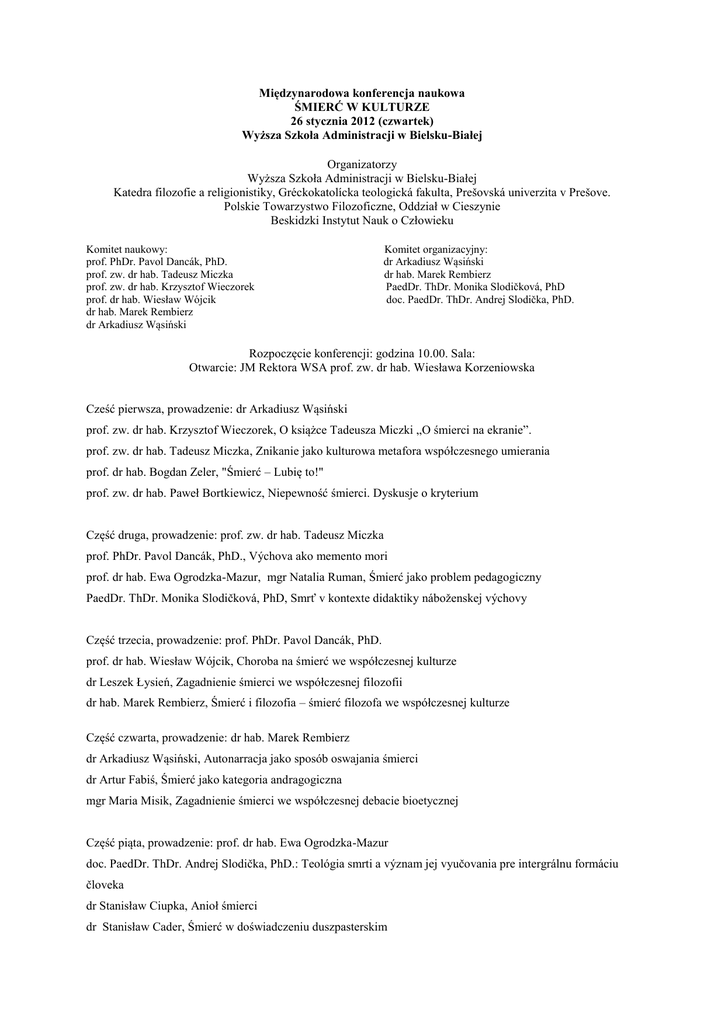 Międzynarodowa konferencja naukowa ŚMIERĆ W KULTURZE 26 stycznia 2012 (czwartek) Wyższa Szkoła Administracji w Bielsku-Białej Organizatorzy Wyższa Szkoła Administracji w Bielsku-Białej Katedra filozofie a religionistiky, Gréckokatolícka teologická fakulta, Prešovská univerzita v Prešove. Polskie Towarzystwo Filozoficzne, Oddział w Cieszynie Beskidzki Instytut Nauk o Człowieku Komitet naukowy: prof. PhDr. Pavol Dancák, PhD. prof. zw. dr hab. Tadeusz Miczka prof. zw. dr hab. Krzysztof Wieczorek prof. dr hab. Wiesław Wójcik dr hab. Marek Rembierz dr Arkadiusz Wąsiński Komitet organizacyjny: dr Arkadiusz Wąsiński dr hab. Marek Rembierz PaedDr. ThDr. Monika Slodičková, PhD doc. PaedDr. ThDr. Andrej Slodička, PhD. Rozpoczęcie konferencji: godzina 10.00. Sala: Otwarcie: JM Rektora WSA prof. zw. dr hab. Wiesława Korzeniowska Cześć pierwsza, prowadzenie: dr Arkadiusz Wąsiński prof. zw. dr hab. Krzysztof Wieczorek, O książce Tadeusza Miczki „O śmierci na ekranie”. prof. zw. dr hab. Tadeusz Miczka, Znikanie jako kulturowa metafora współczesnego umierania prof. dr hab. Bogdan Zeler, "Śmierć – Lubię to!" prof. zw. dr hab. Paweł Bortkiewicz, Niepewność śmierci. Dyskusje o kryterium Część druga, prowadzenie: prof. zw. dr hab. Tadeusz Miczka prof. PhDr. Pavol Dancák, PhD., Výchova ako memento mori prof. dr hab. Ewa Ogrodzka-Mazur, mgr Natalia Ruman, Śmierć jako problem pedagogiczny PaedDr. ThDr. Monika Slodičková, PhD, Smrť v kontexte didaktiky náboženskej výchovy Część trzecia, prowadzenie: prof. PhDr. Pavol Dancák, PhD. prof. dr hab. Wiesław Wójcik, Choroba na śmierć we współczesnej kulturze dr Leszek Łysień, Zagadnienie śmierci we współczesnej filozofii dr hab. Marek Rembierz, Śmierć i filozofia – śmierć filozofa we współczesnej kulturze Część czwarta, prowadzenie: dr hab. Marek Rembierz dr Arkadiusz Wąsiński, Autonarracja jako sposób oswajania śmierci dr Artur Fabiś, Śmierć jako kategoria andragogiczna mgr Maria Misik, Zagadnienie śmierci we współczesnej debacie bioetycznej Część piąta, prowadzenie: prof. dr hab. Ewa Ogrodzka-Mazur doc. PaedDr. ThDr. Andrej Slodička, PhD.: Teológia smrti a význam jej vyučovania pre intergrálnu formáciu človeka dr Stanisław Ciupka, Anioł śmierci dr Stanisław Cader, Śmierć w doświadczeniu duszpasterskim