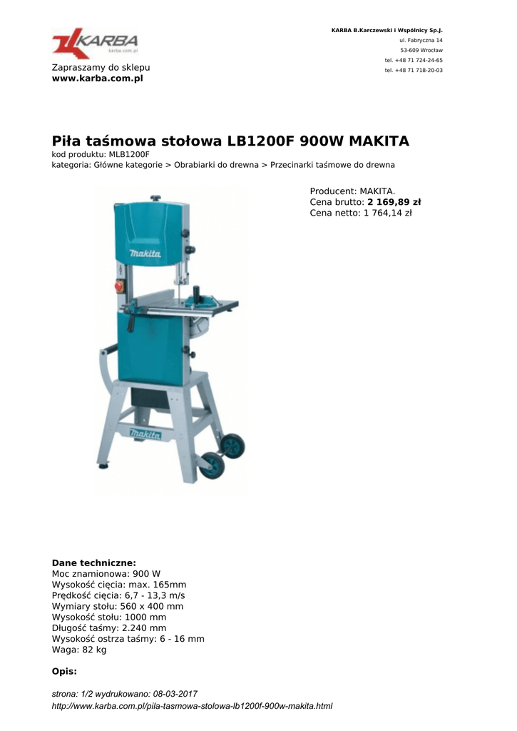 KARBA B.Karczewski i Wspólnicy Sp.J. ul. Fabryczna 14 53-609 Wrocław tel. +48 71 724-24-65 Zapraszamy do sklepu www.karba.com.pl tel. +48 71 718-20-03 Piła taśmowa stołowa LB1200F 900W MAKITA kod produktu: MLB1200F kategoria: Główne kategorie > Obrabiarki do drewna > Przecinarki taśmowe do drewna Producent: MAKITA. Cena brutto: 2 169,89 zł Cena netto: 1 764,14 zł Dane techniczne: Moc znamionowa: 900 W Wysokość cięcia: max. 165mm Prędkość cięcia: 6,7 - 13,3 m/s Wymiary stołu: 560 x 400 mm Wysokość stołu: 1000 mm Długość taśmy: 2.240 mm Wysokość ostrza taśmy: 6 - 16 mm Waga: 82 kg Opis: strona: 1/2 wydrukowano: 08-03-2017 http://www.karba.com.pl/pila-tasmowa-stolowa-lb1200f-900w-makita.html - Wysoka wydajność Włącznik z funkcją „anty-restart” Dioda LED oświetlająca obszar roboczy Łatwa wymiana brzeszczotu Pojemnik na kurz Koła zapewniające łatwy transport maszyny Dostarczone wyposażenie: Taśma tnąca 4 szt.: B-16667, B-16673, B-16689, B-16695 Prowadnica równoległa kpl.: JM21080230 Prowadnica kątowa: JM21080260 Popychacz: JM21080290 Przyłącze pojemnika na wióry: JM21080293 Stół Kieszeń na wióry Rękojeść stołu strona: 2/2 wydrukowano: 08-03-2017 http://www.karba.com.pl/pila-tasmowa-stolowa-lb1200f-900w-makita.html