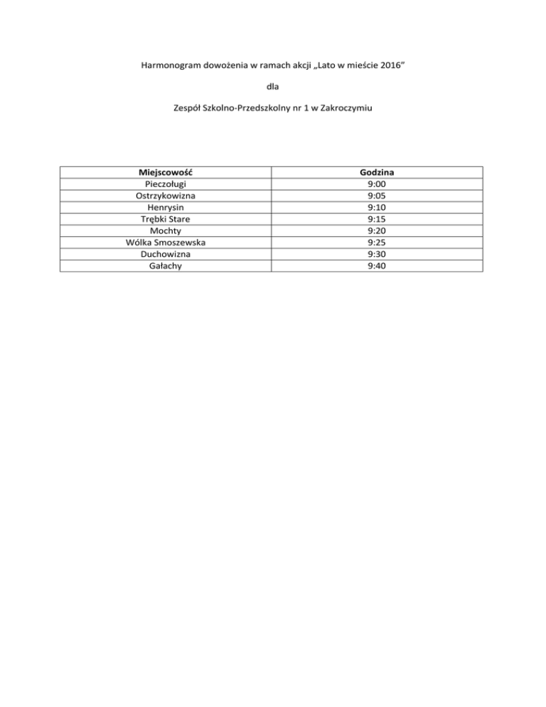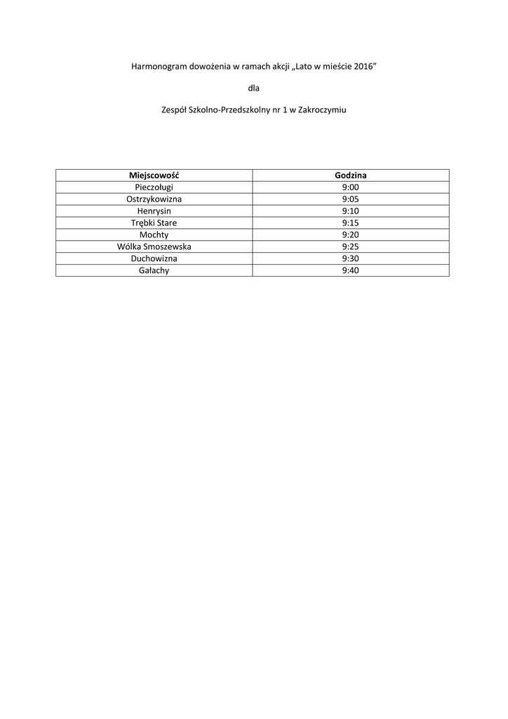 Harmonogram dowożenia w ramach akcji „Lato w mieście 2016” dla Zespół Szkolno-Przedszkolny nr 1 w Zakroczymiu Miejscowość Pieczoługi Ostrzykowizna Henrysin Trębki Stare Mochty Wólka Smoszewska Duchowizna Gałachy Godzina 9:00 9:05 9:10 9:15 9:20 9:25 9:30 9:40