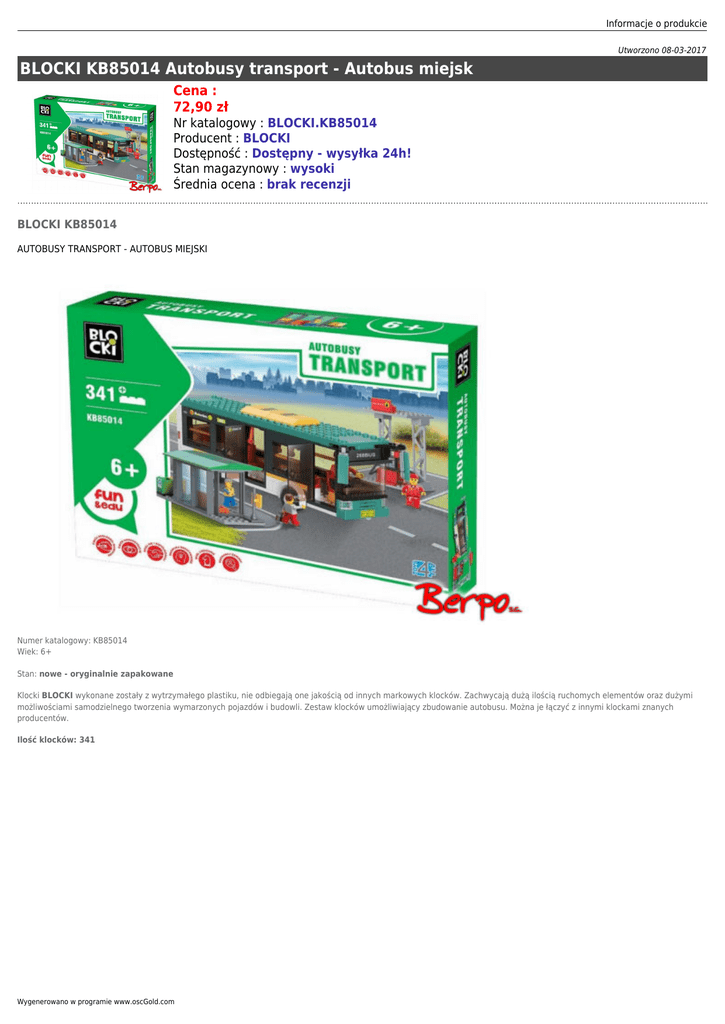 Informacje o produkcie Utworzono 08-03-2017 BLOCKI KB85014 Autobusy transport - Autobus miejsk Cena : 72,90 zł Nr katalogowy : BLOCKI.KB85014 Producent : BLOCKI Dostępność : Dostępny - wysyłka 24h! Stan magazynowy : wysoki Średnia ocena : brak recenzji BLOCKI KB85014 AUTOBUSY TRANSPORT - AUTOBUS MIEJSKI Numer katalogowy: KB85014 Wiek: 6+ Stan: nowe - oryginalnie zapakowane Klocki BLOCKI wykonane zostały z wytrzymałego plastiku, nie odbiegają one jakością od innych markowych klocków. Zachwycają dużą ilością ruchomych elementów oraz dużymi możliwościami samodzielnego tworzenia wymarzonych pojazdów i budowli. Zestaw klocków umożliwiający zbudowanie autobusu. Można je łączyć z innymi klockami znanych producentów. Ilość klocków: 341 Wygenerowano w programie www.oscGold.com Informacje o produkcie Dostępność w salonach: Ilość: Sklep - Złotniki: 7 Sklep - zlikwidowany: 0 Sklep - Szczepankowo: 1 Dostępne opcje BLOCKI KB85014 Autobusy transport - Autobus miejsk » Wiek: 5 - 7 lat, 8 - 11 lat, 12 lat i więcej. Wygenerowano w programie www.oscGold.com