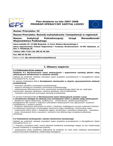Plan działania na lata 2007-2008 PROGRAM OPERACYJNY KAPITAŁ LUDZKI Numer Priorytetu: IX Nazwa Priorytetu: Rozwój wykształcenia i kompetencji w regionach Nazwa Instytucji Pośredniczącej: Województwa Podlaskiego Urząd Marszałkowski Adres siedziby IP: 15-888 Białystok, ul. Kard. Stefana Wyszyńskiego 1 Adres Departamentu Polityki Regionalnej i Funduszy Strukturalnych: 15-691 Białystok, ul. Gen. F. Kleeberga 20 Telefon: 085 74 85 120; 085 65 48 200 Fax: 085 65 48 201 Adres e-mail: [email protected] I. Obszary wsparcia I.1 Preferowane formy wsparcia Działanie 9.1 Wyrównywanie szans edukacyjnych i zapewnienie wysokiej jakości usług edukacyjnych świadczonych w systemie oświaty Zakłada się moŜliwość realizacji wszystkich typów projektów przewidzianych w Szczegółowym Opisie Priorytetów PO KL, to jest: W zakresie Poddziałania 9.1.1 Zmniejszanie nierówności w stopniu upowszechnienia edukacji przedszkolnej - tworzenie ośrodków wychowania przedszkolnego - wsparcie istniejących ośrodków wychowania przedszkolnego - organizowanie alternatywnych form wychowania przedszkolnego takich jak np. wędrujące nauczycielki, dziecięce spotkania, rodzinne spotkania, klub przedszkolaka - kampanie informacyjne promujące edukację przedszkolną W zakresie Poddziałania 9.1.2 Wyrównywanie szans edukacyjnych uczniów z grup o utrudnionym dostępie do edukacji oraz zmniejszanie róŜnic w jakości usług edukacyjnych - dodatkowe zajęcia edukacyjne, dydaktyczno – wyrównawcze, opieka psychologiczno pedagogiczna dla uczniów z większymi potrzebami edukacyjnymi oraz zagroŜonych wczesnym wypadnięciem z systemu oświaty - programy edukacyjne skierowane do dzieci i młodzieŜy znajdujących się poza systemem edukacji na najniŜszych poziomach umoŜliwiające ukończenie etapu kształcenia i kontynuacje nauki, - rozszerzenie oferty szkół o dodatkowe zajęcia, poradnictwo i doradztwo edukacyjno – zawodowe - nowe, innowacyjne formy nauczania i oceniania oraz efektywnego zarządzania placówką oświatową 9.2 Podniesienie atrakcyjności i jakości szkolnictwa zawodowego Zakłada się moŜliwość realizacji wszystkich typów projektów przewidzianych w Szczegółowym Opisie Priorytetów PO KL, tj.: 1. Programy rozwojowe szkół i innych placówek kształcenia zawodowego mające na celu modernizację procesu kształcenia w szczególności poprzez: - dostosowanie oferty kształcenia adekwatnie do tendencji na rynku pracy zwłaszcza wprowadzanie nowych kierunków kształcenia, modernizacja istniejących - uatrakcyjnianie oferty poprzez dodatkowe zajęcia pozalekcyjne i pozaszkolne - włączenie pracodawców w proces kształcenia: praktyki i staŜe - wprowadzanie doradztwa edukacyjno-zawodowego - wprowadzenie opieki pedagogiczno-psychologiczna - wyposaŜenie uczniów w nowoczesne materiały dydaktyczne 2. Diagnozowanie potrzeb szkolnictwa zawodowego w kontekście kierunków rozwoju rynku pracy Działanie 9.3 Upowszechnienie kształcenia ustawicznego w formach szkolnych Zakłada się moŜliwość realizacji wszystkich typów projektów przewidzianych w Szczegółowym Opisie Priorytetów PO KL, tj. : - kampanie informacyjne na rzecz upowszechnienia kształcenia ustawicznego - programy skierowane do osób dorosłych zainteresowanych uzupełnianiem lub podwyŜszaniem swoich kwalifikacji na profilach zarówno ogólnych jak i zawodowych - programy formalnego potwierdzania kwalifikacji zdobytych w sposób nieformalny - doradztwo w zakresie wyboru ścieŜki podnoszenia kwalifikacji z uwzględnieniem tendencji i potrzeb regionalnego rynku pracy - wsparcie dla placówek kształcenia ustawicznego , praktycznego i doskonalenia zawodowego prowadzących kształcenie w formach szkolnych w zakresie podnoszenia jakości oferty edukacyjnej oraz jej adekwatności do potrzeb rynku pracy Działanie 9.4 Wysoko wykwalifikowane kadry systemu oświaty Zakłada się moŜliwość realizacji wszystkich typów projektów przewidzianych w Szczegółowym Opisie Priorytetów PO KL, to jest: - studia podyplomowe i kursy doskonalące dla nauczycieli oraz pracowników placówek kształcenia ustawicznego, praktycznego, zawodowego, instruktorów praktycznej nauki zawodu w zakresie języków obcych, przedmiotów ścisłych technologii informacyjnych, dydaktyki i wychowania, przedmiotów zawodowych - studia podyplomowe, kursy doskonalące dla nauczycieli i pracowników administracji oświatowej w zakresie organizacji, zarządzania, finansowania oraz monitoringu działalności oświatowej, - programy przekwalifikowania nauczycieli szkolnych w związku ze zmieniającą się sytuacją demograficzną w kierunku kształcenia ustawicznego. Działanie 9.5 Oddolne inicjatywy edukacyjne na obszarach wiejskich Zakłada się moŜliwość realizacji wszystkich typów projektów przewidzianych w Szczegółowym Opisie Priorytetów PO KL, tj. : - działania informacyjno-promocyjne i szkoleniowe na rzecz podniesienia świadomości społeczności wiejskich w zakresie korzyści płynących z wykształcenia, szkoleń, rozwijania umiejętności zawodowych innych niŜ w rolnictwie, podnoszenie kwalifikacji zawodowych i rowój zawodowy - inicjatywy na rzecz rozwoju edukacyjnego społeczności wiejskich podnoszenia poziomu wykształcenia i kwalifikacji mieszkańców obszarów wiejskich oraz roju usług edukacyjnych - inicjatywy na rzecz pobudzania świadomości środowisk lokalnych i ich zaangaŜowania w działania na rzecz rozwoju edukacyjnego na wsi I.2 Diagnoza sytuacji oraz identyfikacja potrzeb – uzasadnienie preferowanych form wsparcia 9.1 Wyrównywanie szans edukacyjnych i zapewnienie wysokiej jakości usług edukacyjnych świadczonych w systemie oświaty W województwie podlaskim obszar edukacji charakteryzują wyraźne dysproporcje pomiędzy obszarami wiejskimi a obszarami miejskimi. Dotyczą one poziomu wykształcenia, dostępu do edukacji, jakości oferty edukacyjnej jak teŜ stopnia upowszechnienia znaczenia wykształcenia w rozwoj