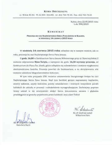 KURIA DIECEZJALNA ul. Widok 80-82; PL 62-800 KALISZ; tel. (62) 766.78.55; Fax. (62) 766.78.60 Kalisz, dnia 22.05.2015 roku L.dz. 590/2015 KOMUNIKAT PROCESJA KU CZCI NAJŚWIĘTSZEGO SERCA PANA JEZUSA W KALISZU, W NIEDZIELĘ, 1 4 CZERWCA 2 0 1 5 ROKU W niedzielę 14 czerwca 2015 roku odbędzie się w naszym mieście, jak co roku, procesja ku czci Najświętszego Serca Pana Jezusa. 0 godz. 16,00 w Sanktuarium Serca Jezusa Miłosiernego przy ul. Stawiszyńskiej 2 zostanie odprawiona Msza Święta, a następnie ok. godz. 16,30 wyruszy procesja, od Sanktuarium do Placu Św. Józefa, gdzie odbędzie się nabożeństwo i zostanie wygłoszona okolicznościowa homilia. Procesja powróci do Sanktuarium, a na skrzyżowaniu ulic zostanie udzielone błogosławieństwo końcowe. W tym roku przypada 250. rocznica ustanowienia liturgicznego święta ku czci Najświętszego Serca Pana Jezusa. Stąd tym bardziej gorąco zapraszamy kapłanów, siostry zakonne, asysty kościelne, poczty sztandarowe i wiernych wszystkich parafii kaliskich do udziału w procesji i nabożeństwie wynagradzającym. Zechciejmy poprzez liczny udział w tej uroczystości złożyć Sercu Jezusowemu szczere i głębokie przebłaganie za grzechy popełnione przez ludzkość. Jezu ufam Tobie! Kanclerz Kurii ROZPORZĄDZENIE Komunikat należy odczytać w kościołach miasta Kalisza w niedzielę 7 czerwca 2015 roku podczas ogłoszeń parafialnych na wszystkich Mszach św. oraz w niedzielę 14 czerwca 2015 roku podczas ogłoszeń parafialnych na Mszach św. dopołudniowych. j/
