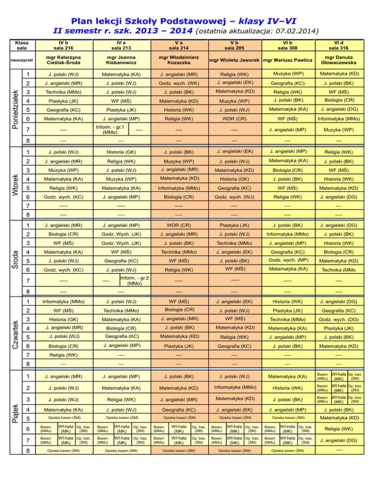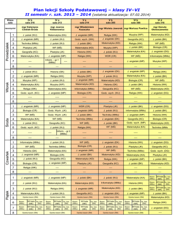 Plan lekcji Szkoły Podstawowej – klasy IV–VI II semestr r. szk. 2013 – 2014 (ostatnia aktualizacja: 07.02.2014) IV b sala 216 IV e sala 213 Va sala 214 nauczyciel mgr Katarzyna Cieślak-Środa mgr Joanna Klebanowicz mgr Włodzimierz Kozaczka 1 J. polski (WJ) Matematyka (KA) J. angielski (MR) Religia (WK) Muzyka (WP) Matematyka (KD) 2 J. angielski (MR) J. polski (WJ) Godz. wych. (WK) J. angielski (EK) Geografia (KC) J. polski (BK) 3 Technika (MMo) J. polski (WJ) J. polski (BK) Matematyka (KD) Religia (WK) WF (MŚ) 4 Plastyka (JK) WF (MŚ) Matematyka (KD) Muzyka (WP) J. polski (BK) Biologia (CR) 5 Geografia (KC) Plastyka (JK) Historia (WK) J. polski (WJ) Matematyka (KA) J. angielski (DG) 6 Matematyka (KA) J. angielski (MP) Religia (WK) WDR (CR) WF (MŚ) Informatyka (MMo) 7 ---- Inform. - gr.1 (MMo) ---- ---- J. angielski (MP) Muzyka (WP) 8 ---- ---- ---- ---- ---- ---- J. polski (WJ) Historia (GK) J. polski (BK) J. angielski (EK) J. angielski (MP) Religia (WK) J. polski (BK) Poniedziałek Klasa sala ---- Vb sala 205 VI b sala 308 mgr Wioleta Jaworek mgr Mariusz Pawlica VI d sala 316 mgr Danuta Głowaczewska 9 Wtorek 1 2 J. angielski (MR) Religia (WK) Muzyka (WP) J. polski (WJ) Matematyka (KA) 3 Muzyka (WP) J. polski (WJ) J. angielski (MR) Matematyka (KD) Biologia (CR) WF (MŚ) 4 Matematyka (KA) Muzyka (WP) Matematyka (KD) Historia (GK) J. polski (BK) Historia (WK) 5 Religia (WK) Matematyka (KA) Informatyka (MMo) Geografia (KC) WF (MŚ) Matematyka (KD) 6 Godz. wych. (KC) J. angielski (MP) Biologia (CR) Godz. wych. (WJ) Religia (WK) J. angielski (DG) 7 ----- ----- ----- ---- ---- ---- 8 ----- ----- ----- ----- ----- ----- 1 J. angielski (MR) J. angielski (MP) WDR (CR) Plastyka (JK) J. polski (BK) J. angielski (DG) 2 Biologia (CR) Godz. Wych. (JK) J. angielski (MR) J. polski (WJ) Informatyka (MMo) J. polski (BK) 3 WF (MŚ) Godz. Wych. (JK) J. polski (BK) Technika (MMo) J. angielski (MP) Historia (WK) 4 Matematyka (KA) WF (MŚ) Technika (MMo) J. angielski (EK) Geografia (KC) Biologia (CR) 5 J. polski (WJ) Geografia (KC) WF (MŚ) J. polski (BK) Godz. wych. (MP) Matematyka (KD) Religia (WK) WF (MŚ) Matematyka (KA) Technika (MMo ----- ----- ----- ---- ---- ---- ---- ---- Historia (WK) J. angielski (DG) Środa 9 6 Godz. wych. (KC) J. polski (WJ) Inform. - gr.2 (MMo) 7 ----- 8 ---- ---- Informatyka (MMo) J. polski (WJ) WF (MŚ) J. angielski (EK) ---- 9 Czwartek 1 2 WF (MŚ) Technika (MMo) Biologia (CR) J. polski (WJ) Plastyka (JK) Geografia (KC) 3 Historia (GK) Matematyka (KA) J. angielski (MR) WF (MŚ) Technika (MMo) Godz. wych. (DG) 4 J. angielski (MR) Biologia (CR) J. polski (BK) Matematyka (KD) Matematyka (KA) Plastyka (JK) 5 J. polski (WJ) Geografia (KC) Matematyka (KD) Religia (WK) J. angielski (MP) J. polski (BK) 6 Biologia (CR) J. angielski (MP) Plastyka (JK) Geografia (KC) J. polski (BK) Matematyka (KD) 7 Religia (WK) ---- ---- ---- ---- ---- 8 ---- ---- ---- ---- ---- ---- 1 J. angielski (MR) J. angielski (MP) J. polski (BK) J. polski (WJ) Matematyka (KA) Basen Wf-hala Op. bas. (MMu) (ŚM) (MK) 2 J. polski (WJ) Matematyka (KA) Matematyka (KD) Informatyka (MMo) Historia (WK) Basen Wf-hala Op. bas. (MMu) (ŚM) (MK) 3 J. polski (WJ) Religia (WK) J. angielski (MR) Matematyka (KD) J. polski (BK) Basen Wf-hala Op. bas. (MMu) (ŚM) (MK) 4 Matematyka (KA) J. polski (WJ) Geografia (KC) J. angielski (EK) J. angielski (MP) J. polski (BK) 5 Opieka basen (ŚM) Opieka basen (ŚM) Opieka basen (ŚM) Opieka basen (ŚM) Opieka basen (ŚM) Matematyka (KD) Piątek 9 6 Basen (MMu) Wf-hala Op. bas. (ŚM) (MK) Basen (MMu) Wf-hala Op. bas. (ŚM) (MK) Basen (MMu) Wf-hala (MK) Op. bas. (ŚM) Basen (MMu) Wf-hala Op. bas. (ŚM) (MK) Basen (MMu) Wf-hala Op. bas. (ŚM) (MK) Religia (WK) 7 Basen (MMu) Wf-hala Op. bas. (ŚM) (MK) Basen (MMu) Wf-hala Op. bas. (ŚM) (MK) Basen (MMu) Wf-hala (MK) Op. bas. (ŚM) Basen (MMu) Wf-hala Op. bas. (ŚM) (MK) Basen (MMu) Wf-hala Op. bas. (ŚM) (MK) J. angielski (DG) 8 Opieka basen (ŚM) Opieka basen (ŚM) Opieka basen (ŚM) Opieka basen (ŚM) Opieka basen (ŚM) ----