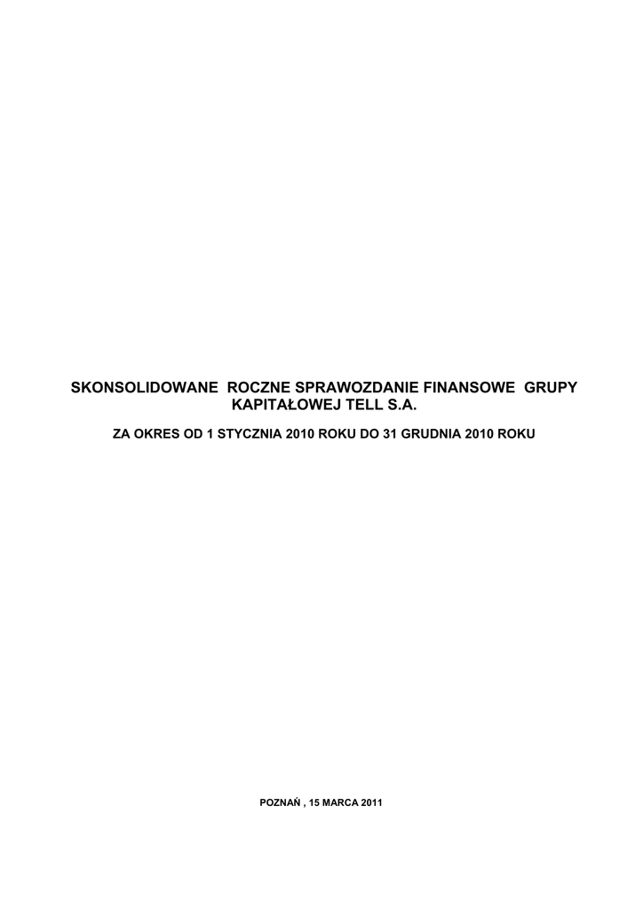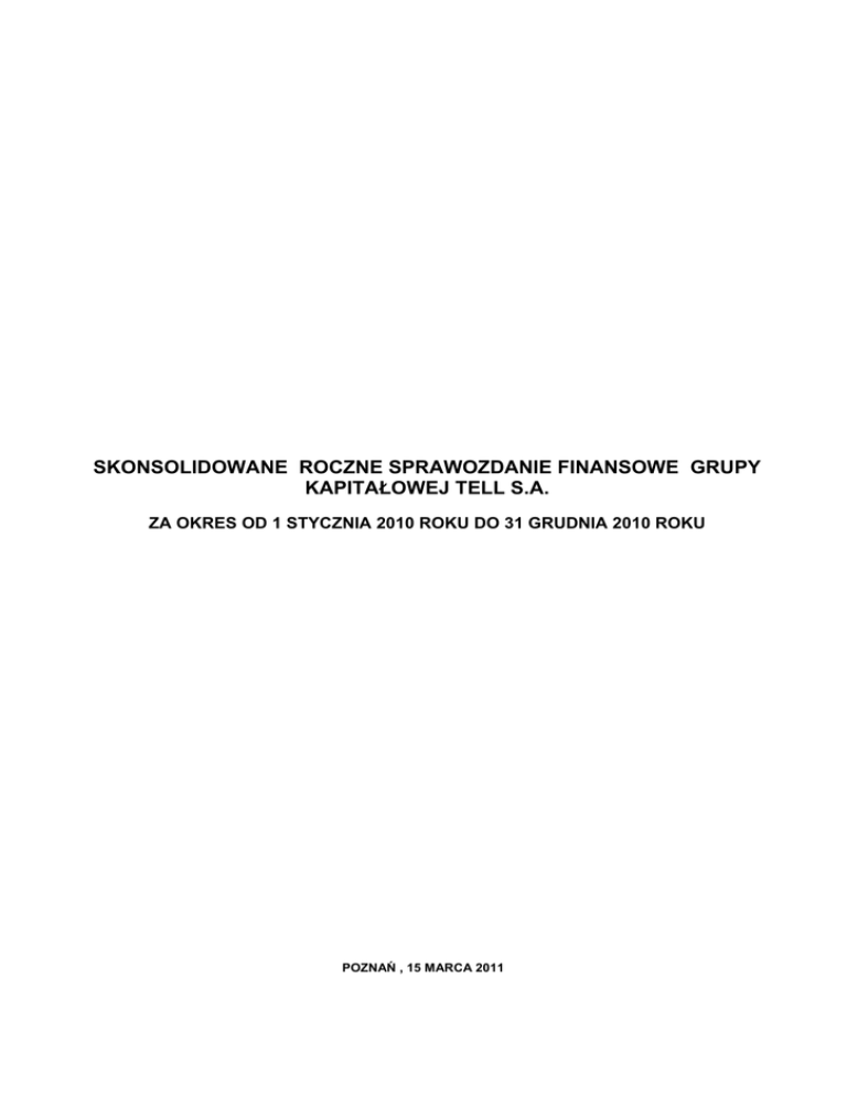 SKONSOLIDOWANE ROCZNE SPRAWOZDANIE FINANSOWE GRUPY KAPITAŁOWEJ TELL S.A. ZA OKRES OD 1 STYCZNIA 2010 ROKU DO 31 GRUDNIA 2010 ROKU POZNAŃ , 15 MARCA 2011 Nazwa jednostki: Grup Kapitałowa Tell S.A. Okres objęty sprawozdaniem finansowym: 01.01-31.12.2010 Poziom zaokrągleń: wszystkie kwoty wyrażone są w tysiącach złotych polskich (o ile nie wskazano inaczej) Waluta sprawozdawcza: złoty polski PLN SPIS TREŚCI Skonsolidowane roczne sprawozdanie z sytuacji finansowej ..........................................................................................................4 Skonsolidowane roczne sprawozdanie z całkowitych dochodów.....................................................................................................5 Skonsolidowane roczne sprawozdanie z przepływów pieniężnych..................................................................................................6 Skonsolidowane roczne sprawozdanie ze zmian w kapitale własnym.............................................................................................7 Wybrane dane finansowe przeliczone na euro ................................................................................................................................8 Wprowadzenie do skonsolidowanego rocznego sprawozdania finansowego sporządzonego za okres od 01.01.2010 roku do 31.12.2010 roku................................................................................................................................................................................9 1. Informacje ogólne.............................................................................................................................................................9 Informacje o jednostce dominującej.............................................................................................................................9 Okresy prezentowane ..................................................................................................................................................9 Skład organów jednostki dominujące według stan na 31 grudnia 2010 roku. ............................................................9 Biegli rewidenci ............................................................................................................................................................9 Notowania na rynku regulowanym .............................................................................................................................10 Grupa kapitałowa Tell S.A. na 31 grudnia 2010 roku.................................................................................................10 Oświadczenie zarządu jednostki dominującej............................................................................................................11 Zatwierdzenie skonsolidowanego sprawozdania finansowego..................................................................................11 Zgodność z międzynarodowymi standardami sprawozdawczości finansowej. ..........................................................11 Sezonowość i cykliczność działalności ..................................................................................................................11 Założenie kontynuacji działalności gospodarczej i porównywalność sprawozdań finansowych............................11 2. Stosowane zasady rachunkowości ................................................................................................................................12 2.1. Zasady rachunkowości...............................................................................................................................................12 2.2. Podstawa konsolidacji oraz zasady konsolidacji........................................................................................................12 2.3. Istotne wartości oparte ma profesjonalnym osądzie i szacunkach ............................................................................12 2.4. Wartości niematerialne...............................................................................................................................................13 2.5. Wartość firmy .............................................................................................................................................................13 2.6. Rzeczowe aktywa trwałe............................................................................................................................................13 2.7. Leasing.......................................................................................................................................................................14 2.8. Zapasy .......................................................................................................................................................................14 2.9. Koszty finansowania zewnętrznego ...........................................................................................................................14 2.10. Instrumenty Finansowe ..........................................................................................................................................14 2.11. Należności z tytułu dostaw i usług .........................................................................................................................14 2.12. Zobowiązania finansowe oraz instrumenty kapitałowe ..........................................................................................14 2.13. Kredyty bankowe....................................................................................................................................................14 2.14. Zobowiązania z tytułu dostaw i usług.....................................................................................................................14 2.15. Instrumenty kapitałowe ..............................................