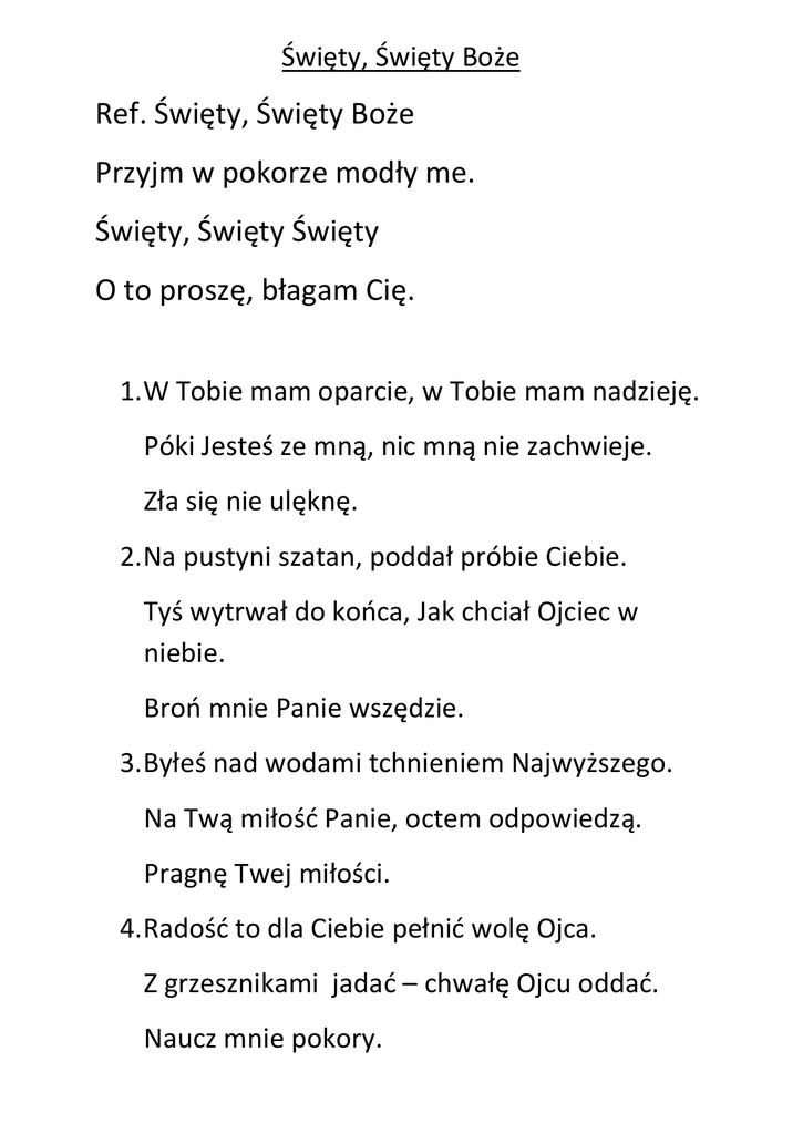 Święty, Święty Boże Ref. Święty, Święty Boże Przyjm w pokorze modły me. Święty, Święty Święty O to proszę, błagam Cię. 1. W Tobie mam oparcie, w Tobie mam nadzieję. Póki Jesteś ze mną, nic mną nie zachwieje. Zła się nie ulęknę. 2. Na pustyni szatan, poddał próbie Ciebie. Tyś wytrwał do końca, Jak chciał Ojciec w niebie. Broń mnie Panie wszędzie. 3. Byłeś nad wodami tchnieniem Najwyższego. Na Twą miłość Panie, octem odpowiedzą. Pragnę Twej miłości. 4. Radość to dla Ciebie pełnić wolę Ojca. Z grzesznikami jadać – chwałę Ojcu oddać. Naucz mnie pokory.