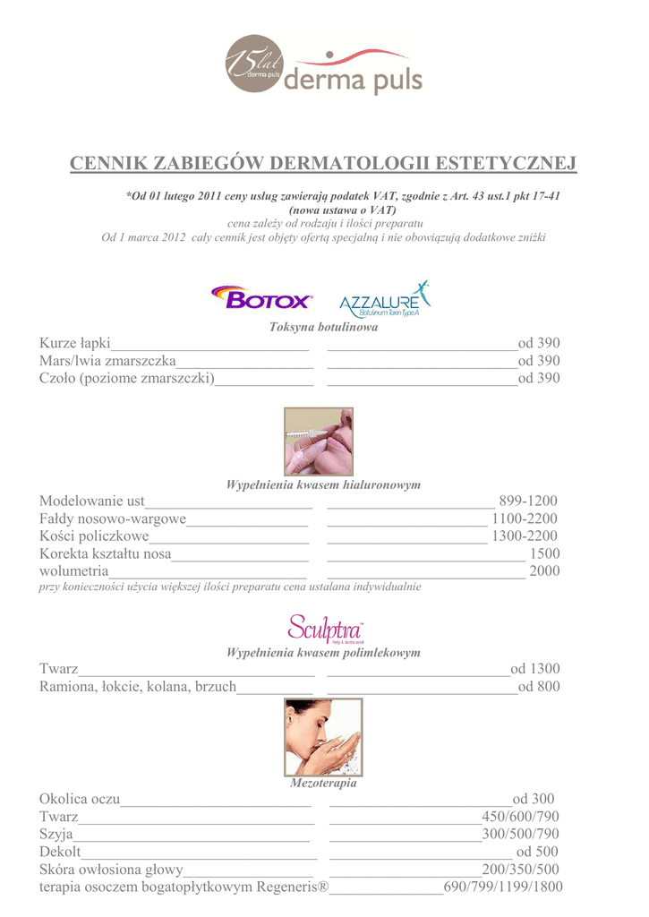 CENNIK ZABIEGÓW DERMATOLOGII ESTETYCZNEJ *Od 01 lutego 2011 ceny usług zawierają podatek VAT, zgodnie z Art. 43 ust.1 pkt 17-41 (nowa ustawa o VAT) cena zależy od rodzaju i ilości preparatu Od 1 marca 2012 cały cennik jest objęty ofertą specjalną i nie obowiązują dodatkowe zniżki Toksyna botulinowa Kurze łapki__________________________ _________________________od 390 Mars/lwia zmarszczka__________________ _________________________od 390 Czoło (poziome zmarszczki)_____________ _________________________od 390 Wypełnienia kwasem hialuronowym Modelowanie ust______________________ Fałdy nosowo-wargowe________________ Kości policzkowe_____________________ Korekta kształtu nosa__________________ wolumetria__________________________ ______________________ 899-1200 _____________________ 1100-2200 _____________________ 1300-2200 __________________________ 1500 __________________________ 2000 przy konieczności użycia większej ilości preparatu cena ustalana indywidualnie Wypełnienia kwasem polimlekowym Twarz_______________________________ ________________________od 1300 Ramiona, łokcie, kolana, brzuch__________ _________________________od 800 Mezoterapia Okolica oczu_________________________ ________________________od 300 Twarz_______________________________ ____________________450/600/790 Szyja_______________________________ ____________________300/500/790 Dekolt_______________________________ ________________________ od 500 Skóra owłosiona głowy_________________ ____________________200/350/500 terapia osoczem bogatopłytkowym Regeneris®_______________690/799/1199/1800 Rozstępy_____________________________ _________________________od 300 Blizny_______________________________ _________________________od 150 Bezinwazyjny lifting twarzy Linia brwi___________________________ Okolica oczu _________________________od 990 ( linia brwi +okolica skroniowa + obszar pod oczami) ________________________od 2500 Linia żuchwy_________________________ ___________________________1800 Linia szyi i podbródka__________________ ________________________ od 2990 Policzki i \linia żuchwy________________ ________________________ od 5900 Bezinwazyjny lifting powiek i ciała Cała twarz___________________________ Czoło_______________________________ Oczy_________________________________ Ciało (brzuch, ramiona, pośladki)__________ ________________________od 4500 ________________________od 3500 ________________________od 3999 ____ cena indywidualnie ustalana z lekarzem Nowoczesna technika mezoterapii Okolice oczu_________________________ Szyja________________________________ Dekolt_______________________________ Dłonie_______________________________ Głowa_______________________________ Twarz, okolice oczu____________________ Twarz, ok. oczu, szyja__________________ Twarz, ok. oczu, szyja, dekolt____________ Roller_______________________________ Stempel (okolica oczu)_________________ Roller + Regeneris ____________________ ____________________________249 ____________________________279 ____________________________349 ____________________________299 ____________________________299 ____________________________469 ____________________________549 ____________________________599 ____________________________350 ____________________________349 ____________________________690 Mikrodermabrazja Twarz_______________________________ Szyja________________________________ Dekolt_______________________________ Twarz + szyja_________________________ Twarz + szyja + dekolt__________________ ________________________129/ 169 ____________________________120 ____________________________169 ____________________________239 _________________________299/429 Peelingi chemiczne (lekarskie) Kwas TCA(twarz)-dla uczniów i studentów Kwas TCA+Jessner__________________ Topix 15%(twarz)____________________ Easy Peel___________________________ Peeling migdałowy 50/70%____________ Peeling migdałowy + TCA_____________ Kwas glikolowy 50/70%_______________ Gliko Peel__________________________ Turnover Peel_______________________ Jessner____________________________ Cosmelan maska_____________________ Maska tretoinowa____________________ Peeling kawitacyjny__________________ Cryolift(twarz)______________________ Sonoforeza__________________________ ______________________________100 ______________________________300 ______________________________250 ______________________________300 __________________________ 190/200 ______________________________200 __________________________140/150 ______________________________220 ______________________________300 ______________________________190 ______________________________999 ______________________________300 ______________________________150 ___________________________79/249 ___________________________70-120 Leczenie nadpotliwości – botox (botulina) Pachy______________________________ __________________________od 1200 Stopy______________________________ __________________________od 1500 Dłonie_____________________________ __________________________od 1200 Czoło______________________________ ___________________________od 600 owłosiona skóra głowy________________ ___________________________od 900 znieczulenie anestezjologiczne__________ __________________________ od 300 Zabiegi na dłonie Usuwanie plam, regeneracji, ujędrnianie, poprawę struktury i napięcia Zabiegi z wykorzystaniem mezoterapii, wypełnieniem, laserów oraz peelingów Indywidualny program zostanie dobrany na wizycie lekarskiej Mezoterapia (obie dłonie)_______________ Mikrodermabrazja_____________________ laser Mosaic (dłoń)____________________ laser CO2 (dłoń)______________________ __________________________ od 300 _____________________________200 _____________________________399 _____________________________449 CENNIK LASEROTERAPII Laser frakcyjny Laserem CO2 można z powodzeniem odnawiać strukturę skóry - usuwać różnorodne blizny, zmarszczki, objawy fotostarzenia skóry, niejednolity odcień skóry
