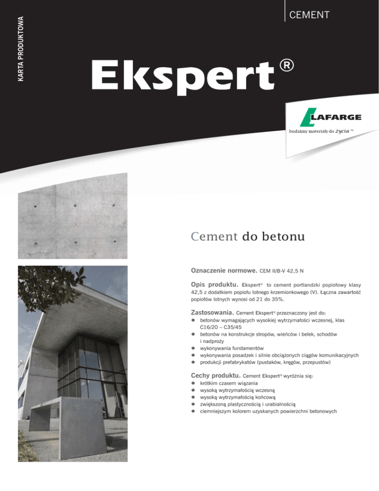 karta produktowa cement TM Cement do betonu Oznaczenie normowe. CEM II/B-V 42,5 N Opis produktu. Ekspert® to cement portlandzki popiołowy klasy 42,5 z dodatkiem popiołu lotnego krzemionkowego (V). Łączna zawartość popiołów lotnych wynosi od 21 do 35%. Zastosowania. Cement Ekspert® przeznaczony jest do: betonów wymagających wysokiej wytrzymałości wczesnej, klas C16/20 – C35/45 betonów na konstrukcje stropów, wieńców i belek, schodów i nadproży wykonywania fundamentów wykonywania posadzek i silnie obciążonych ciągów komunikacyjnych produkcji prefabrykatów (pustaków, kręgów, przepustów) Cechy produktu. Cement Ekspert® wyróżnia się: krótkim czasem wiązania wysoką wytrzymałością wczesną wysoką wytrzymałością końcową zwiększoną plastycznością i urabialnością ciemniejszym kolorem uzyskanych powierzchni betonowych Korzyści z zastosowania produktu. Użycie cementu Ekspert® skraca czas realizacji inwestycji dzięki szybkiemu przyrostowi wytrzymałości, pozwala na realizacje prac budowlanych w napiętym harmonogramie robót oraz skrócenie procesu produkcyjnego prefabrykatów i zwiększenie rotacji form lub szalunków umożliwia zmniejszenie dozowania cementu w mieszance betonowej i zaprawach skraca czas przygotowania mieszanki betonowej umożliwia uzyskanie betonów o wyższej klasie wytrzymałości minimalizuje niebezpieczeństwo zbyt małego dozowania cementu w mieszance betonowej i zaprawach ułatwia pompowanie mieszanki betonowej i rozprowadzanie mieszanki po szalunku oraz powierzchniach poziomych ułatwia zagęszczanie mieszanki Warunki stosowania. Cement Ekspert® przy dozowaniu zgodnym z normą PN-EN 206-1 może być stosowany w warunkach agresywnego oddziaływania środowiska na beton i zbrojenie z wyjątkiem klas ekspozycji XF3 i XF4. Cement Ekspert® produkowany jest z naturalnych składników, w związku z czym możliwe są niewielkie różnice w jego kolorystyce. Zdrowie i bezpieczeństwo. Cement jest sklasyfikowany jako substancja drażniąca. Częste wdychanie dużych ilości pyłu cementowego może powodować ryzyko wystąpienia chorób. Kontakt cementu (suchego lub mokrego) z oczami może powodować poważne i nieodwracalne obrażenia. Dodatkowe informacje, w tym dotyczące kontroli rozpuszczalnego chromu sześciowartościowego, zawarte są w Karcie Charakterystyki Preparatu Niebezpiecznego zamieszczonej na stronie www.lafarge-cement.pl. Gwarancja. Cement Ekspert® objęty jest 60-dniową gwarancją jakości obejmującą utrzymanie zadeklarowanych przez Lafarge Cement parametrów jakościowych i redukcję szkodliwego Cr+VI. Warunki przechowywania: Cement Ekspert ® dostępny jest w 25-kilogramowych workach, na paletach ofoliowanych 1400 kg. Właściwości fizyko-chemiczne Telefony Powierzchnia właściwa 4500–4900 cm2/g Początek czasu wiązania 160–200 min Koniec czasu wiązania 220–260 min 2-dniowa wytrzymałość na ściskanie oznaczona zgodnie z PN-EN 196-1 23–29 MPa 28-dniowa wytrzymałość na ściskanie oznaczona zgodnie z PN-EN 196-1 48–56 MPa Gęstość właściwa 2,8–3,0 kg/dm3 Stopień jasności badany kolorymetrem 63–64 (gdzie 100 to biel, a 0 to czerń) Wodożądność 28–30% Zawartość siarczanów SO3 2,3–3,1% Zawartość chlorków Cl 0,03–0,05% Zawartość alkaliów (eq Na2O) 1,0–1,3% Zawartość popiołu lotnego krzemionkowego 25–30% - Doradztwo techniczne tel. +48 41 248 75 33 1.01 09_2009 LAFARGE CEMENT SA ul. Warszawska 110 28-366 Małogoszcz www.lafarge.pl