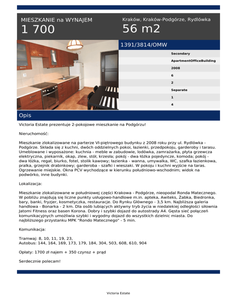 Kraków, Kraków-Podgórze, Rydlówka MIESZKANIE na WYNAJEM 56 m2 1 700 1391/3814/OMW Secondary ApartmentOfficeBuilding 2008 6 2 Separate 1 4 Opis Victoria Estate prezentuje 2-pokojowe mieszkanie na Podgórzu! Nieruchomość: Mieszkanie zlokalizowane na parterze VI-piętrowego budynku z 2008 roku przy ul. Rydlówka Podgórze. Składa się z kuchni, dwóch oddzielnych pokoi, łazienki, przedpokoju, garderoby i tarasu. Umeblowane i wyposażone: kuchnia - meble w zabudowie, lodówka, zamrażarka, płyta grzewcza elektryczna, piekarnik, okap, zlew, stół, krzesła; pokój - dwa łóżka pojedyncze, komoda; pokój dwa łóżka, regał, biurko, fotel, stolik kawowy; łazienka - wanna, umywalka, WC, szafka łazienkowa, pralka, grzejnik drabinkowy; garderoba - szafki i wieszaki. W pokoju i kuchni wyjście na taras. Ogrzewanie miejskie. Okna PCV wychodzące w kierunku południowo-wschodnim; widok na podwórko, inne budynki. Lokalizacja: Mieszkanie zlokalizowane w południowej części Krakowa - Podgórze, nieopodal Ronda Matecznego. W pobliżu znajdują się liczne punkty usługowo-handlowe m.in. apteka, Awiteks, Żabka, Biedronka, bary, banki, fryzjer, kosmetyczka, restauracje. Do Rynku Głównego - 3,5 km. Najbliższa galeria handlowa - Bonarka - 2 km. Dla osób lubiących aktywny tryb życia w niedalekiej odległości siłownia Jatomi Fitness oraz basen Korona. Dobry i szybki dojazd do autostrady A4. Gęsta sieć połączeń komunikacyjnych umożliwia szybki i wygodny dojazd do wszystkich dzielnic miasta. Do najbliższego przystanku MPK "Rondo Matecznego" - 5 min. Komunikacja: Tramwaj: 8, 10, 11, 19, 23, Autobus: 144, 164, 169, 173, 179, 184, 304, 503, 608, 610, 904 Opłaty: 1700 zł najem + 350 czynsz + prąd Serdecznie polecam! Victoria Estate Paulina Zajdel tel. +48 789 453 049 email: [email protected] Victoria Estate Powered by TCPDF (www.tcpdf.org)