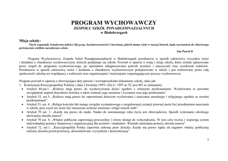 PROGRAM WYCHOWAWCZY ZESPOŁU SZKÓŁ PONADGIMNAZJALNYCH w Białobrzegach Misja szkoły: Niech wspaniałe świadectwa miłości Ojczyzny, bezinteresowności i heroizmu, jakich mamy wiele w naszej historii, będą wyzwaniem do zbiorowego poświęcenia wielkim narodowym celom. Jan Paweł II Program Wychowawczy Zespołu Szkół Ponadgimnazjalnych w Białobrzegach przedstawia w sposób całościowy wszystkie treści i działania o charakterze wychowawczym, których podejmuje się szkoła. Powstał w oparciu o wizję i misję szkoły, które zostały opracowane przez zespół ds. programu wychowawczego, po uprzednim zdiagnozowaniu potrzeb uczniów i nauczycieli oraz oczekiwań rodziców. Przedstawia w sposób całościowy treści i działania o charakterze wychowawczym podejmowane w szkole i jest realizowany przez całą społeczność szkolną we współpracy z rodzicami oraz organizacjami i instytucjami wspomagającymi procesy wychowawcze. Program powstał w oparciu o obowiązujące akty prawne i wewnątrzszkolne dokumenty szkoły, takie jak: Konstytucja Rzeczypospolitej Polskiej z dnia 2 kwietnia 1997r. (Dz.U. 1997 nr 78, poz.483 ze zmianami); Artykuł 48,ust.1: „Rodzice mają prawo do wychowywania dzieci zgodnie z własnymi przekonaniami. Wychowanie to powinno uwzględniać stopień dojrzałości dziecka, a także wolność jego sumienia i wyznania oraz jego przekonania”. Artykuł 53, ust.3: „Rodzice mają prawo do zapewnienia dzieciom wychowania i nauczania moralnego i religijnego zgodnie ze swoimi przekonaniami”. Artykuł 53, ust. 4: „Religia kościoła lub innego związku wyznaniowego o uregulowanej sytuacji prawnej może być przedmiotem nauczania w szkole, przy czym nie może być naruszona wolność sumienia i religii innych osób”. Artykuł 70 ust. 1: „Każdy ma prawo do nauki. Nauka do osiemnastego roku życia jest obowiązkowa. Sposób wykonania szkolnego obowiązku określa ustawa”. Artykuł 70 ust. 4: „Władze publiczne zapewniają powszechny i równy dostęp do wykształcenia. W tym celu tworzą i wspierają system indywidualnej pomocy finansowej i organizacyjnej dla uczniów i studentów. Warunki udzielania pomocy określa ustawa”. Artykuł 72, ust.1: „Rzeczypospolita Polska zapewnia ochronę praw dziecka. Każdy ma prawo żądać od organów władzy publicznej ochrony dziecka przed przemocą, okrucieństwem, wyzyskiem i demoralizacją”. 1 Ustawa o systemie oświaty z dnia 7 września 1991 r. (Dz. U. Z 2015r. poz. 2156 ze zmianami) Artykuł 1, pkt 1 i 2: „System oświaty zapewnia w szczególności: a) Realizację prawa każdego obywatela Rzeczypospolitej Polskiej od kształcenia się oraz prawa dzieci i młodzieży do wychowania i opieki, odpowiednich do wieku i osiągniętego rozwoju. b) Wspomaganie przez szkołę wychowawczej roli rodziny”. Rozporządzenie MEN z dn. 28 sierpnia 2014 r. w sprawie podstawy programowej kształcenia ogólnego (z późniejszymi zmianami). Powszechna Deklaracja Praw Człowieka z 10 grudnia 1948r. Konwencja o Prawach Dziecka Organizacji Narodów Zjednoczonych z 1989r. Europejska Konwencja o Ochronie Praw Człowieka i podstawowych Wolności z 4 listopada 1950r. Deklaracja Praw Dziecka z 1959r. Statut Zespołu Szkół Ponadgimnazjalnych w Białobrzegach. Wartości i zadania, którym Szkoła chce nadać pierwszeństwo: Kształtowanie odpowiedzialnej osobowości ucznia w oparciu o empatię wobec drugiego człowieka, dojrzałe i sprawne funkcjonowanie we współczesnym świecie, wykorzystywanie wiadomości i umiejętności w rozwiązywaniu problemów, samodzielność oraz dbałość o zdrowie swoje i innych. Wychowanie obywatelskie i patriotyczne, którego podstawą jest własne niepodległe państwo, Kształtowanie światopoglądu jako kontynuacji historycznego dziedzictwa ludzkości i wartości ogólnoludzkich, Przygotowywanie do uczestnictwa w życiu społeczeństwa demokratycznego, Rozbudzanie postawy tolerancji dla odmienności narodowych, kulturowych, wyznaniowych, rasowych i światopoglądowych, Znajomość i poszanowanie praw dziecka, ucznia, człowieka i obywatela, Uświadamianie prawa każdego człowieka do życia i godnej śmierci Unowocześnianie przez nauczycieli treści, metod i form kształcenia, Wychowywanie uczniów na miarę obywateli XXI wieku. 2 „Wizja to realistyczna, wiarygodna, atrakcyjna przyszłość dla Twojej szkoły. Jest to określenie przeznaczenia, do którego powinna dążyć szkoła, to przyszłość, która na wiele różnych sposobów jest lepsza, naznaczona większym sukcesem lub bardziej pożądana dla Twojej szkoły, niż to miejsce w chwili obecnej.” B.Naus Wizja absolwenta: Absolwent naszej szkoły swój system wartości opiera na: miłości, mądrości, bezpieczeństwie i poszanowaniu tradycji, powinien: być wszechstronnie przygotowany do dalszego kształcenia w kraju i za granicą lub do pracy zawodowej, być przygotowanym do życia w społeczeństwie i w rodzinie, umieć porozumiewać się i współpracować z innymi, znać i szanować historię, kulturę i tradycję narodową z jej regionalnym bogactwem, umieć żyć w atmosferze tolerancji, szacunku i godności dla siebie i drugiego człowieka, być kreatywnym, znać języki obce, umieć posługiwać się nimi i być przygotowanym do życia w zintegrowanej Europie, umieć dokonywać wyborów i ponosić ich konsekwencje, być wrażliwym na piękno przyrody i mieć poczucie odpowiedzialności za stan środowiska naturalnego, znać i umieć stosować zasady ekonomiczne wolnego rynku, być wolny od wpływów i zagrożeń patologicznych, rozwijać w sobie dociekliwość poznawczą, ukierunkowaną na poszukiwanie prawdy. Nauczyciele powinni dążyć do wszechstronnego rozwoju ucznia jako nadrzędnego celu pracy edukacyjnej. Edukacja szkolna polega na harmonijnej realizacji przez nauczycieli zadań w zakresie nauczania, kształcenia umiejętności i wychowania. Zadania te tworzą wzajemnie uzupełniające się równoważne wymiary pr