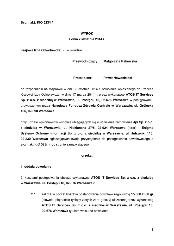 Sygn. akt: KIO 523/14 WYROK z dnia 7 kwietnia 2014 r. Krajowa Izba Odwoławcza - w składzie: Przewodniczący: Małgorzata Rakowska Protokolant: Paweł Nowosielski po rozpoznaniu na rozprawie w dniu 2 kwietnia 2014 r. odwołania wniesionego do Prezesa Krajowej Izby Odwoławczej w dniu 17 marca 2014 r. przez wykonawcę ATOS IT Services Sp. z o.o. z siedzibą w Warszawie, ul. Postępu 18, 02-676 Warszawa w postępowaniu prowadzonym przez Narodowy Fundusz Zdrowia Centralę w Warszawie, ul. Grójecka 186, 02-390 Warszawa przy udziale wykonawców wspólnie ubiegających się o udzielenie zamówienia 4pi Sp. z o.o. z siedzibą w Warszawie, ul. Niekłańska 27/5, 02-924 Warszawa (lider) i Enigma Systemy Ochrony Informacji Sp. z o.o. z siedzibą w Warszawie, ul. Jutrzenki 116, 02-230 Warszawa zgłaszających swoje przystąpienie do postępowania odwoławczego o sygn. akt KIO 523/14 po stronie zamawiającego orzeka: 1. oddala odwołanie 2. kosztami postępowania obciąża wykonawcę ATOS IT Services Sp. z o.o. z siedzibą w Warszawie, ul. Postępu 18, 02-676 Warszawa i: 2.1. zalicza w poczet kosztów postępowania odwoławczego kwotę 15 000 zł 00 gr (słownie: piętnaście tysięcy złotych zero groszy) uiszczoną przez wykonawcę ATOS IT Services Sp. z o.o. z siedzibą w Warszawie, ul. Postępu 18, 02-676 Warszawa tytułem wpisu od odwołania 1 2.2. zasądza od wykonawcy ATOS IT Services Sp. z o.o. z siedzibą w Warszawie, ul. Postępu 18, 02-676 Warszawa na rzecz Narodowego Funduszu Zdrowia Centrali w Warszawie, ul. Grójecka 186, 02-390 Warszawa kwotę 3 600 zł 00 gr (słownie: trzy tysiące sześćset złotych zero groszy), stanowiącą koszty postępowania odwoławczego poniesione z tytułu wynagrodzenia pełnomocnika Stosownie do art. 198a i 198b ustawy z dnia 29 stycznia 2004 r. - Prawo zamówień publicznych (Dz. U. z 2013 r., poz. 907) na niniejszy wyrok - w terminie 7 dni od dnia jego doręczenia - przysługuje skarga za pośrednictwem Prezesa Krajowej Izby Odwoławczej do Sądu Okręgowego w Warszawie. Przewodniczący: ……….……… 2 Sygn. akt: KIO 523/14 Uzasadnienie Narodowy Fundusz Zdrowia Centrala w Warszawie, zwany dalej „zamawiającym”, działając na podstawie przepisów ustawy dnia 29 stycznia 2004 r. Prawo zamówień publicznych (Dz. U. z 2013 r., poz. 907), zwanej dalej „ustawą Pzp”, prowadzi, w trybie przetargu ograniczonego, postępowanie o udzielenie zamówienia publicznego na „Świadczenie usług doradczych w ramach programu wdrożenia silnych mechanizmów identyfikacji i uwierzytelniania na potrzeby systemu RUM II dla Centrali NFZ”. Ogłoszenie o przedmiotowym zamówieniu zostało opublikowane w Dzienniku Urzędowym Unii Europejskiej z dnia 20 września 2013 r., nr 2013/S 183-315945. W dniu 7 marca 2014 r. (pismem z tej samej daty) zamawiający poinformował wykonawcę ATOS IT Services Sp. z o.o. z siedzibą w Warszawie, zwanego dalej „odwołującym”, o wyborze oferty wykonawców wspólnie ubiegających się o udzielenie zamówienia, tj. 4pi Sp. z o.o. z siedzibą w Warszawie oraz Enigma Systemy Ochrony Informacji Sp. z o.o. z siedzibą w Warszawie, zwanych dalej „konsorcjum 4pi”, jako najkorzystniejszej. W dniu 17 marca 2014 r. (pismem z tej samej daty) odwołujący wniósł odwołanie do Prezesa Krajowej Izby Odwoławczej (wpływ pisma do zamawiającego w dniu 17 marca 2014 r.) wobec czynności dokonanych przez zamawiającego – niezgodnych z przepisami ustawy Pzp – polegających na: 1. zaniechaniu odtajnienia i udostępnienia odwołującemu wyjaśnień w sprawie rażąco niskiej ceny złożonych przez konsorcjum 4pi pismem z dnia 26 lutego 2014 r., 2. wyborze oferty złożonej przez konsorcjum 4pi jako oferty najkorzystniejszej, pomimo że oferta ta: a. zawiera rażąco niską cenę, b. złożenie tej oferty stanowi czyn nieuczciwej konkurencji polegający na utrudnianiu innym przedsiębiorcom dostępu do rynku przez sprzedaż usług poniżej kosztów ich świadczenia, 3. zaniechaniu wyboru jako najkorzystniejszej oferty odwołującego, zarzucając zamawiającemu naruszenie: 1. art. 8 ust. 1-3 w zw. z art. 96 ust. 2 i 3 ustawy Pzp oraz art. 11 ust. 4 ustawy z dnia 16 kwietnia 1993 r. o zwalczaniu nieuczciwej konkurencji (Dz. U. z 2003 r., Nr 153, poz. 1503 ze zm.), zwana dalej „ustawą o zwalczaniu nieuczciwej konkurencji”, poprzez zaniechanie odtajnienia i udostępnienia odwołującemu zastrzeżonych jako tajemnica przedsiębiorstwa wyjaśnień złożonych przez konsorcjum 4pi w 3 sprawie rażąco niskiej ceny, pomimo że nie wystąpiły przesłanki do zastrzeżenia tych wyjaśnień tajemnicą przedsiębiorstwa, 2. art. 89 ust. 1 pkt 4 w zw. z art. 90 ust. 3 ustawy Pzp poprzez zaniechane odrzucenia oferty złożonej przez konsorcjum 4pi, pomimo że oferta ta zawiera rażąco niską cenę w stosunku do przedmiotu zamówienia, 3. art. 89 ust. 1 pkt 3 ustawy Pzp w zw. z art. 15 ust. 1 pkt 1 ustawy o zwalczaniu nieuczciwej konkurencji poprzez zaniechanie odrzucenia oferty złożonej przez konsorcjum 4pi, pomimo że złożenie tej oferty stanowi czyn nieuczciwej konkurencji polegający na utrudnianiu innym przedsiębiorcom dostępu do rynku przez sprzedaż usług poniżej kosztów ich świadczenia, 4. art. 7 ust. 1 ustawy Pzp poprzez uchybienie zasadom uczciwej konkurencji i równego traktowania wykonawców. Jednocześnie odwołujący wniósł o: 1. zweryfikowanie zasadności utajnienia informacji zawartych w wyjaśnieniach składanych przez konsorcjum 4pi w sprawie rażąco niskiej ceny, a w konsekwencji odtajnienie informacji, które nie posiadają waloru tajemnicy przedsiębiorstwa oraz przeprowadzenie dowodu na rozprawie z odtajnionej części wyjaśnień. Z ostrożności odwołujący - na podstawie art. 189 ust. 6 ustawy Pzp - wnosi o wyłączenie jawności rozprawy w części dotyczącej rozpoznania tego zarzutu oraz odtajnienie na rozprawie informacji zawartych w wyjaśnieniach w sprawie rażąco niskiej ceny, składanych przez